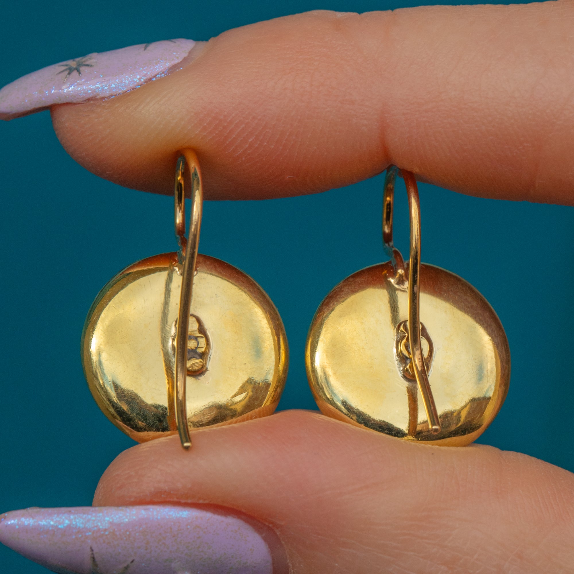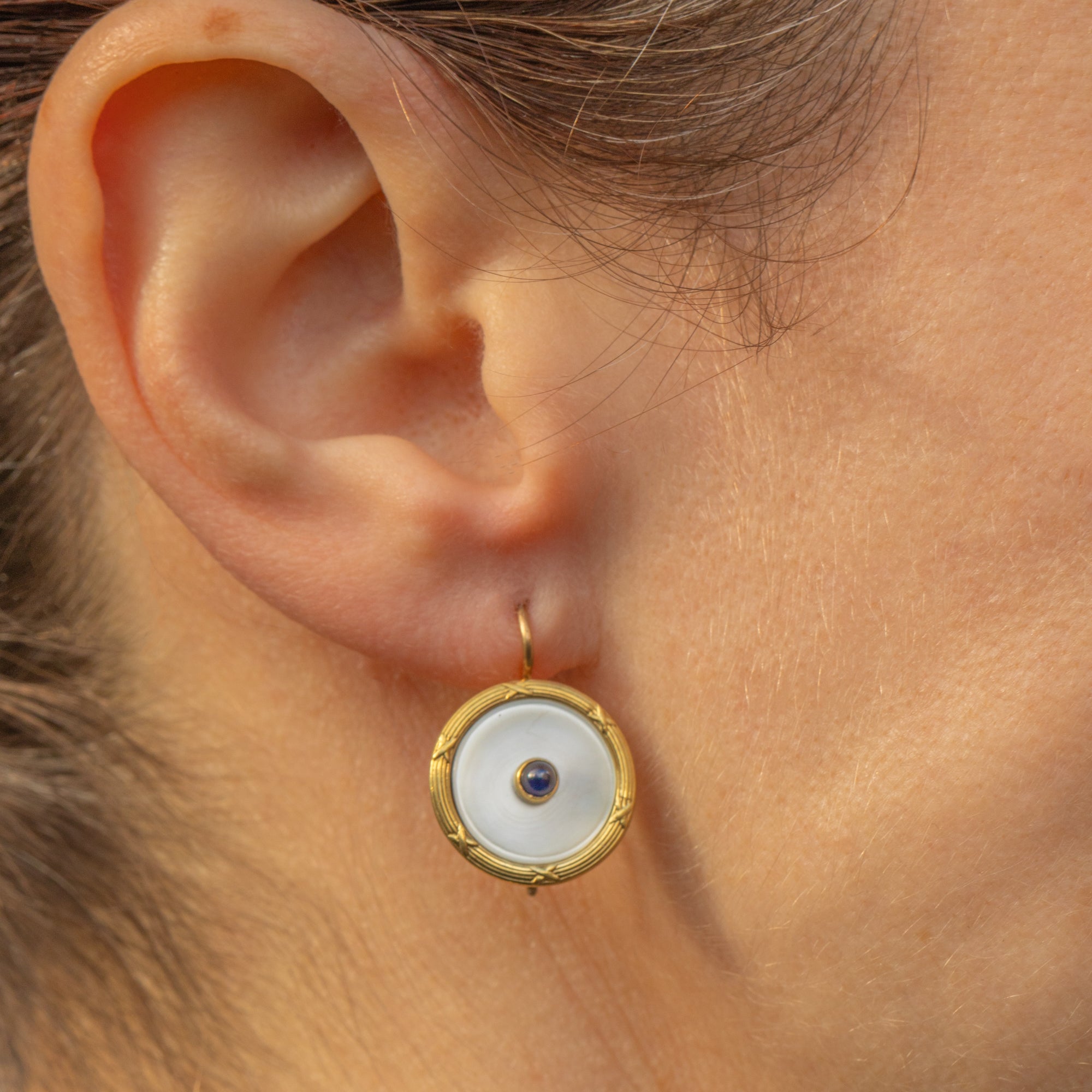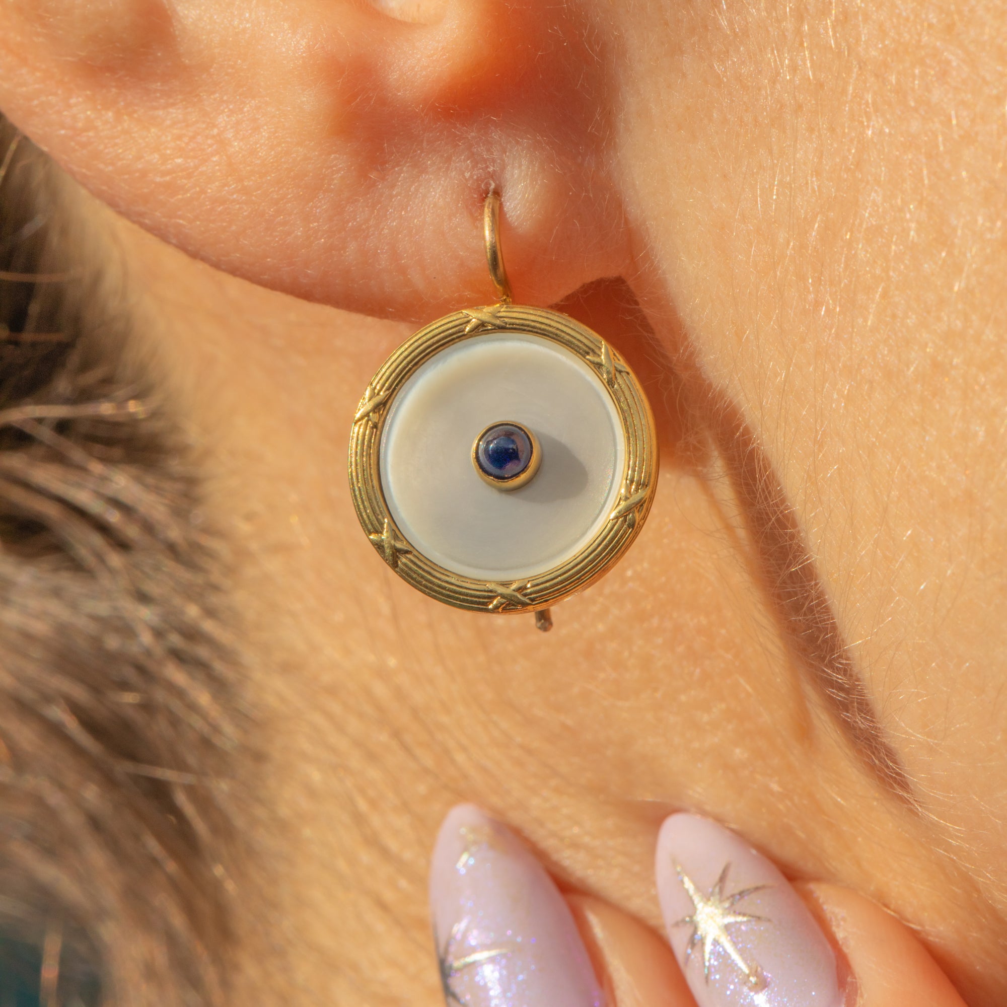 VERY GOOD. A fabulous pair of Edwardian 18ct Gold Mother of Pearl Sapphire button earrings! The earrings have very little signs of age, the only thing to note is that these earrings were likely once buttons, so there is a slight sign of conversion to the back but this is not visible when you wear them. The gems are all securely set and free from surface wear and the slender hooks are comfortable to wear!
