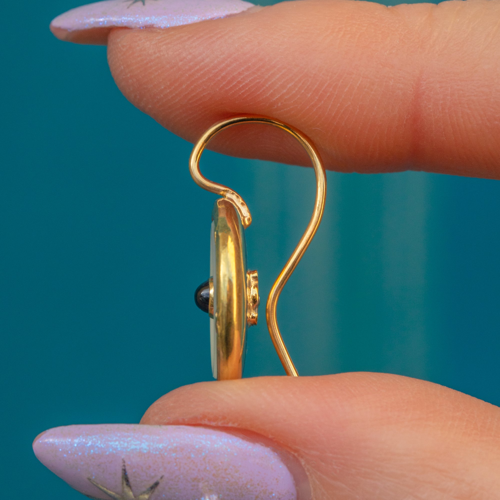 MATERIALS: Tests as 18ct Gold, 15ct Gold Hooks, Mother of Pearl, Sapphire cabochon.