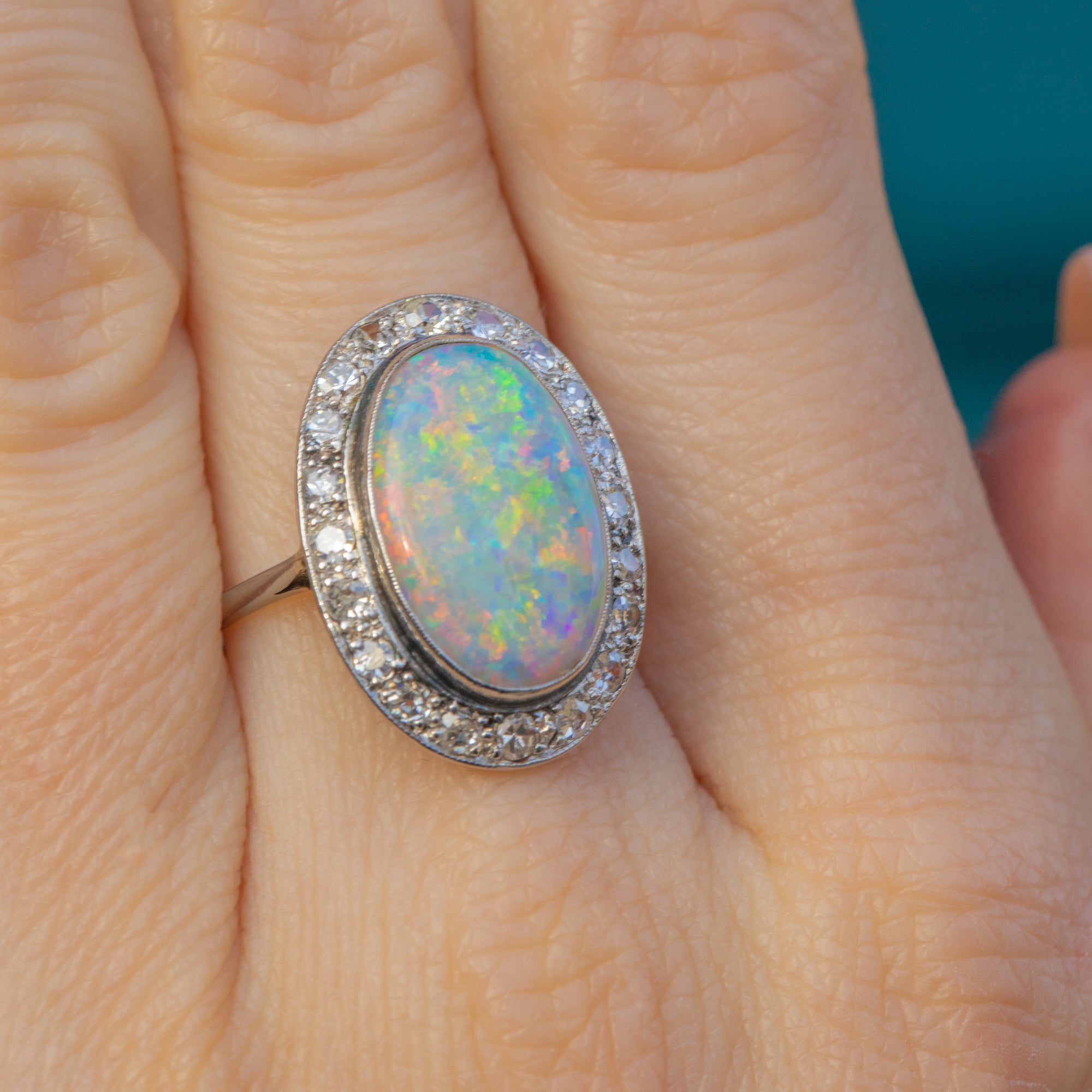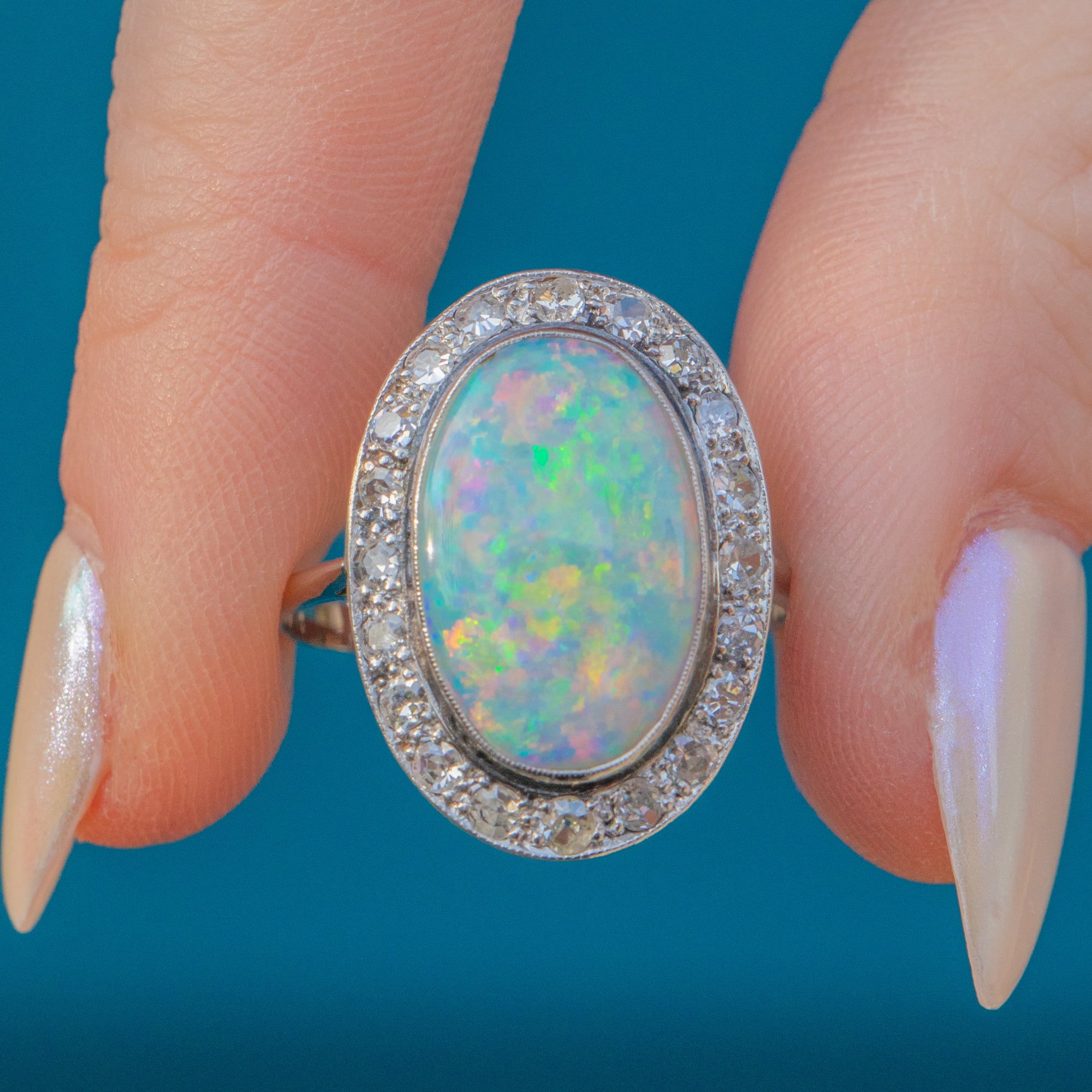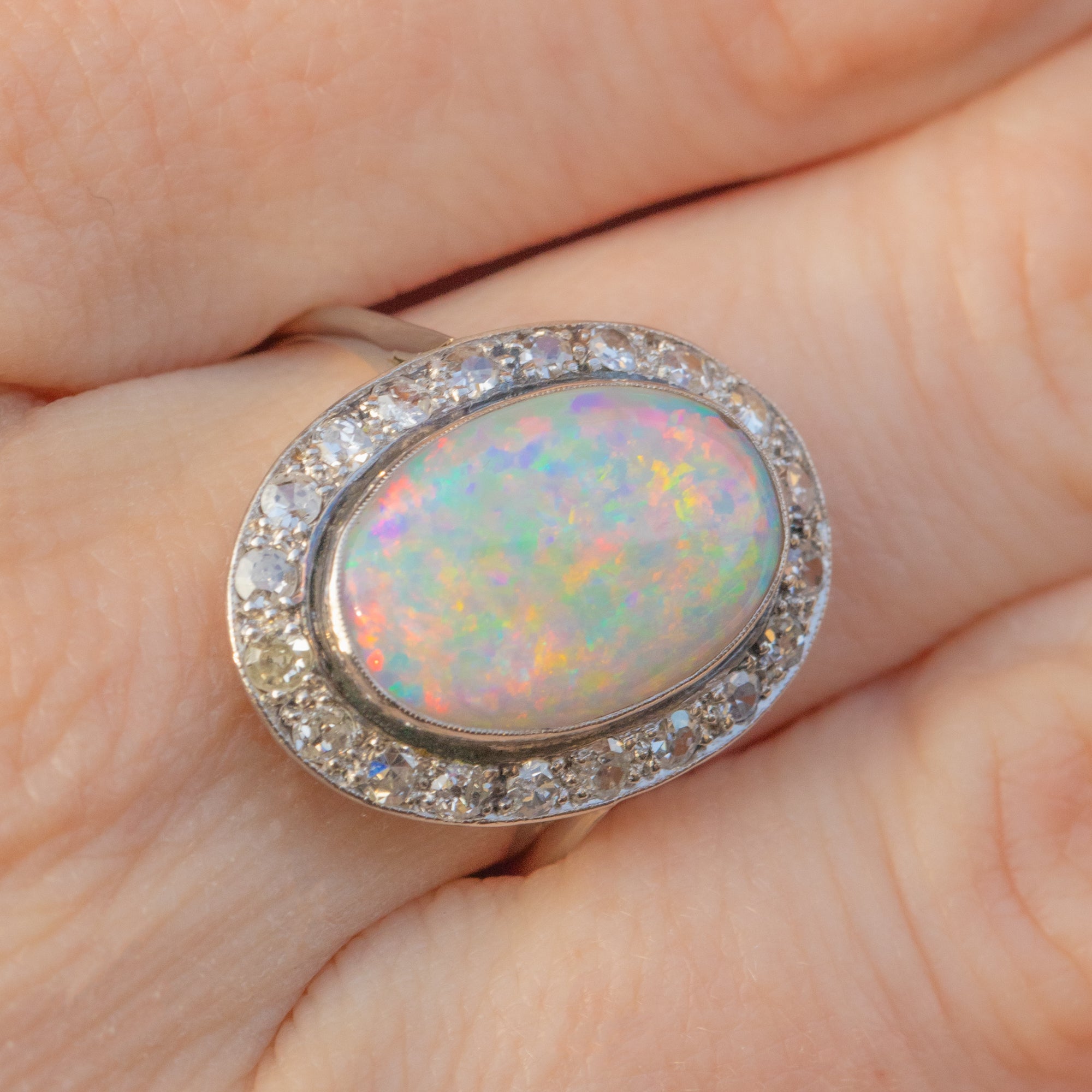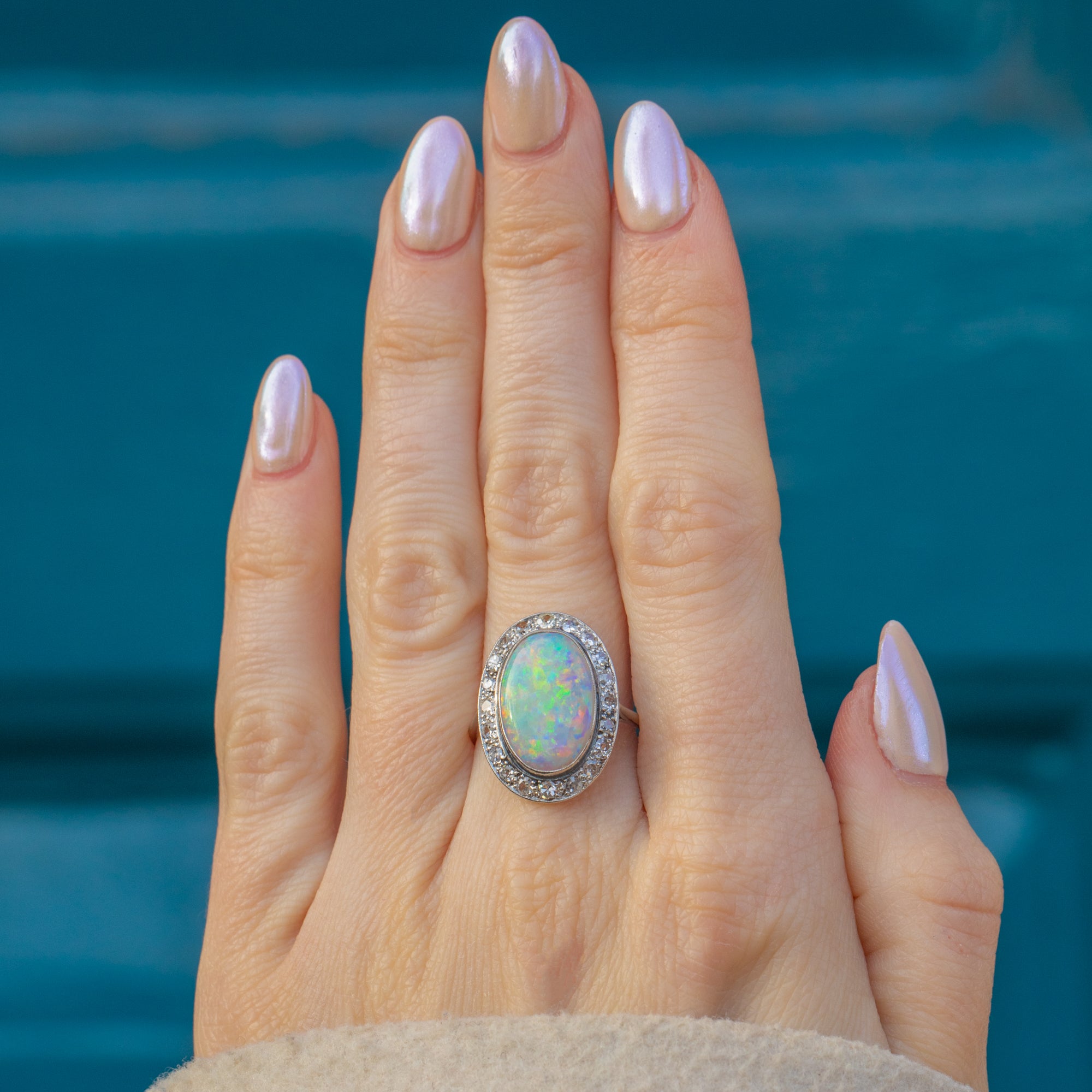 Edwardian 18ct Gold Natural Opal Diamond Oval Cluster Ring