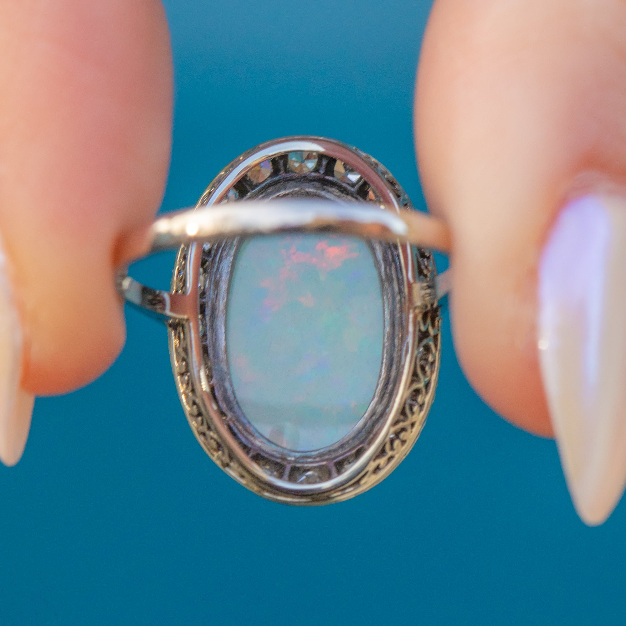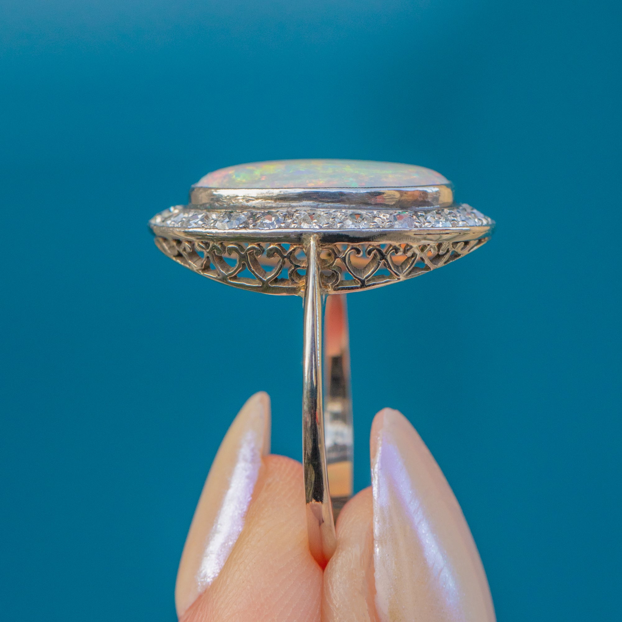 Embodying antique elegance and sophistication, this exquisite Edwardian 18ct White Gold Opal Diamond ring will quench your desire for all things luxury. With plenty of fire, her stunning 1.00ct natural solid Opal boasts a confetti display of blues, greens, and oranges to feast your eyes on!