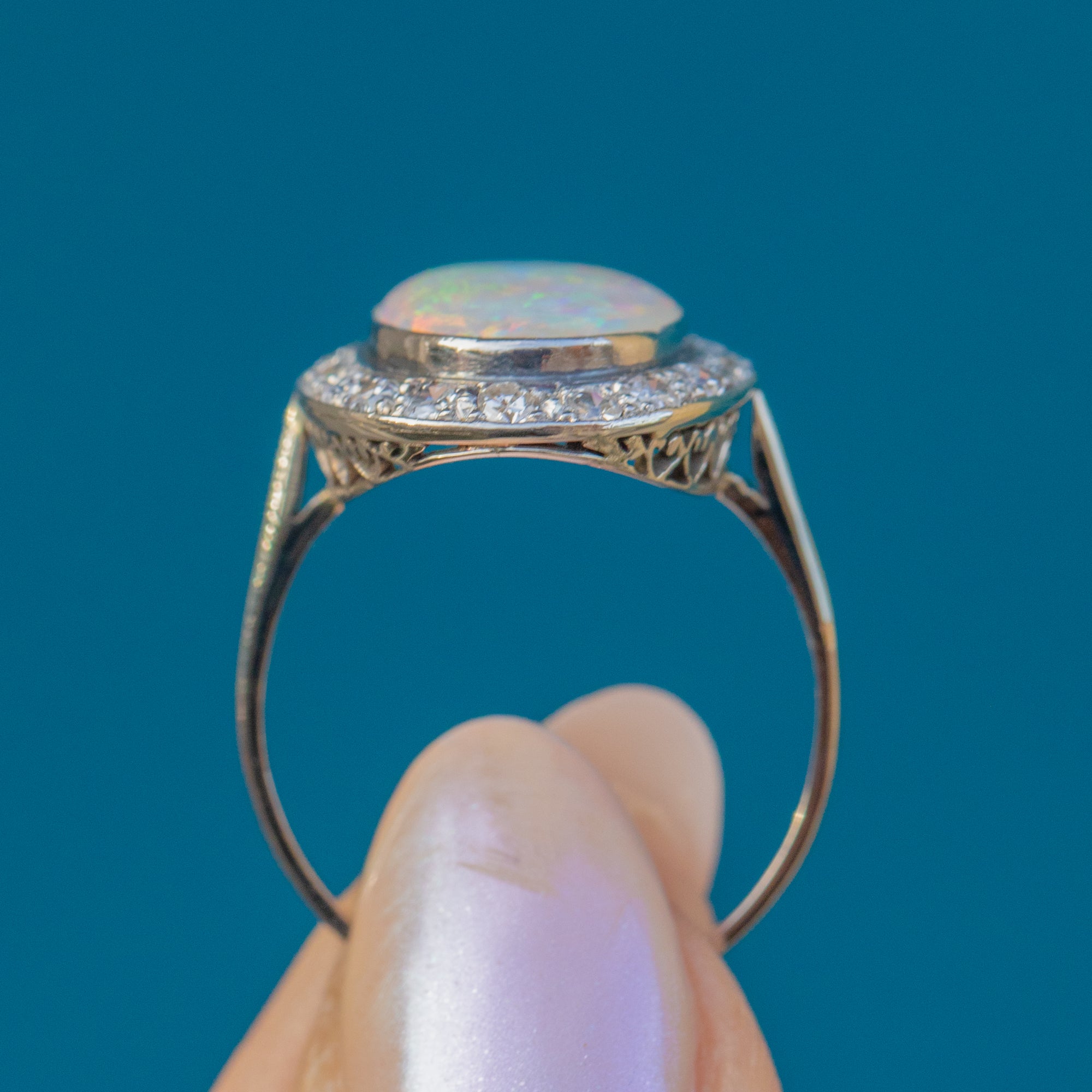 EXCELLENT: This antique 18ct Gold Opal Diamond ring is in excellent condition. The Opal is securely set and free from any scuffs or surface wear. The Diamonds are gorgeous and sparkle beautifully. With little else to note, she is in wonderful condition!