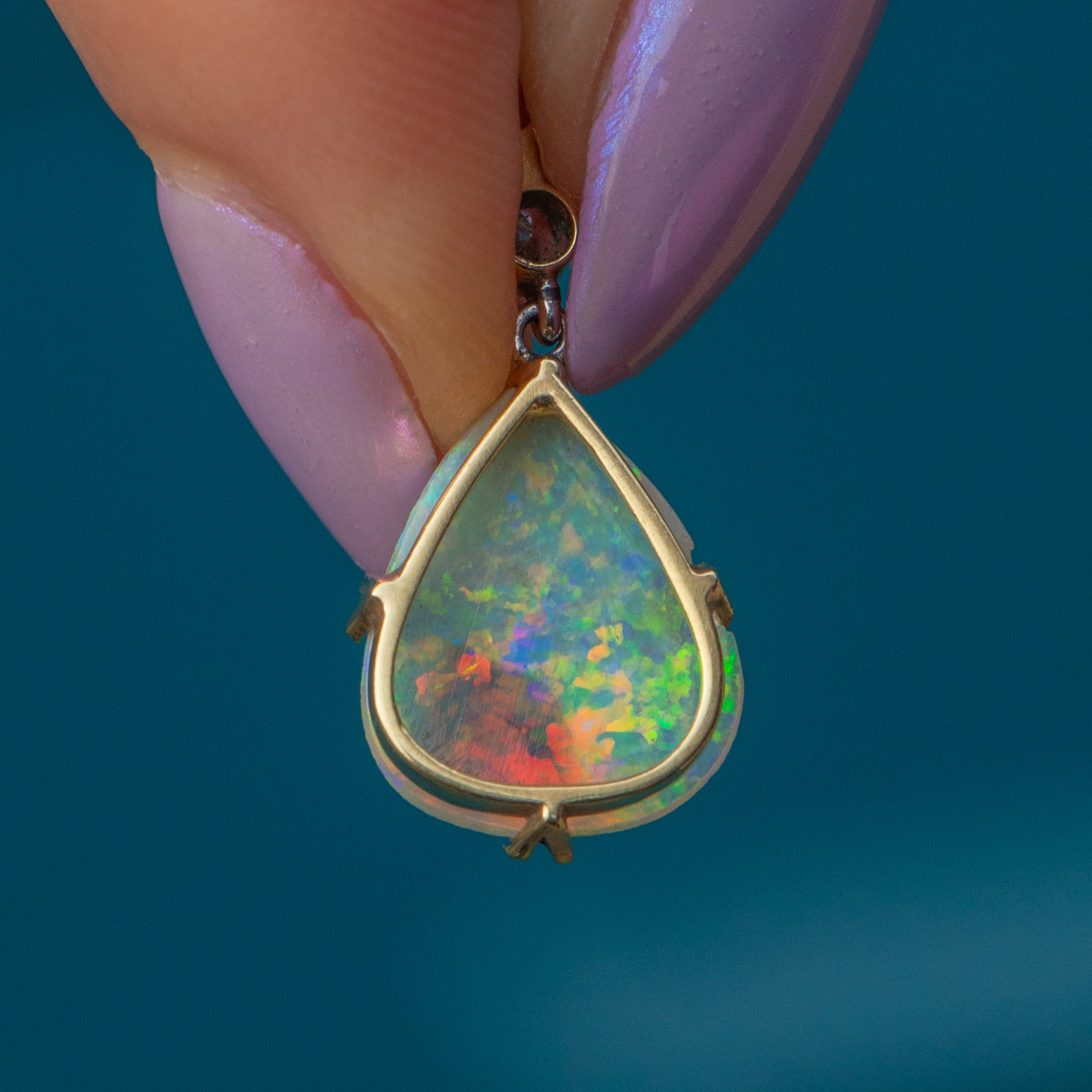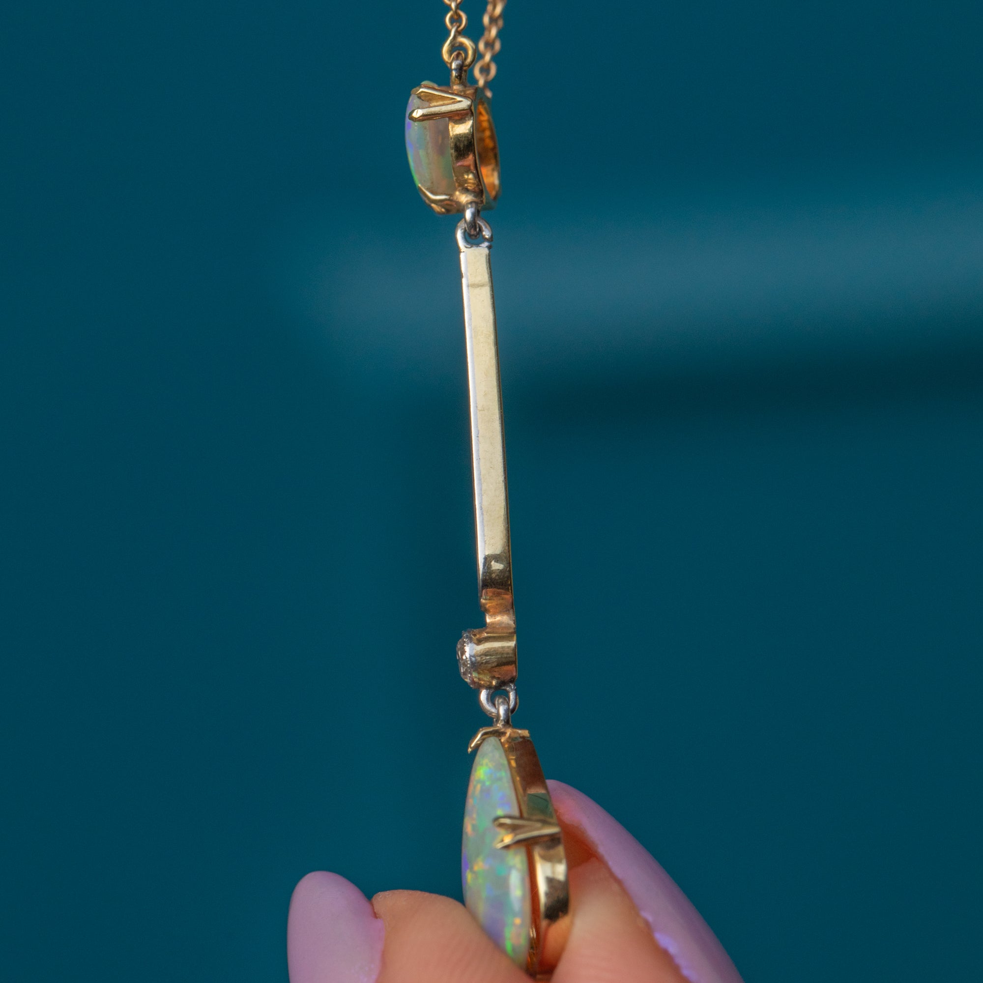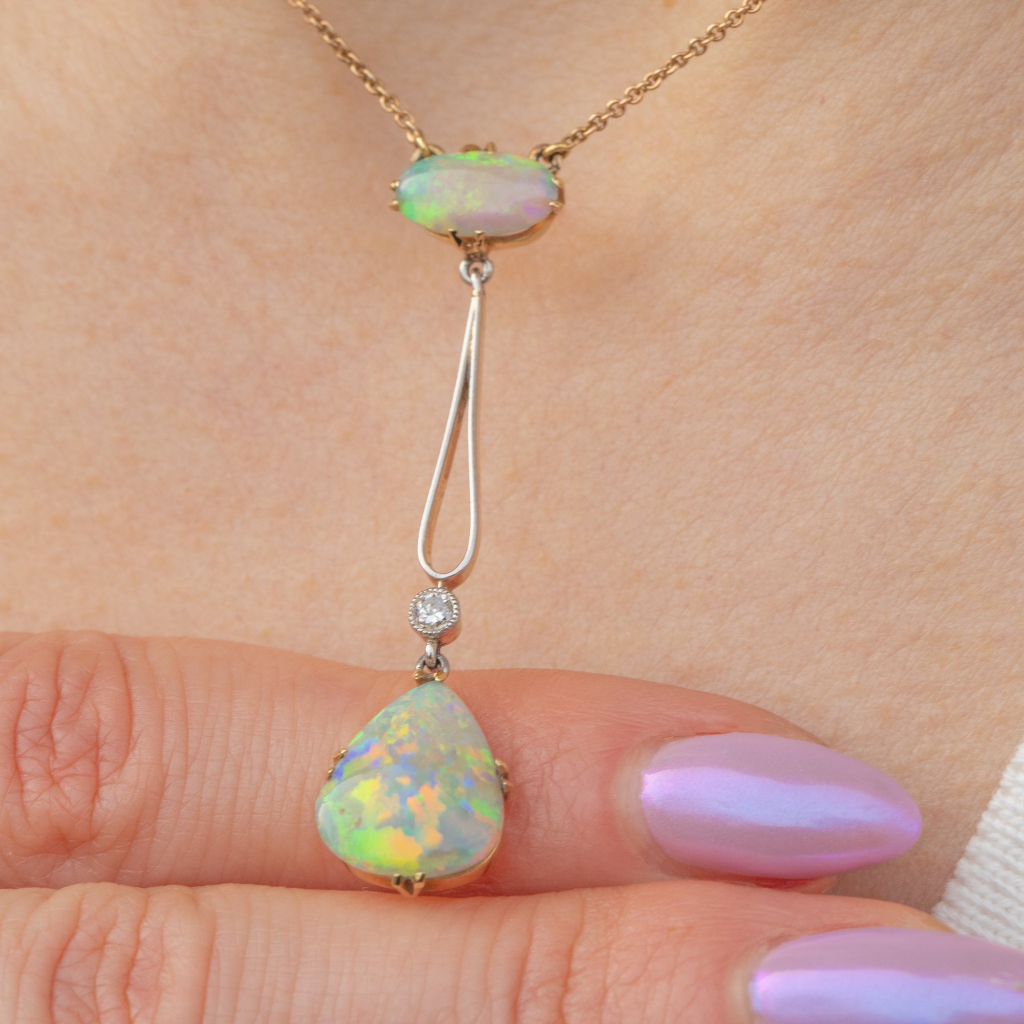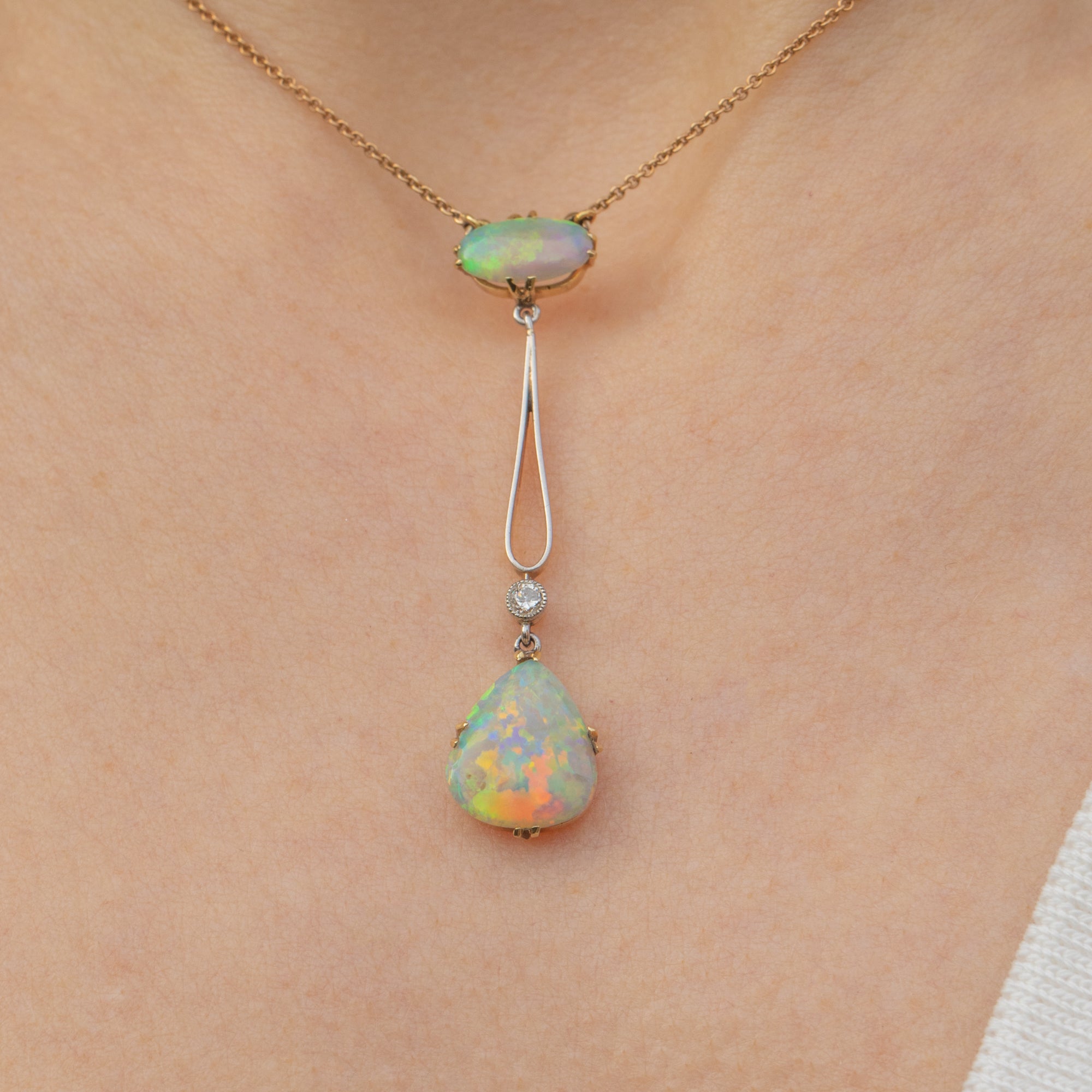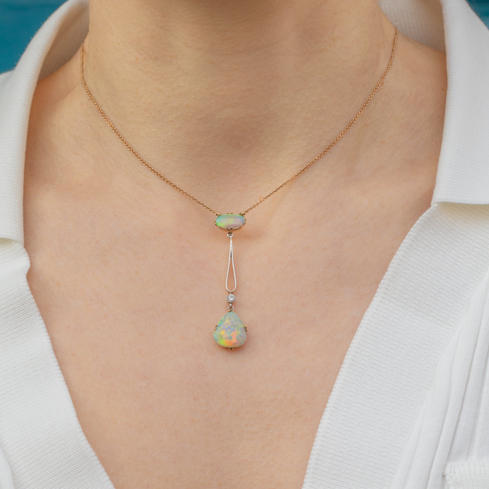 The large teardrop Opal is suspended from a Gold bar drop with Platinum detailing, giving this antique necklace a lovely fluidity. Her scintillating Diamond marries perfectly with the galactic spectrum of her Opals, making for the most splendorous combination.
