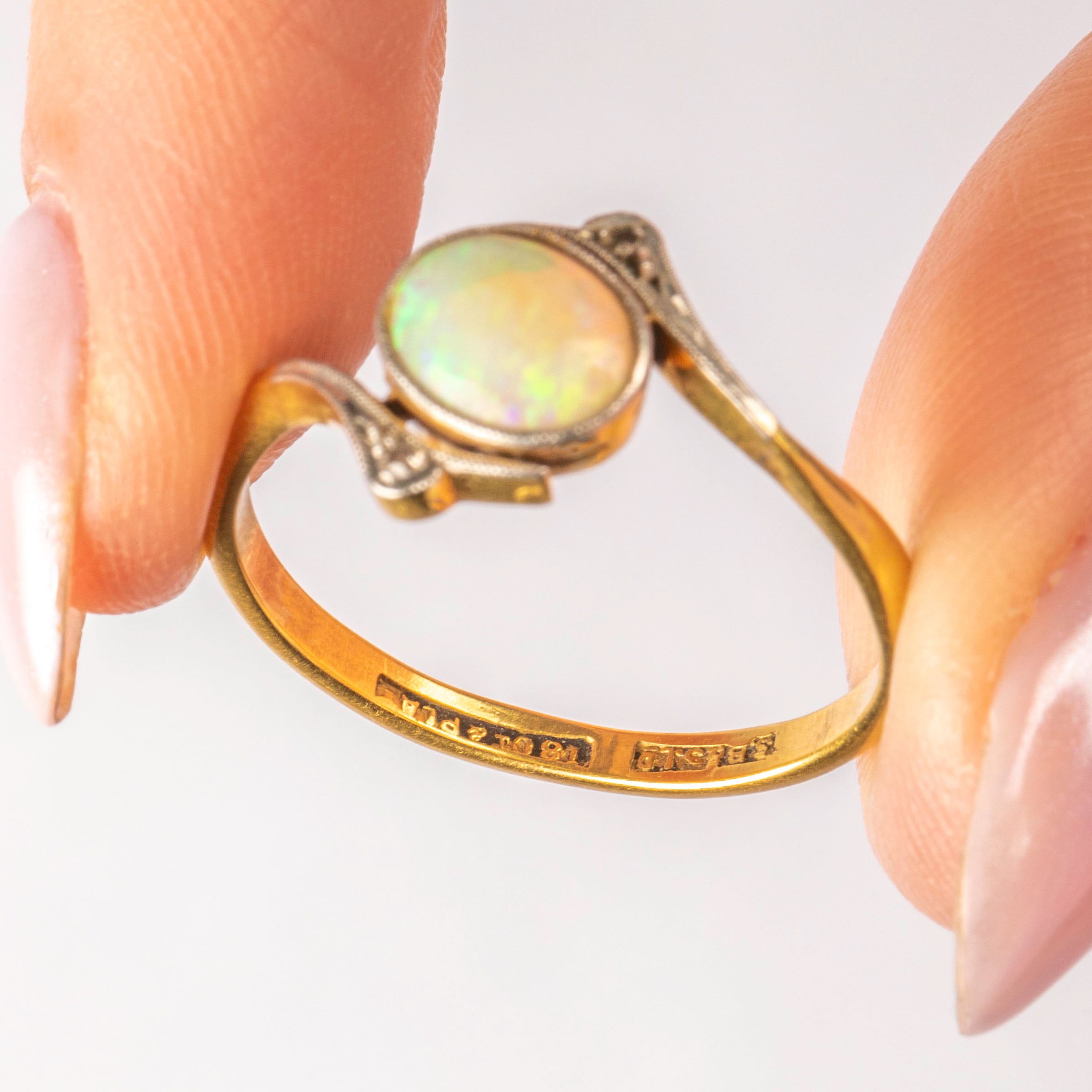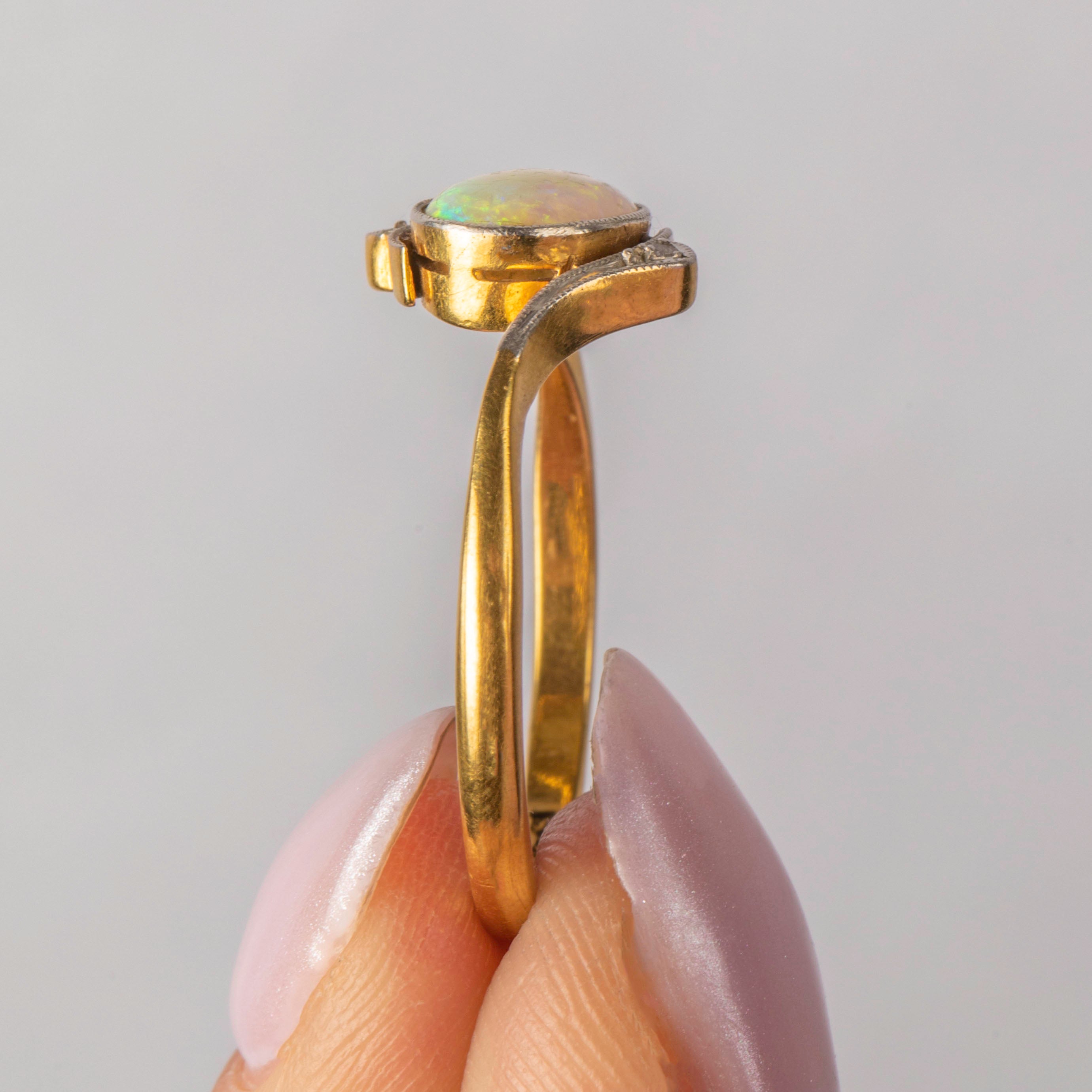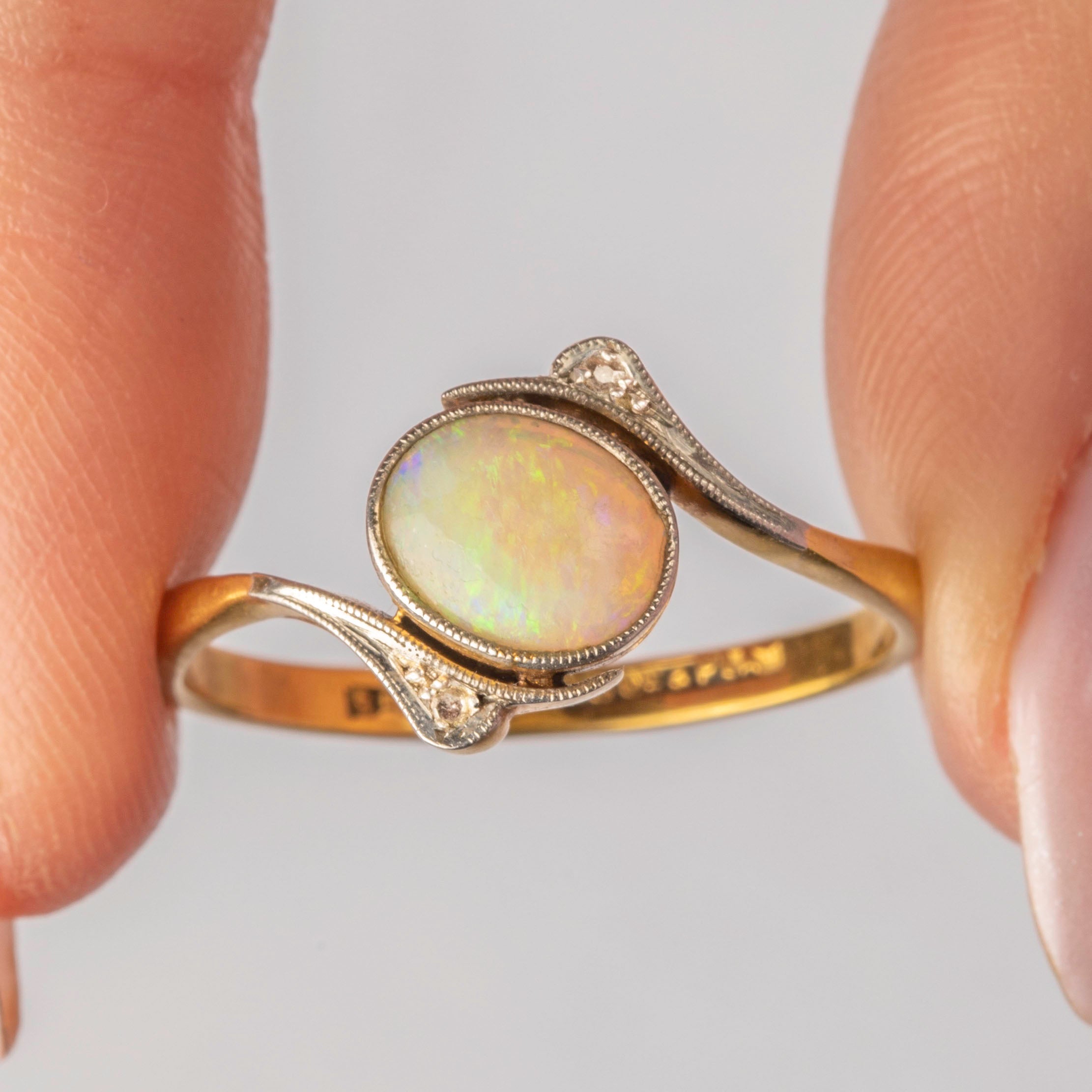 EXCELLENT. This Edwardian 18ct Gold Opal Diamond Twist Ring is in excellent condition. Her gorgeous Opal is beautifully smooth, with no fleabites or dents to note. Her Diamonds are securely set in their platinum setting which has retained it's fabulous brilliant tone over the years. Her 18ct Gold is lustrous and deep, she's an Edwardian delight!