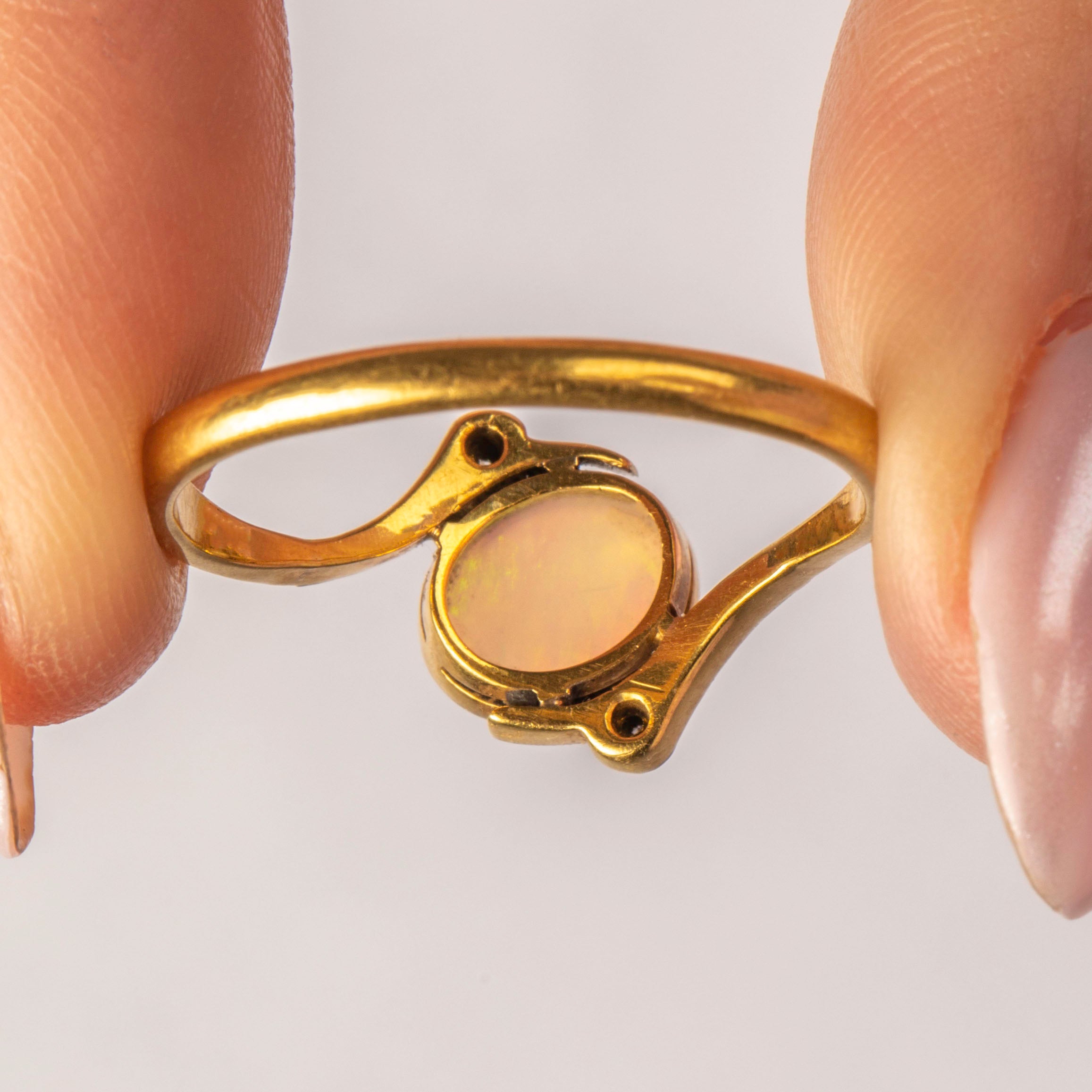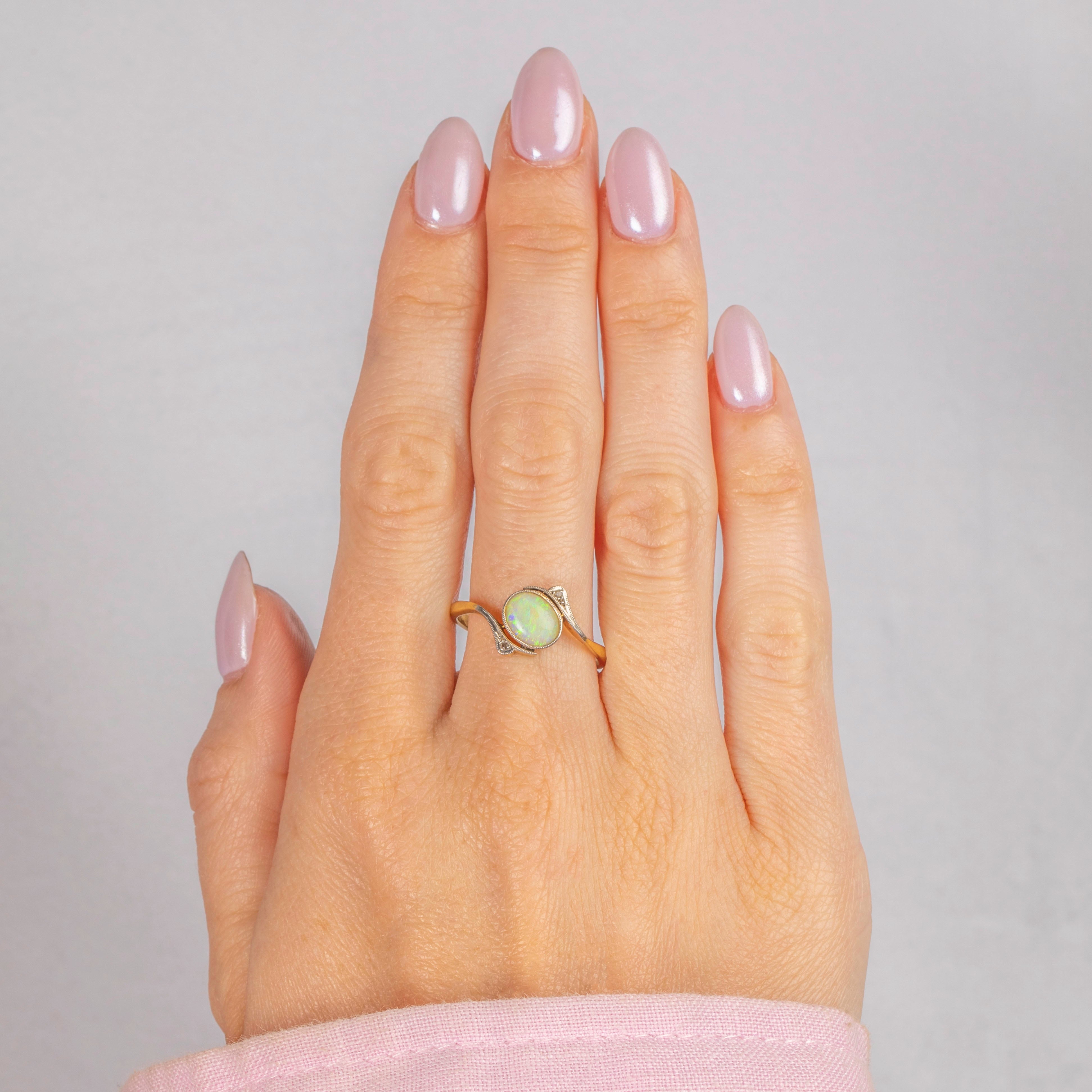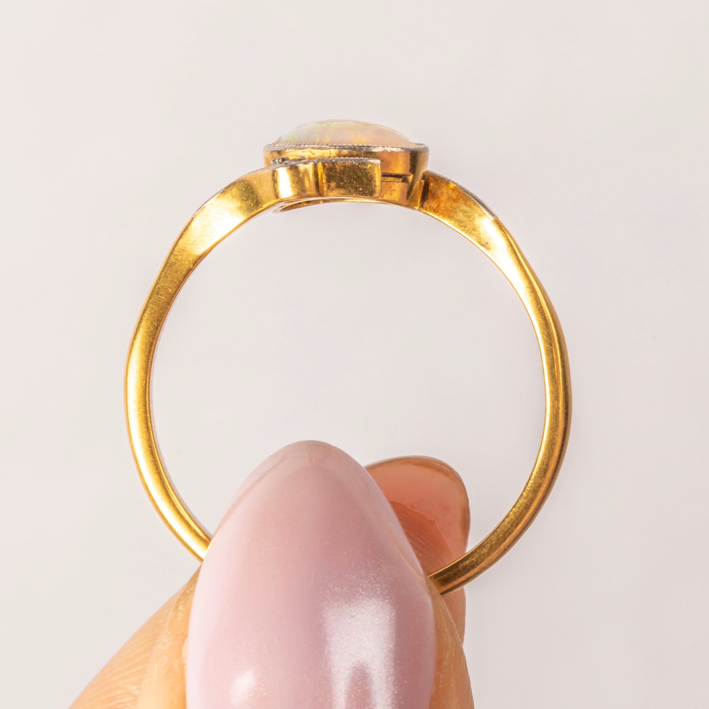 EXCELLENT. This Edwardian 18ct Gold Opal Diamond Twist Ring is in excellent condition. Her gorgeous Opal is beautifully smooth, with no fleabites or dents to note. Her Diamonds are securely set in their platinum setting which has retained it's fabulous brilliant tone over the years. Her 18ct Gold is lustrous and deep, she's an Edwardian delight!