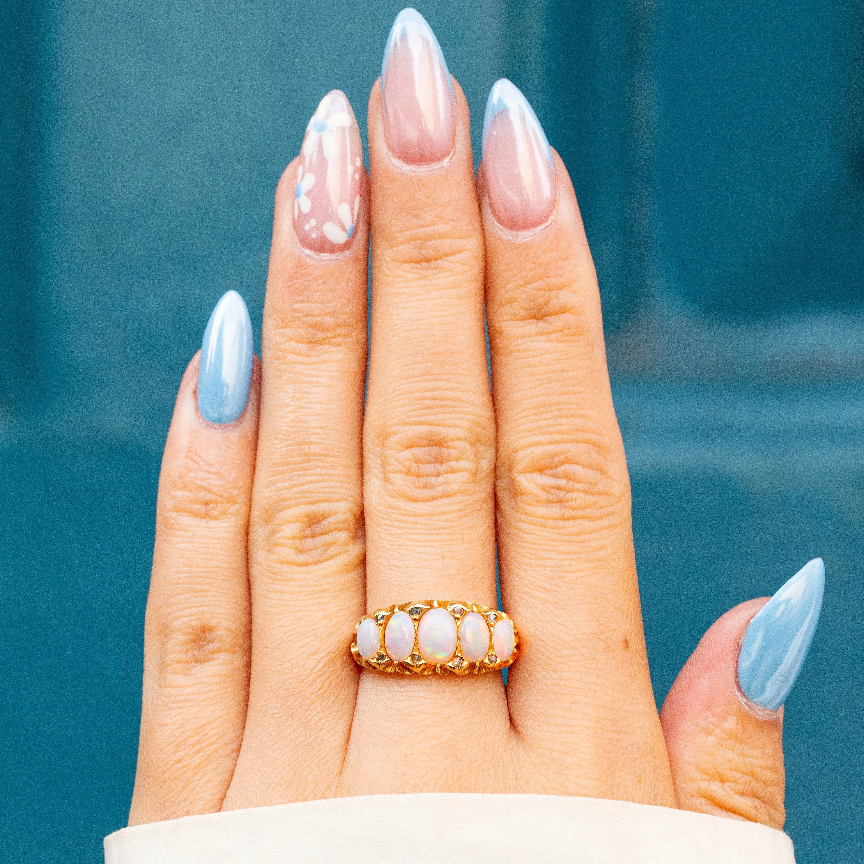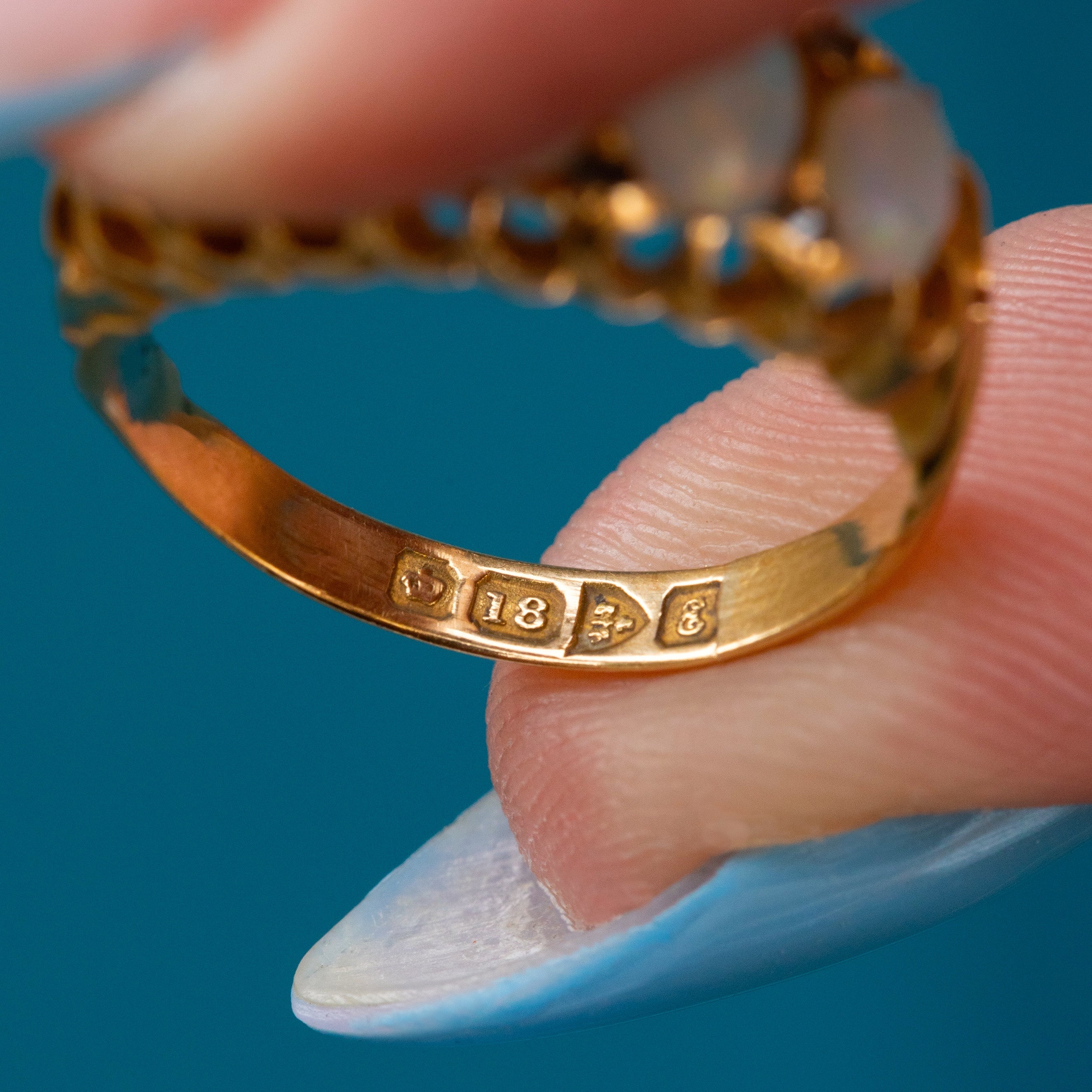 The Opals are accompanied by dainty rose-cut Diamond spacers, adding a subtle sparkling accent, all set into saturated 18ct Gold. Complete with a full set of hallmarks, including the rare Chester Assay, dating to 1905, this Edwardian Opal ring is a fine investment piece!