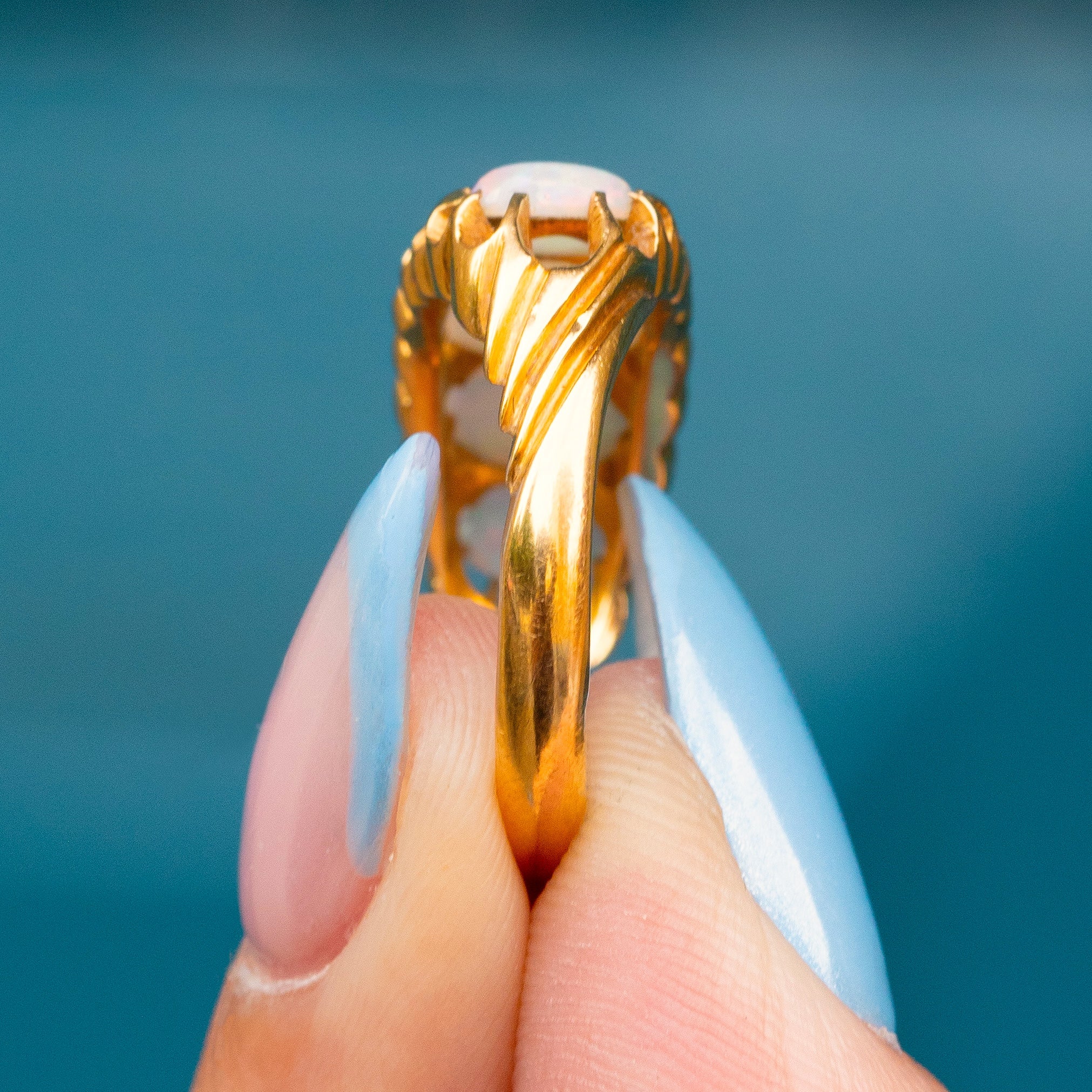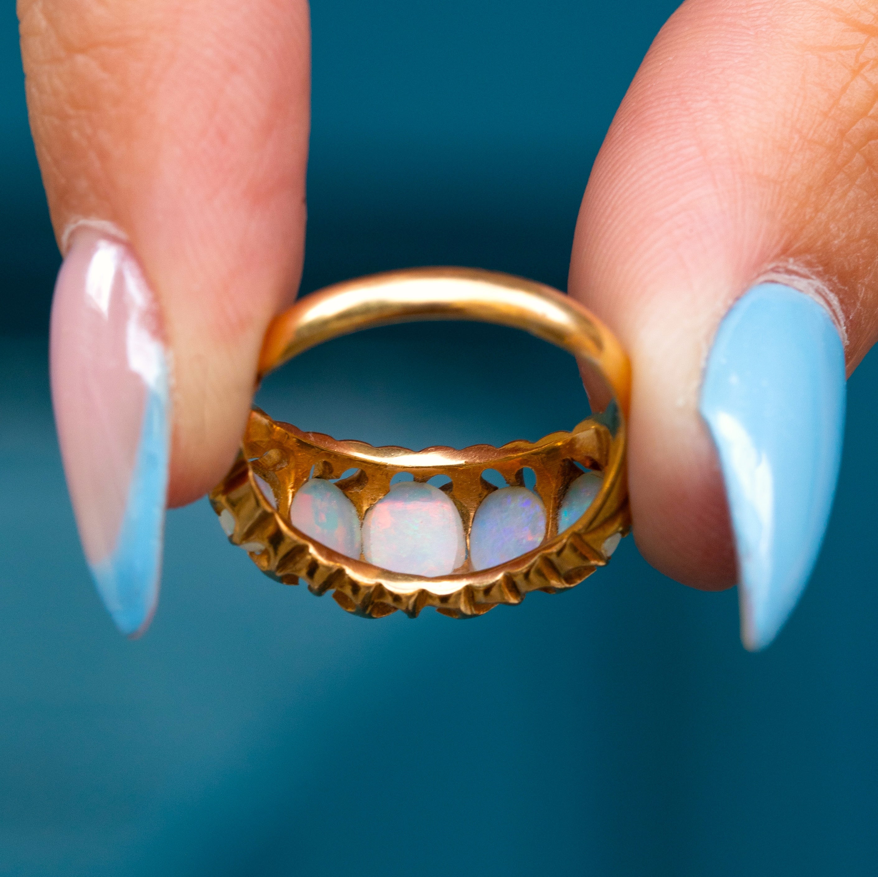 This enchanting antique Opal ring will look resplendent adorning your hand! The five zingy Opal cabochons span the width of the finger, providing exceptional finger coverage, each one bursting with a confetti display of colours across their lilac cores.