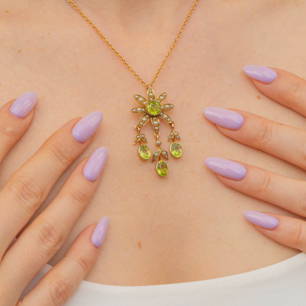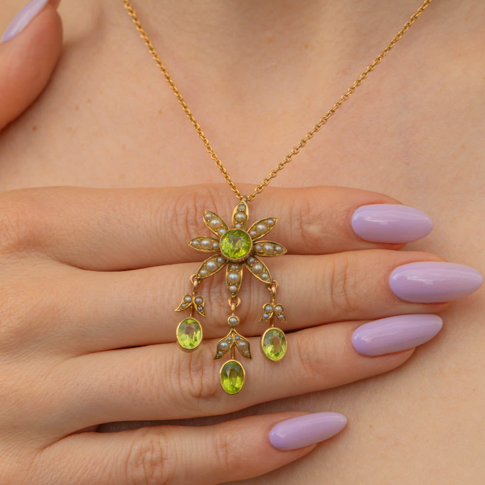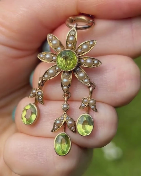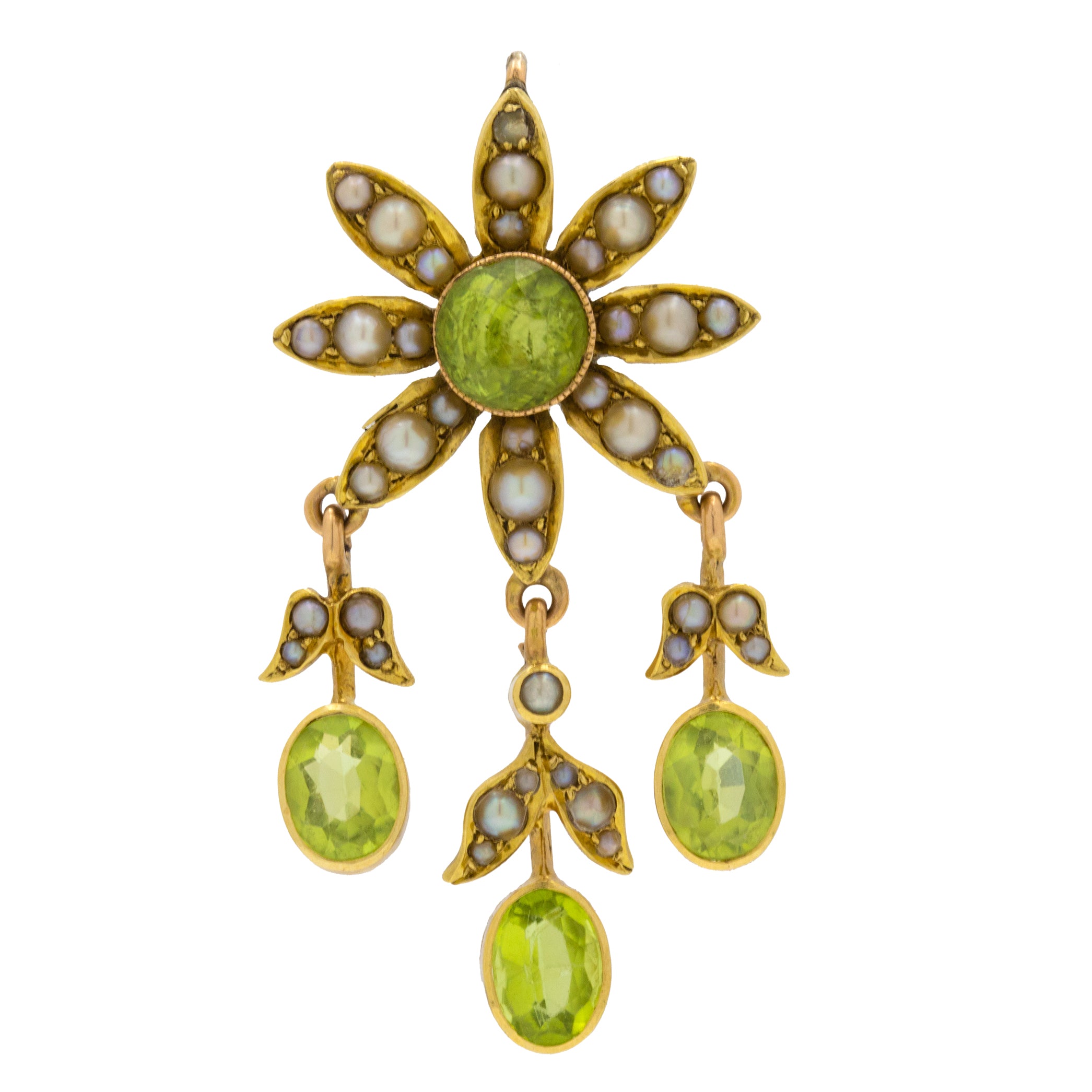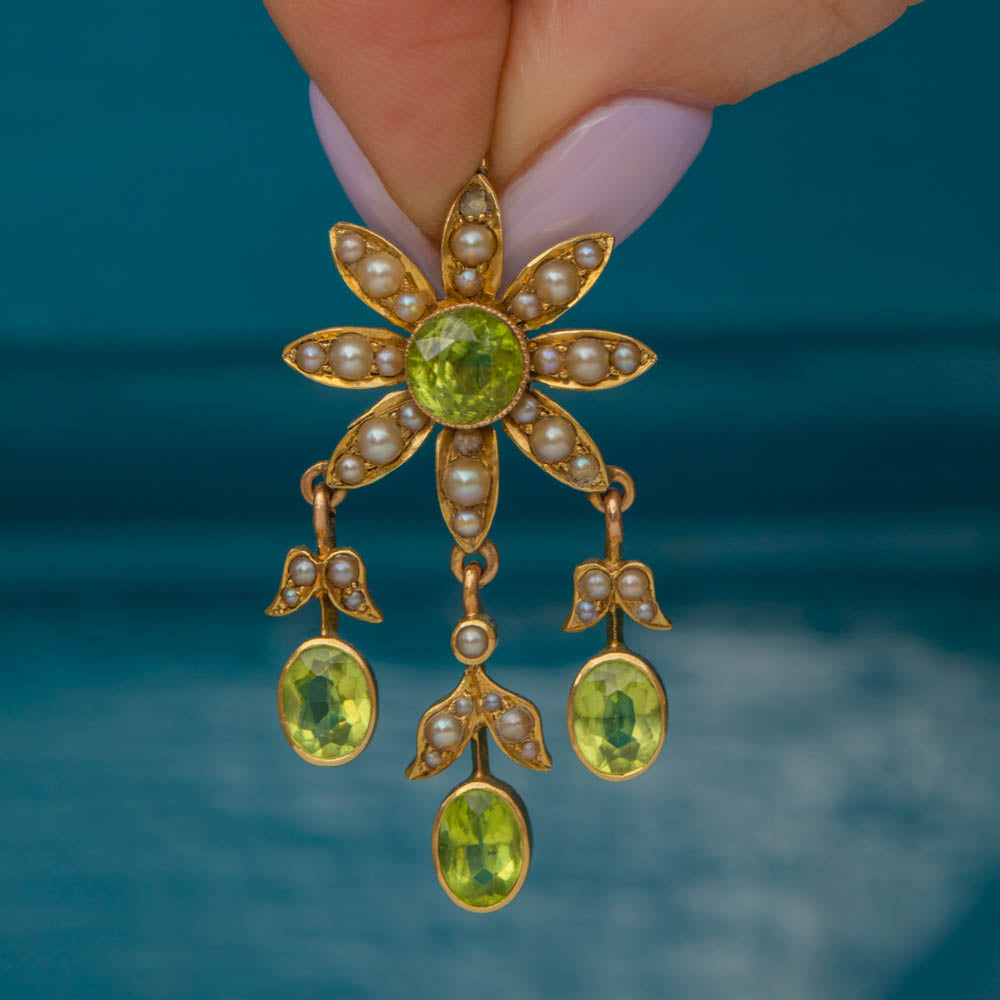 This Edwardian 18ct Gold Peridot Pearl flower drop pendant is like a breath of fresh air! The combination of Peridot and Pearls makes for an opulent combination, with the soft shimmer of the Pearls offsetting perfectly against the zingy hues of her Peridot.