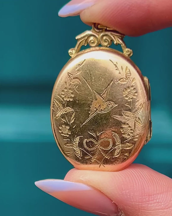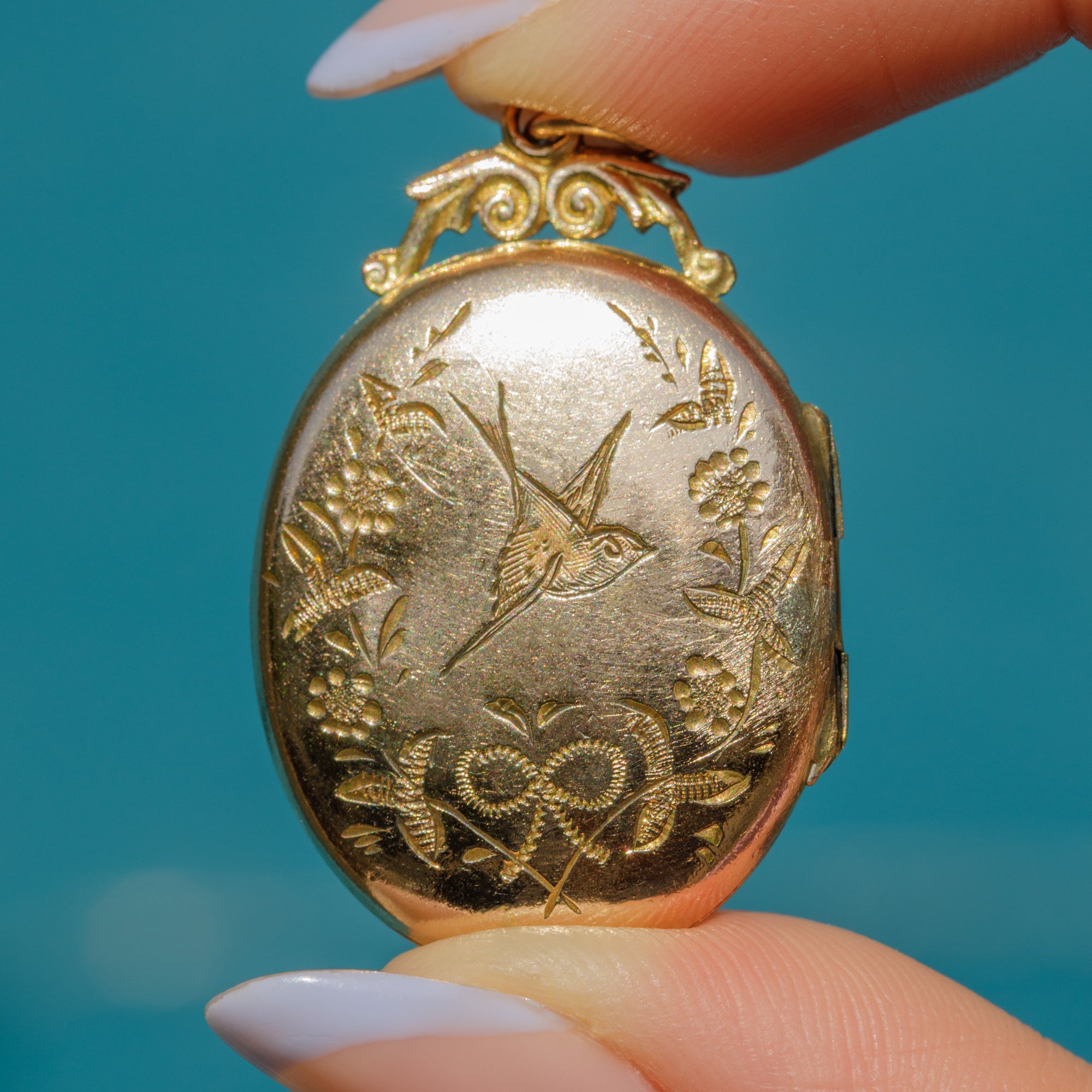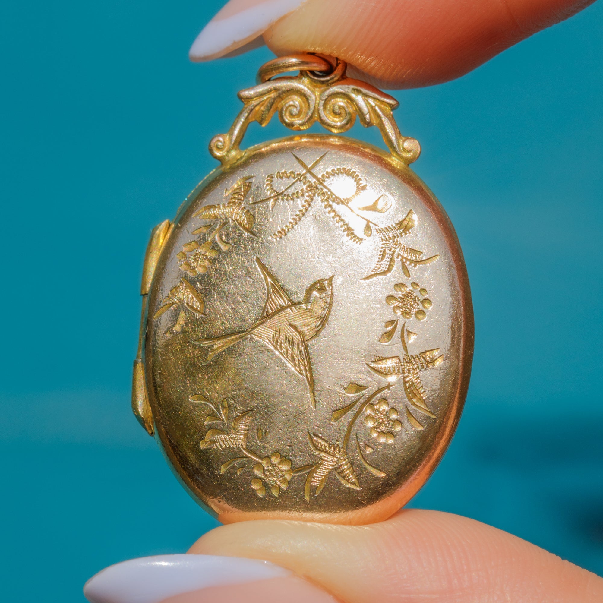 Edwardian 9ct Gold Engraved Oval Locket, Swallow & Floral Motif