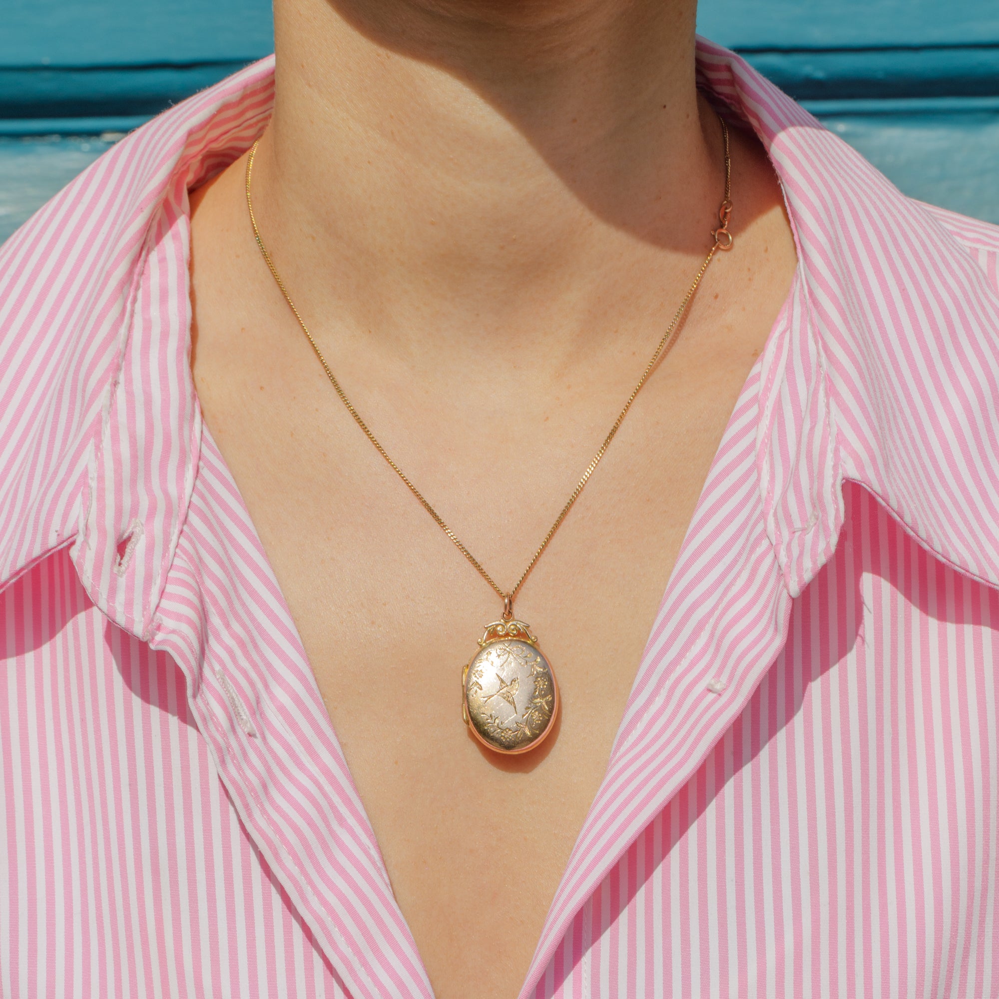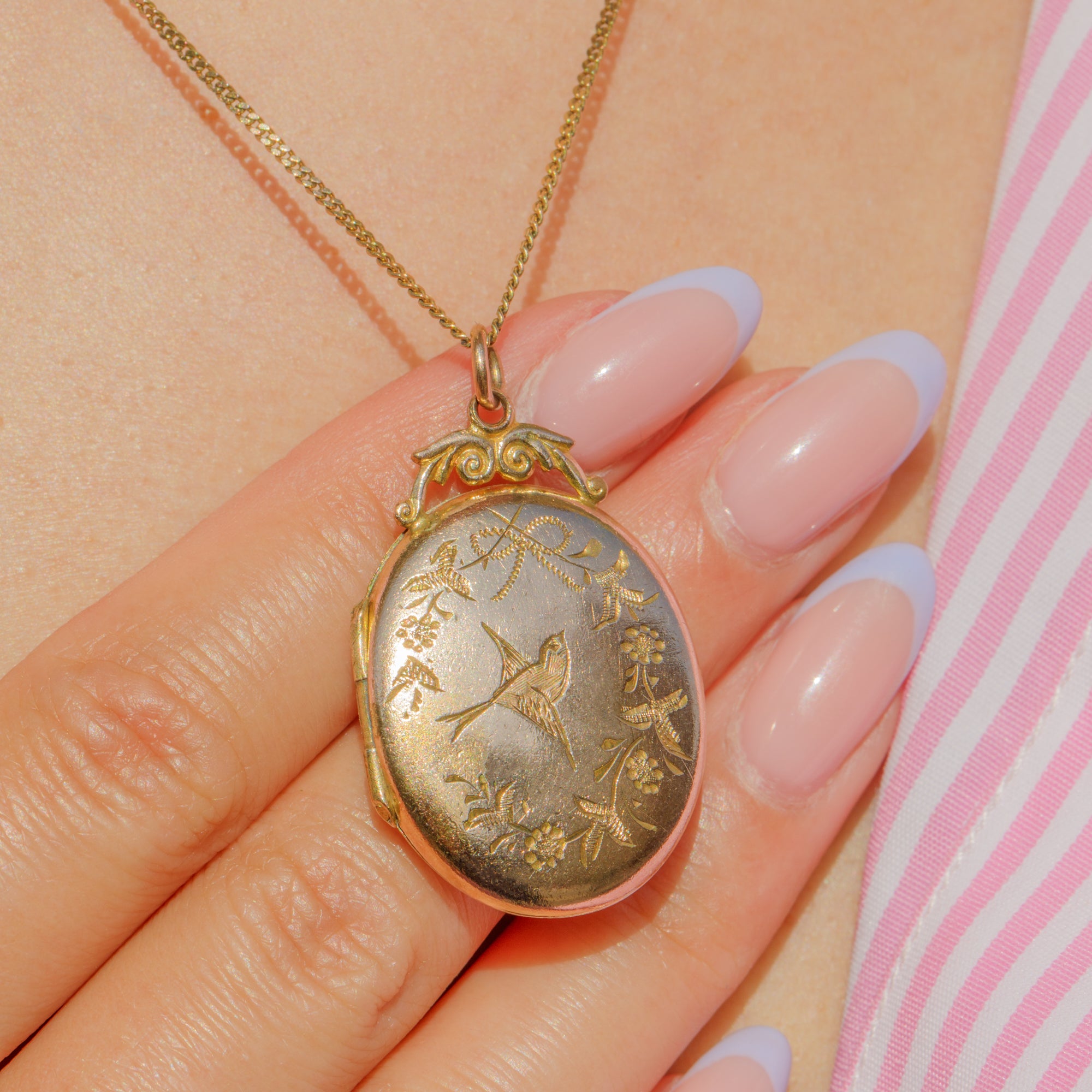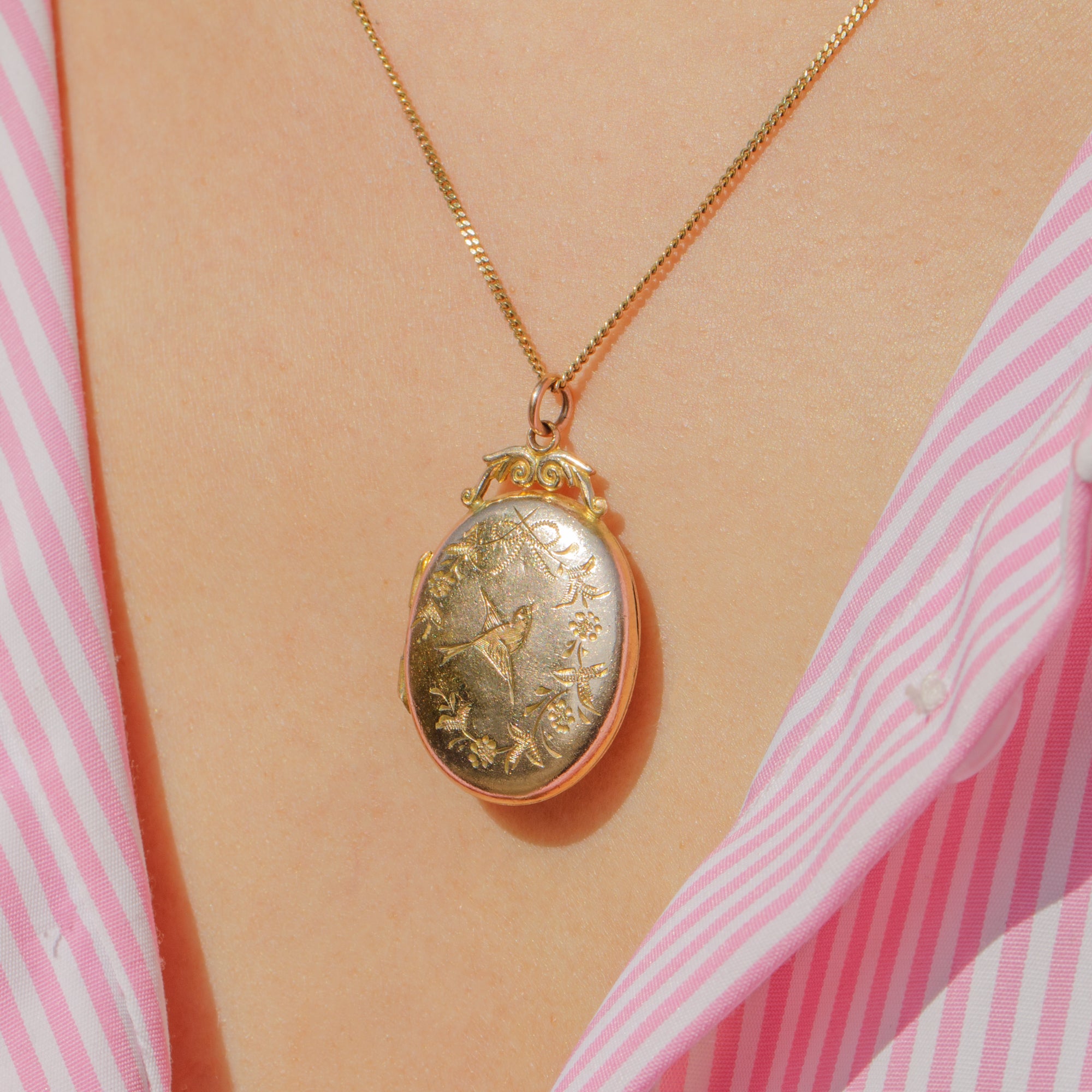 Edwardian 9ct Gold Engraved Oval Locket, Swallow & Floral Motif