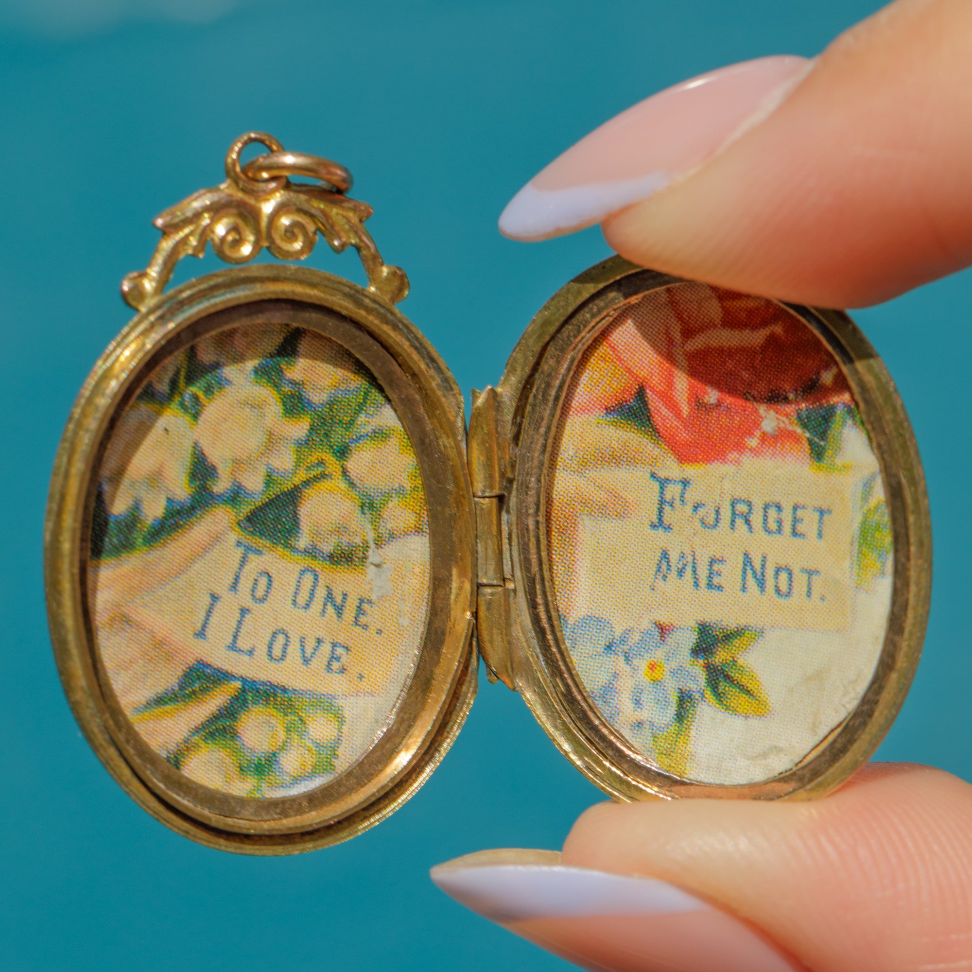 She is complete with an ornately crafted bale and opens to reveal two doors, with a gorgeous printed 'To One, I love, Forget me not' backing. This Edwardian locket is a beautiful piece to keep close to your heart!