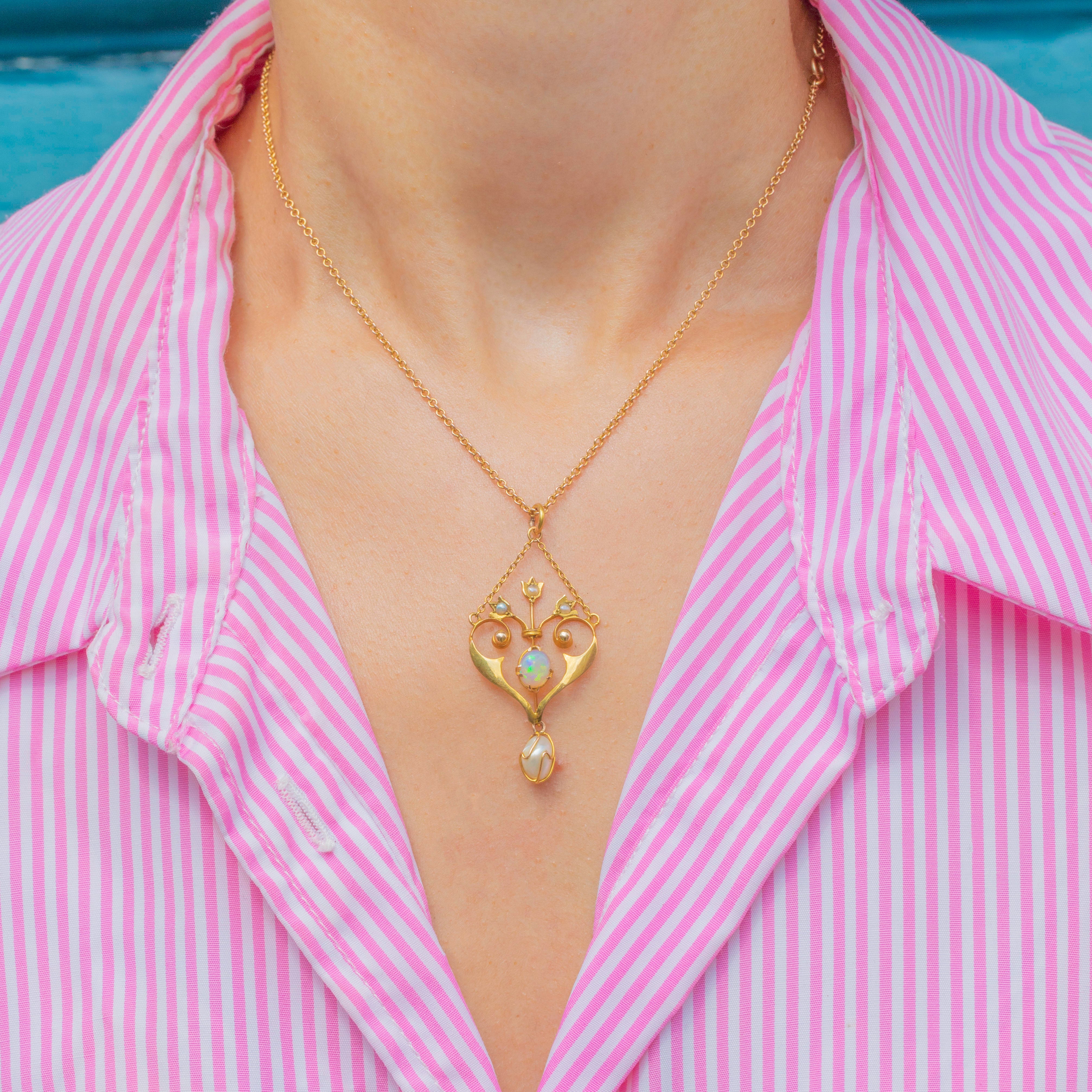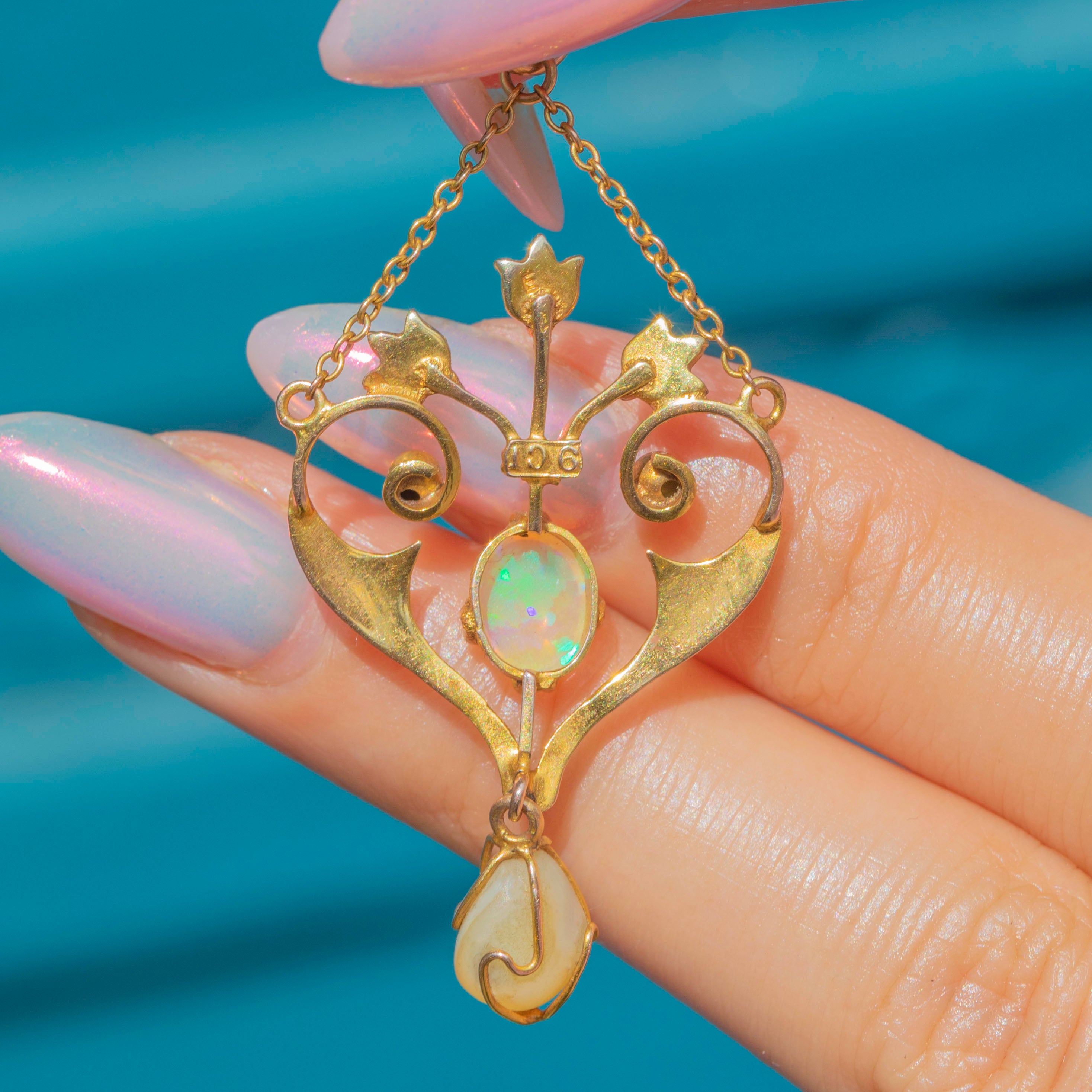 The 0.42ct Opal cabochon shimmers with an enchanting play-of-colour and is framed by sweeping, curvaceous lines, giving this Edwardian pendant a feminine appeal. The Opal is crowned by foliate details studded with dainty Seed Pearls, and the base of the pendant suspends a Baroque Pearl, providing a lovely sense of movement.