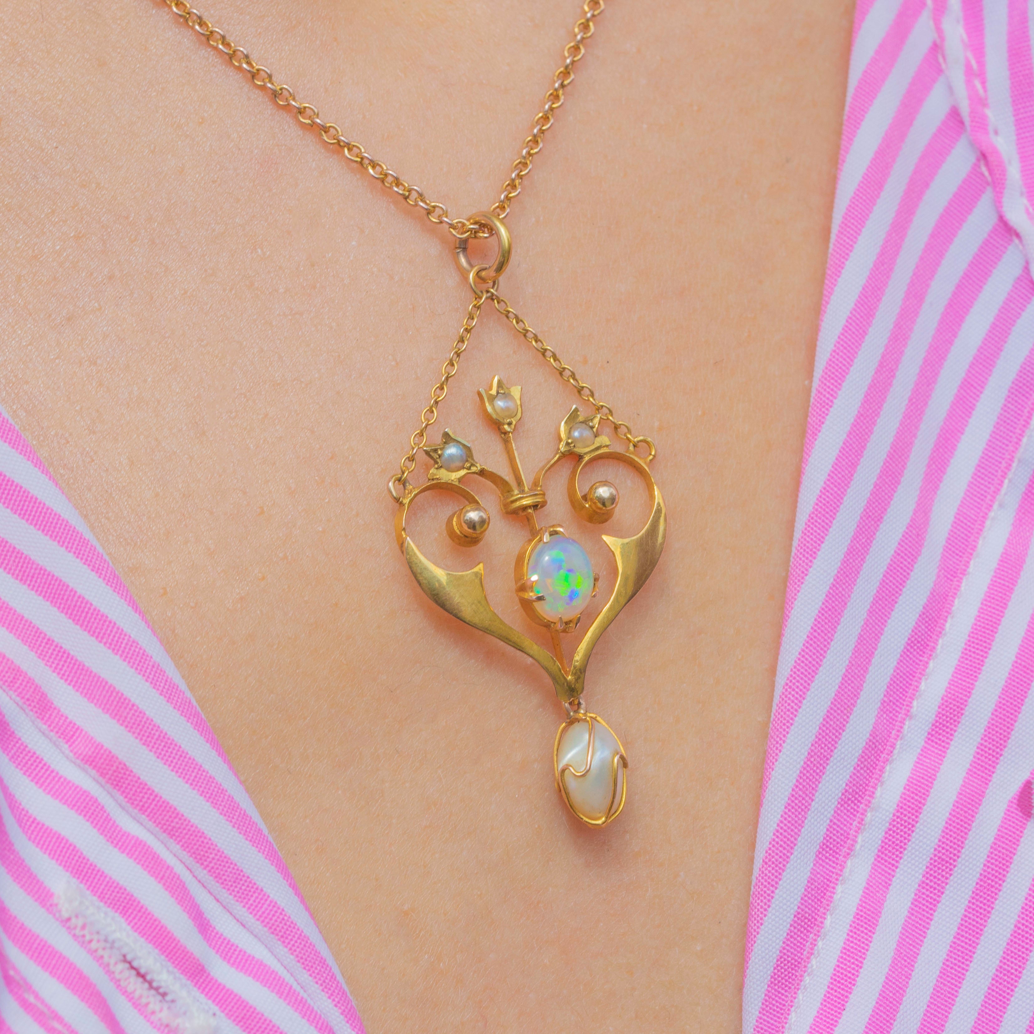 MATERIALS: Tests as 9ct Gold, Opal (0.42ct), Baroque Pearl, Seed Pearls.