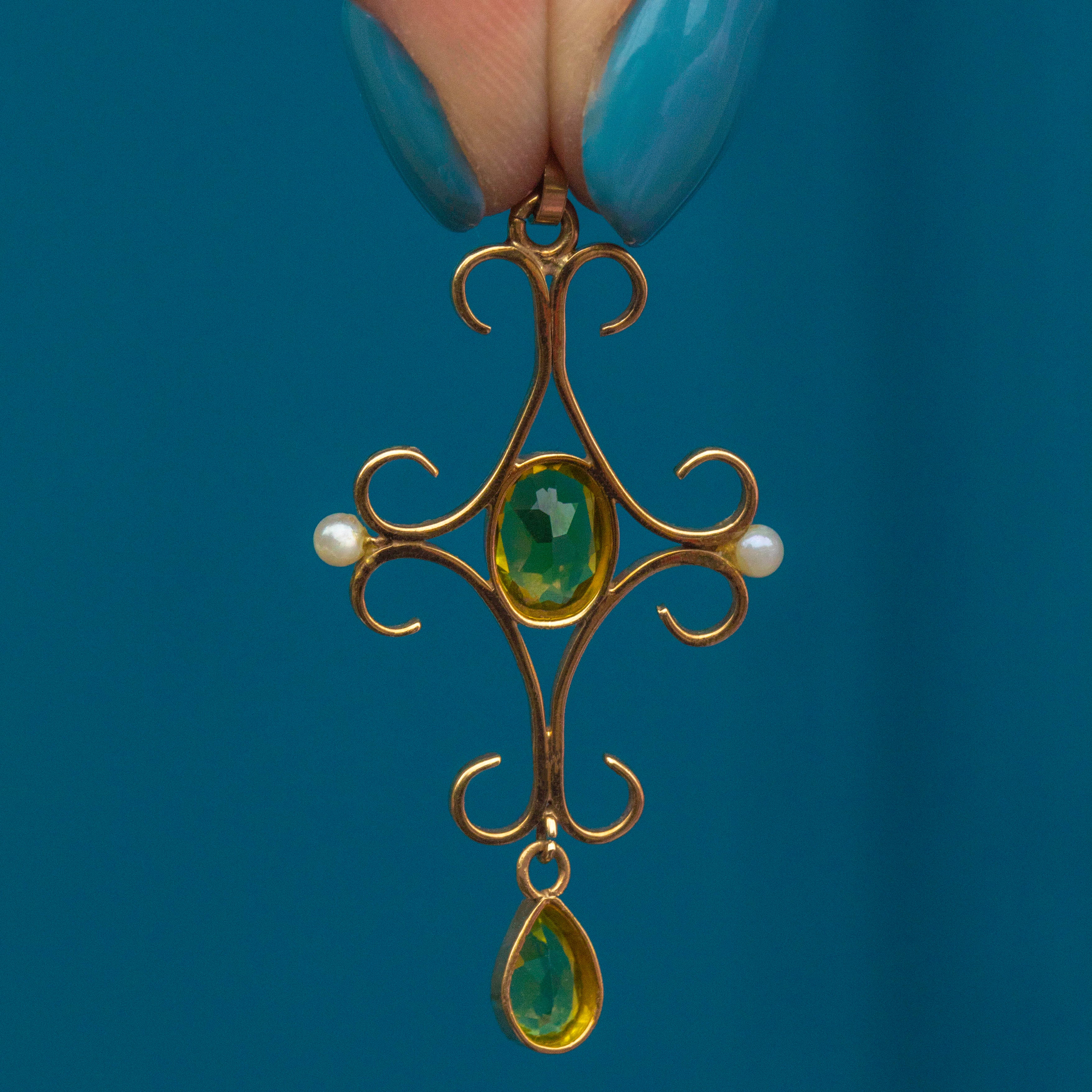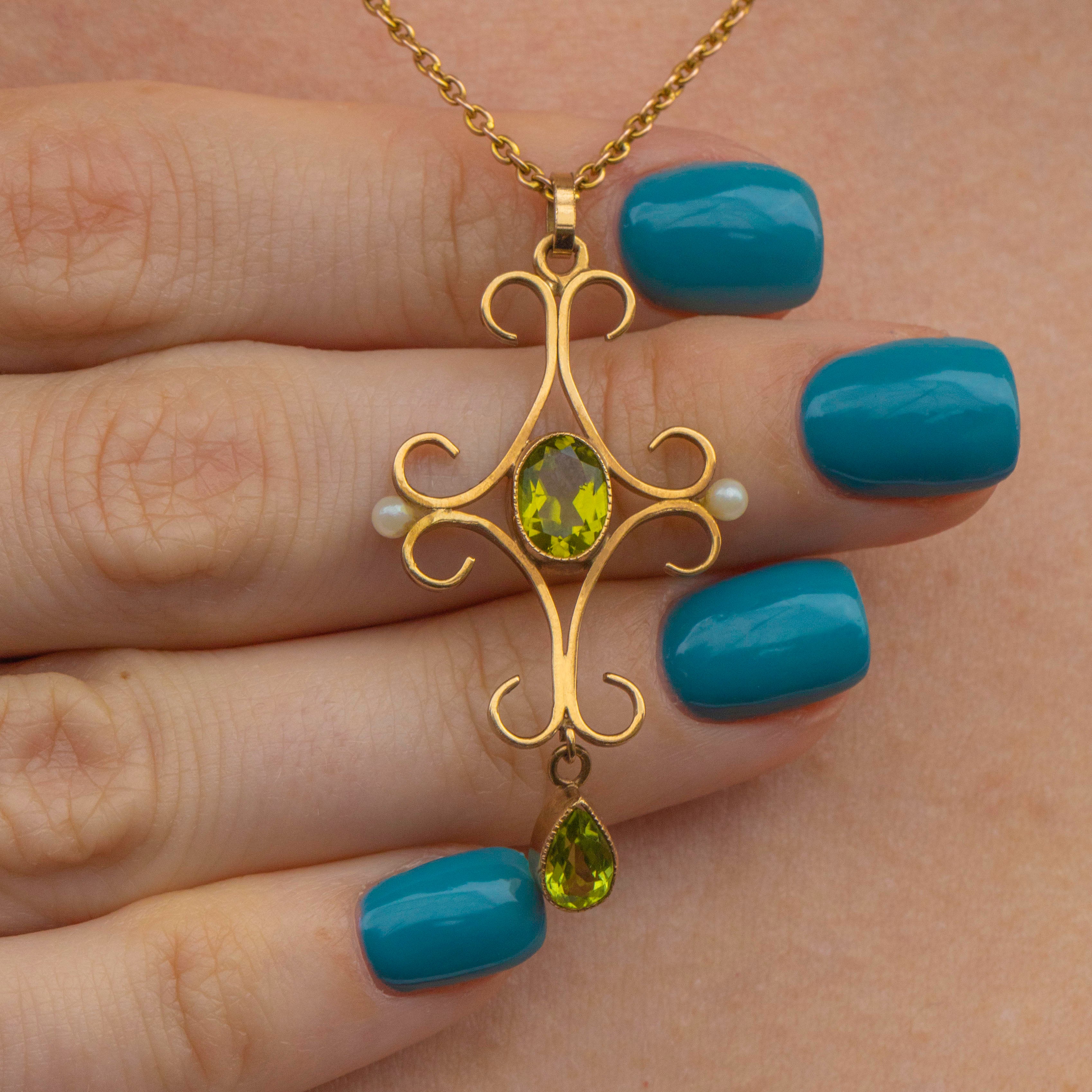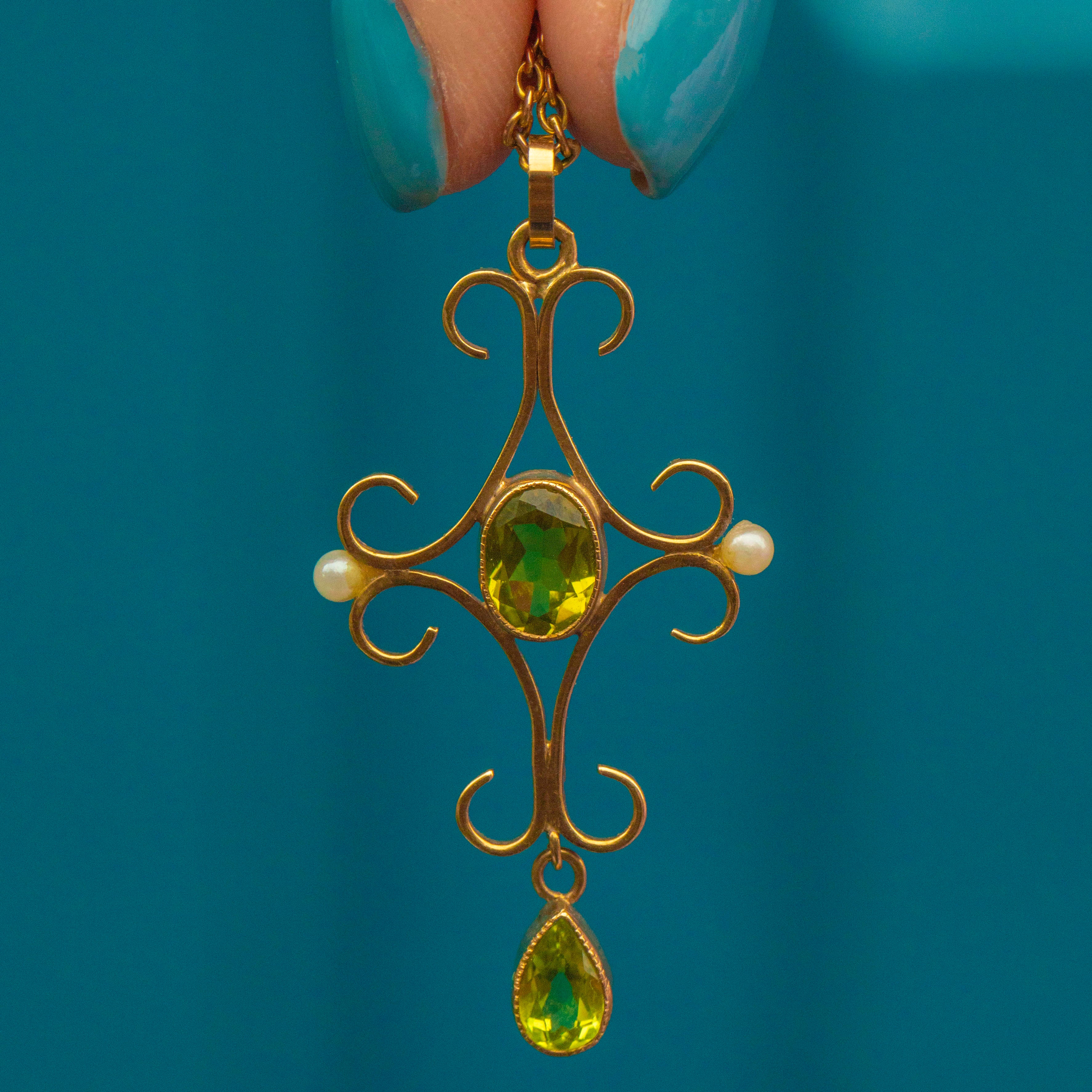 EXCELLENT. This Edwardian 9ct Gold Peridot Pearl pendant is in excellent condition! The Peridots and Pearls are secure within their settings, with no damage to note. The Gold is perfectly formed and possesses wonderful reflective qualities. With a modestly sized bale, you can easily suspend this Edwardian pendant from a skinny Gold chain of your choice!