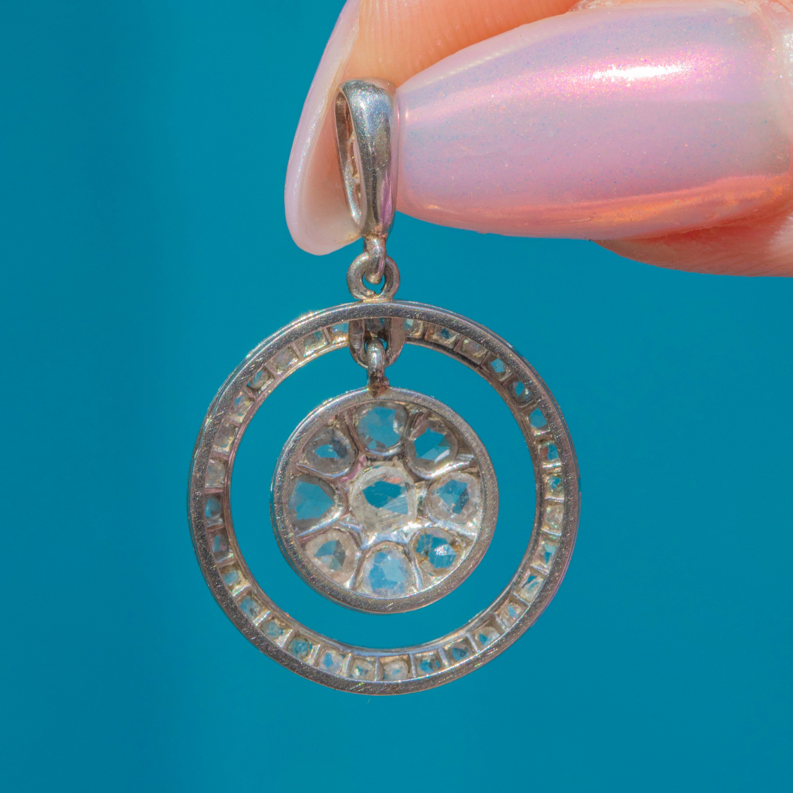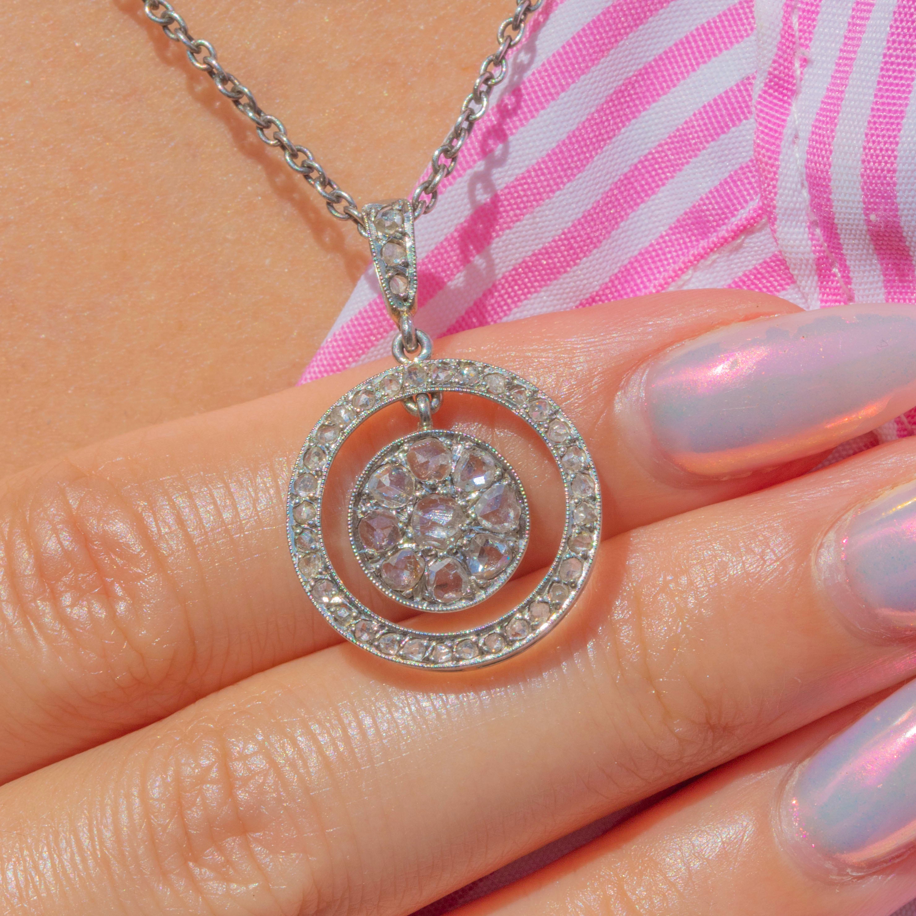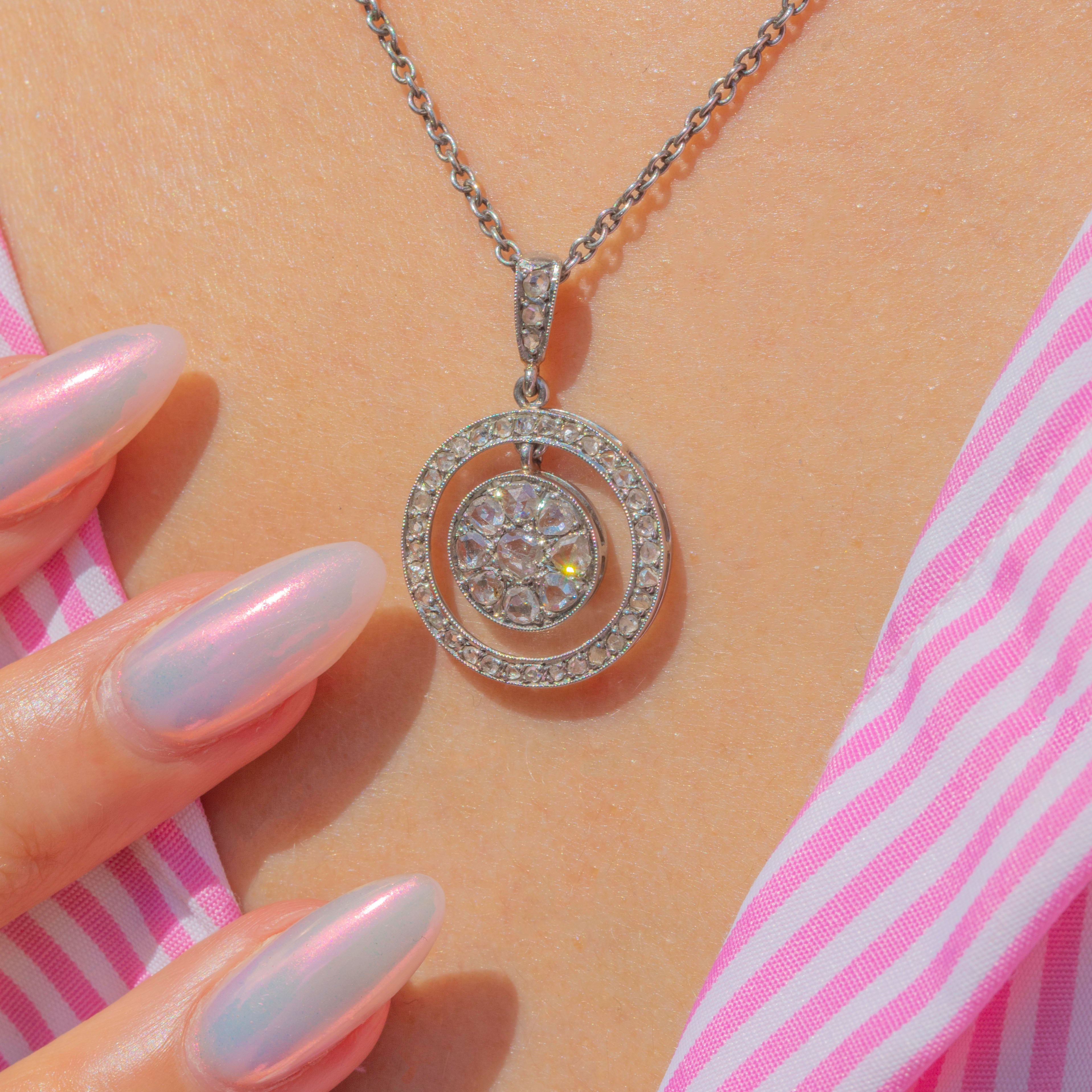 Featuring a graceful encrusted open circular frame with a captivating Diamond cluster drop, delicately dangling at its centre. This pendant is perfect for collectors or anyone seeking a graceful statement with historic charm.
