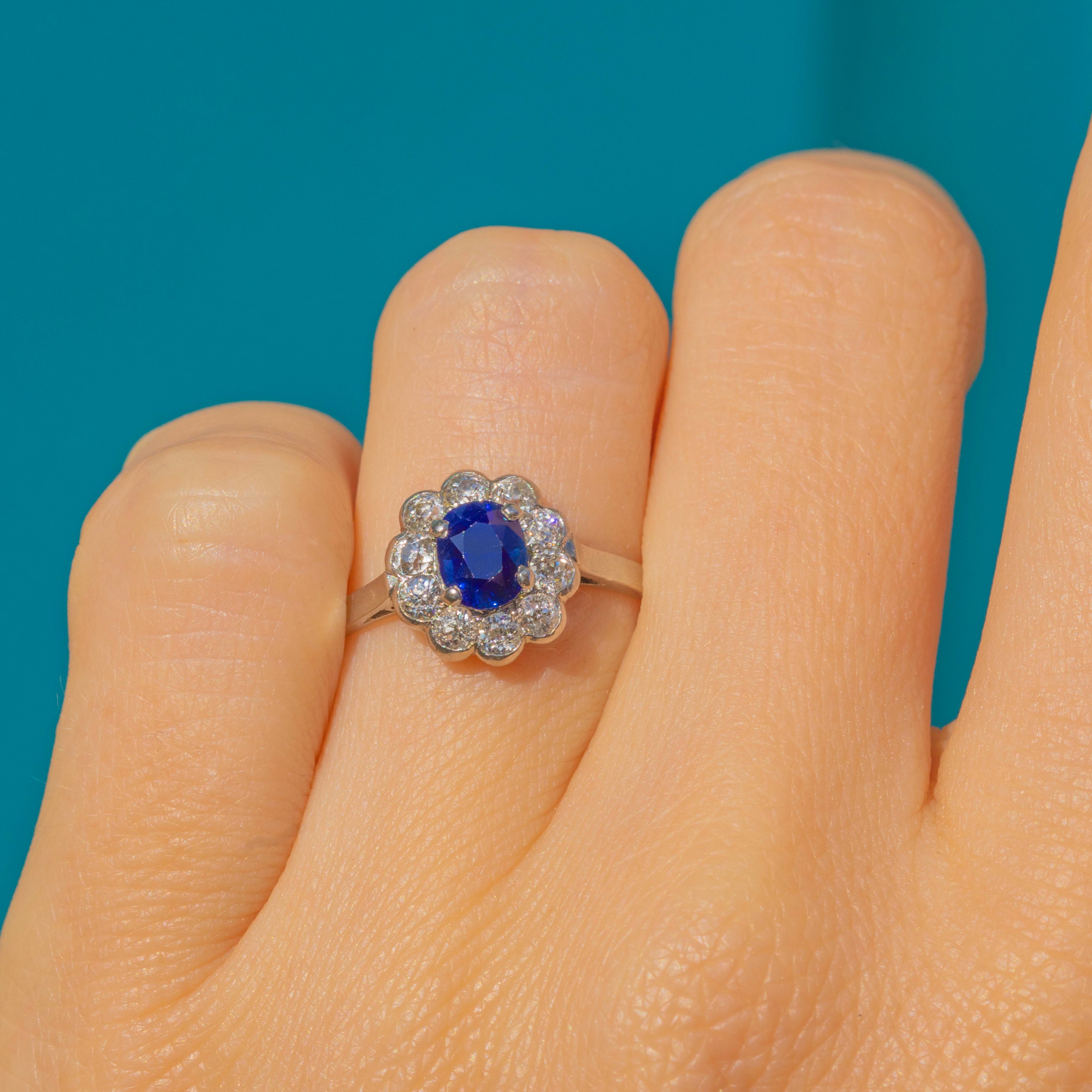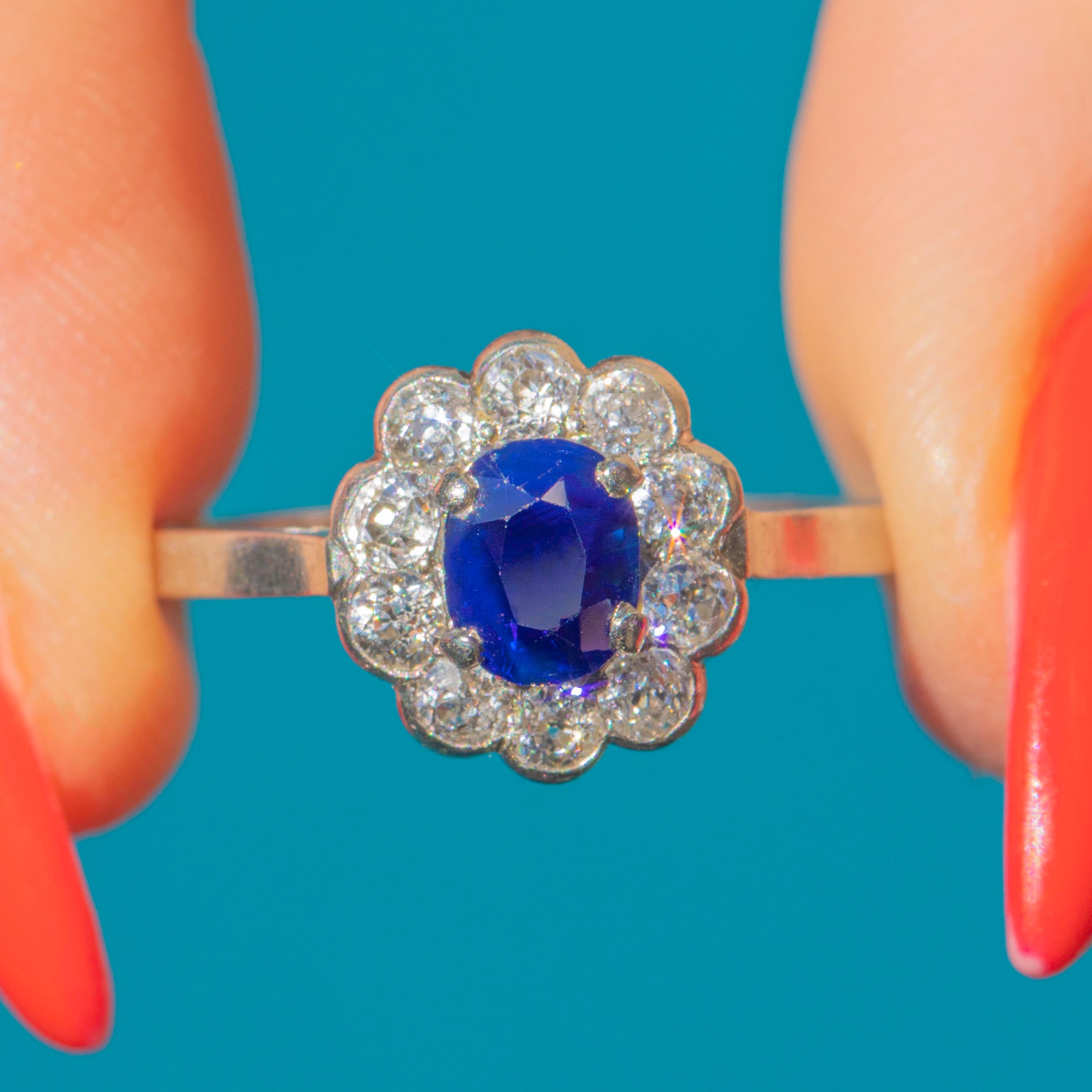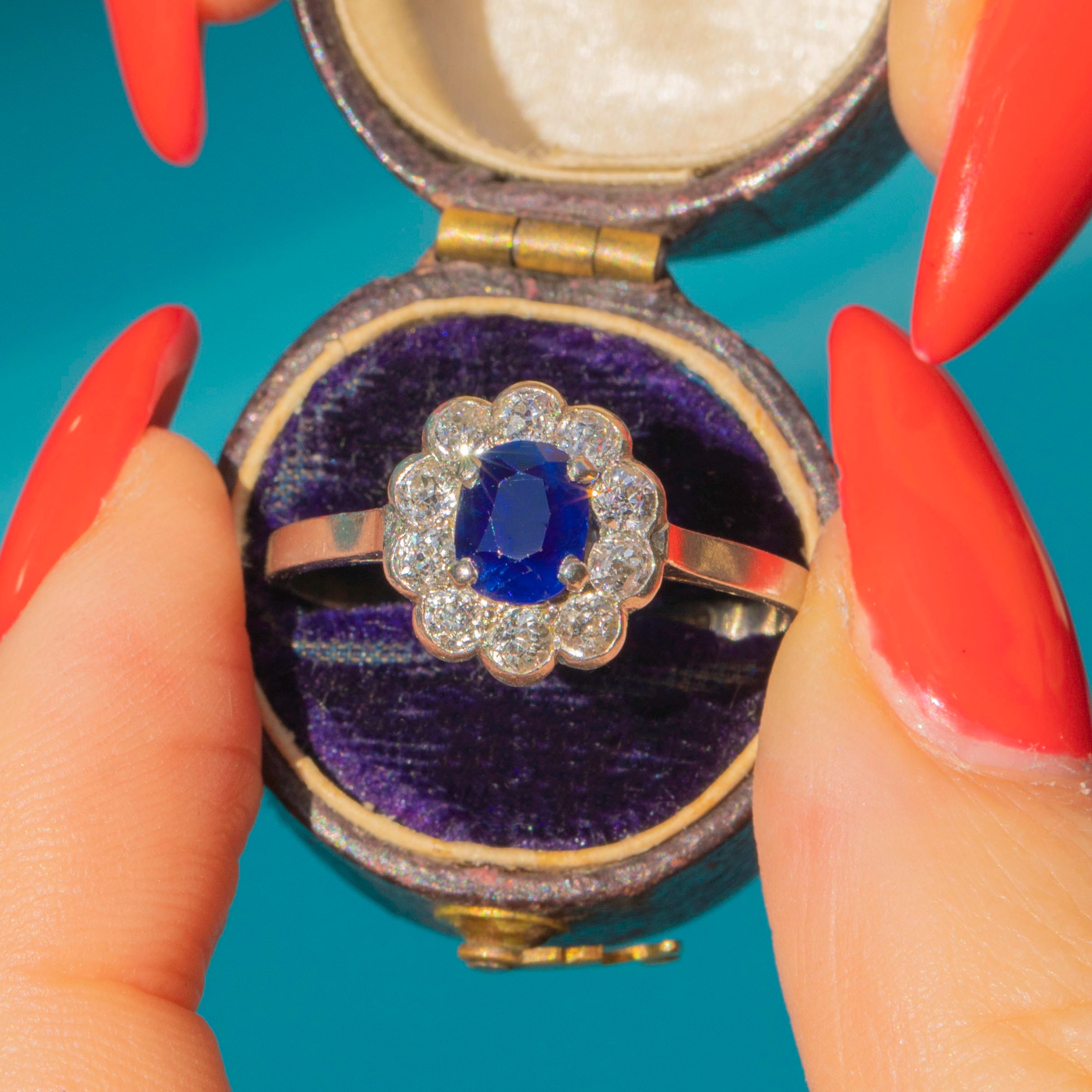 At the centre of the impressive cluster lies a royal blue 0.32ct Natural Sapphire, haloed by ten incredibly charming and bright antique Diamonds. She is a style classic! Regal, majestic, and would be a superb choice for a unique engagement ring.