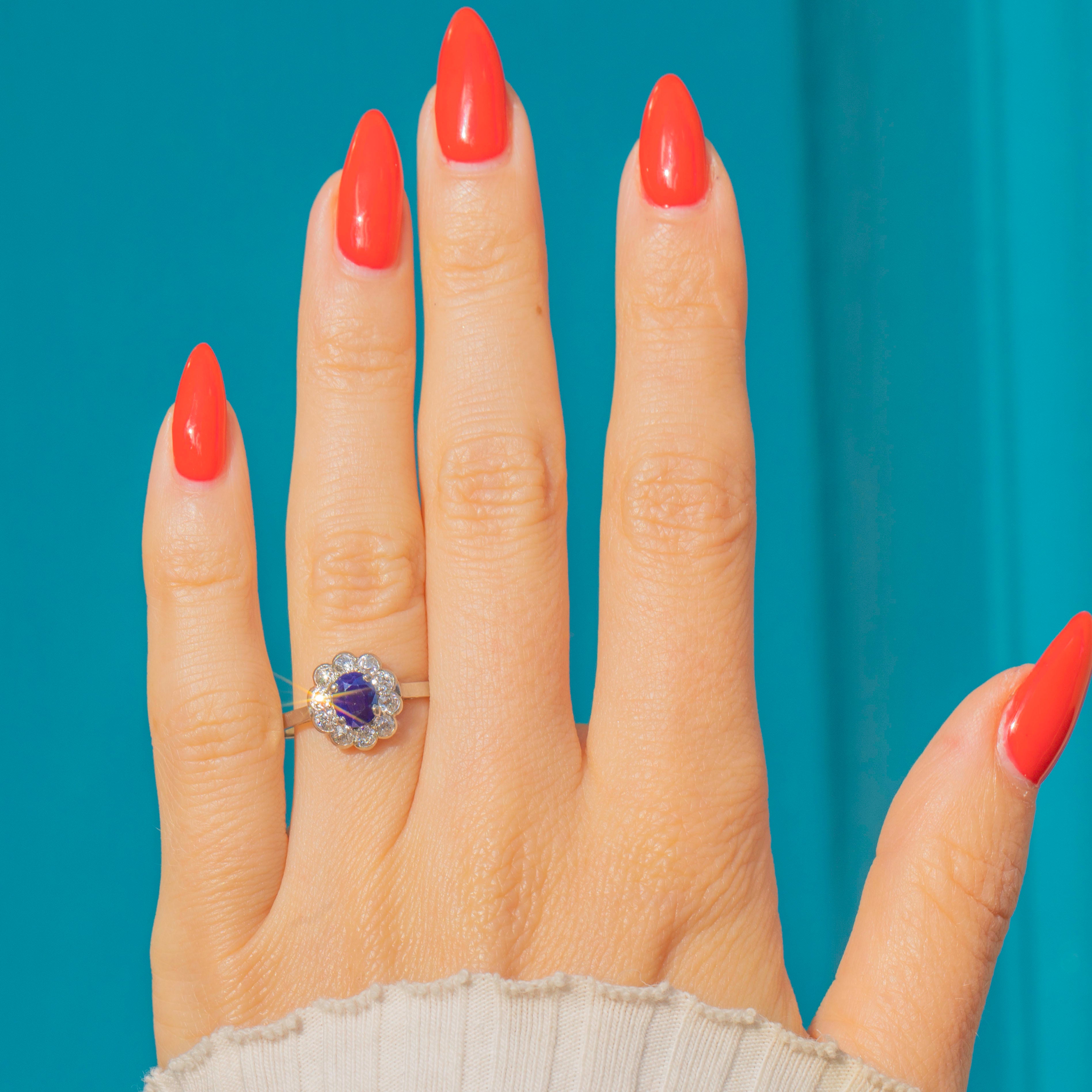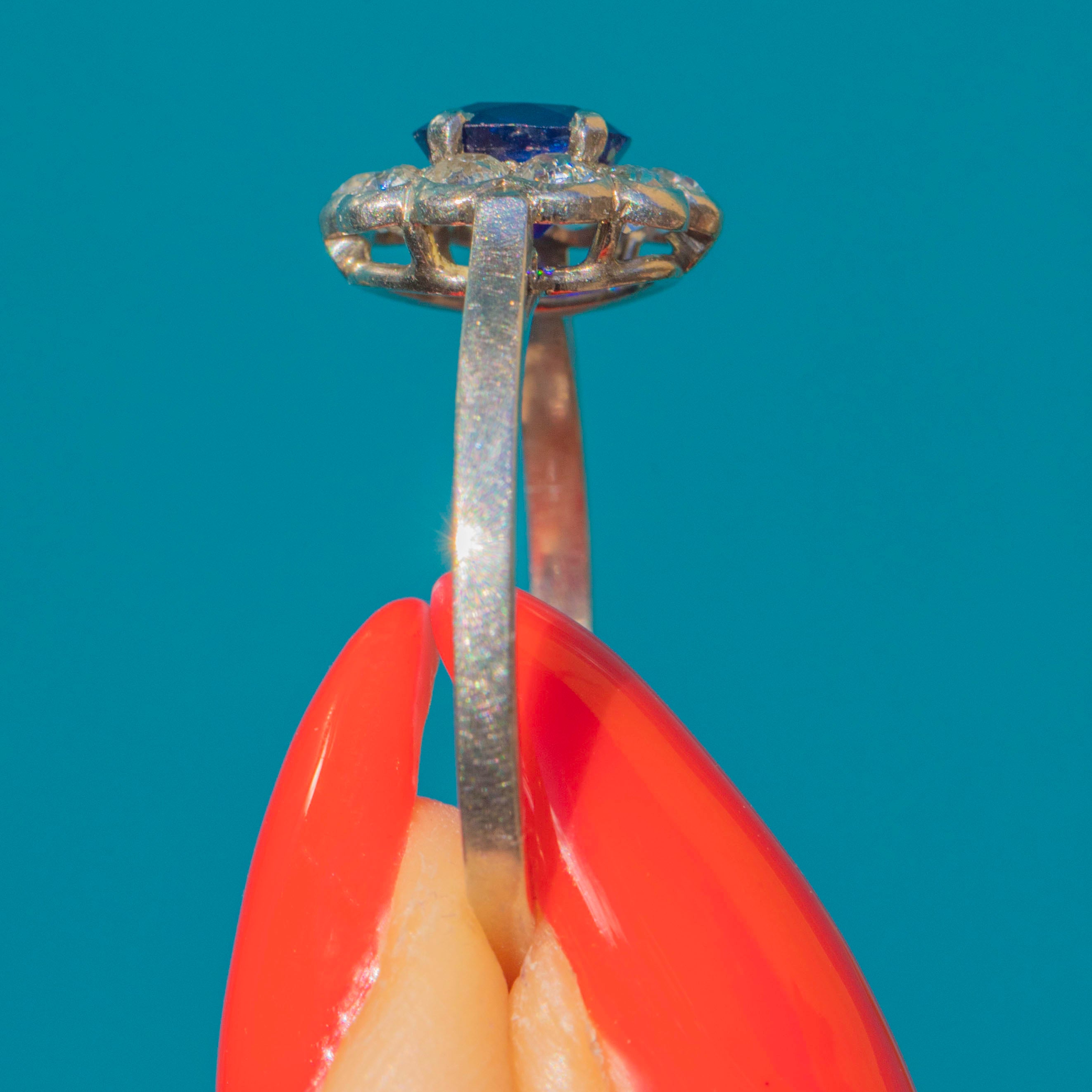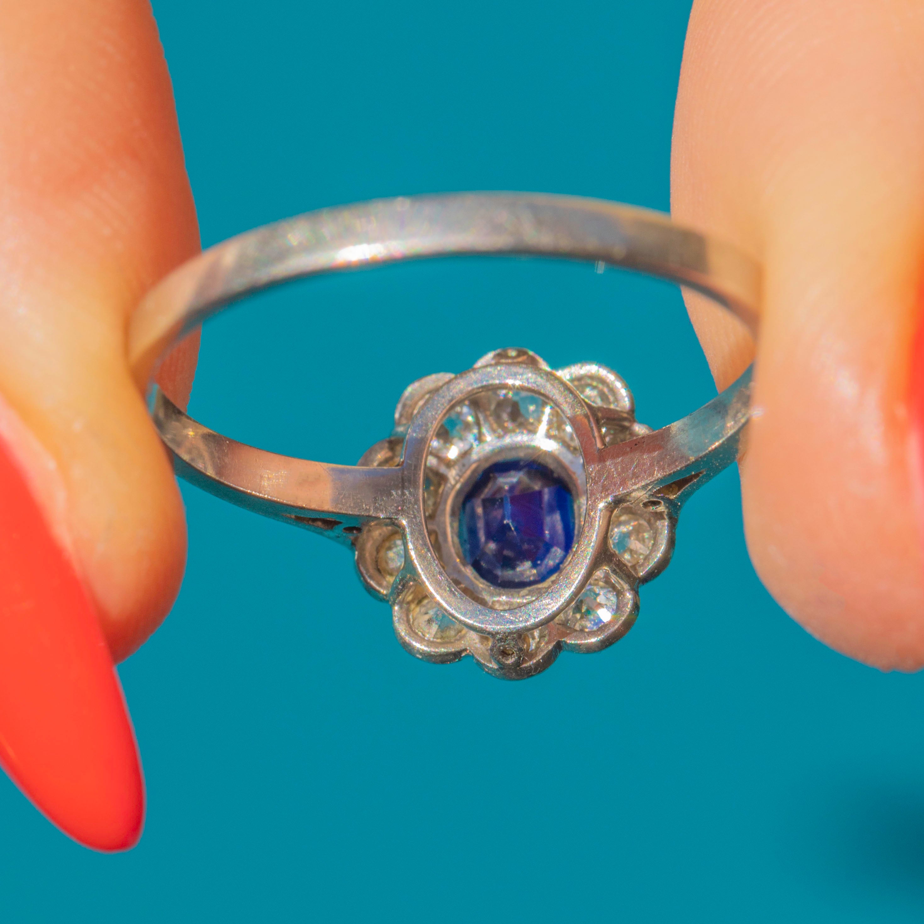 At the centre of the impressive cluster lies a royal blue 0.32ct Natural Sapphire, haloed by ten incredibly charming and bright antique Diamonds. She is a style classic! Regal, majestic, and would be a superb choice for a unique engagement ring.