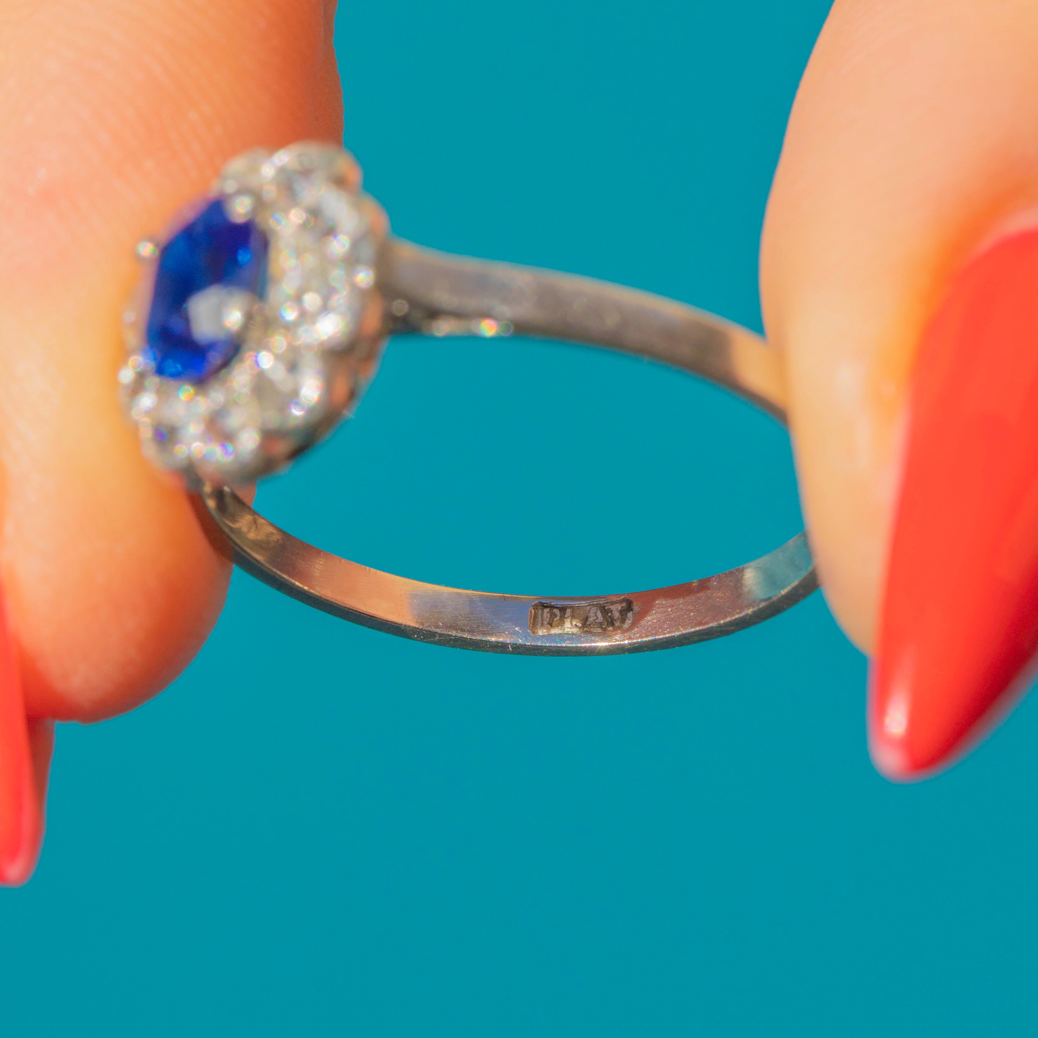 EXCELLENT. This Edwardian Platinum Sapphire Diamond cluster ring is a magnificent treasure, offered in excellent condition. Each gemstone possesses a brilliant sparkle and brightness of hue, with the natural Sapphire a sought-after vivid blue. Her Platinum setting has also aged well, with very minimal signs of wear, commensurate with age. The gemstones are all securely set and free from chips or abrasions. All in all, she's a regal treat!