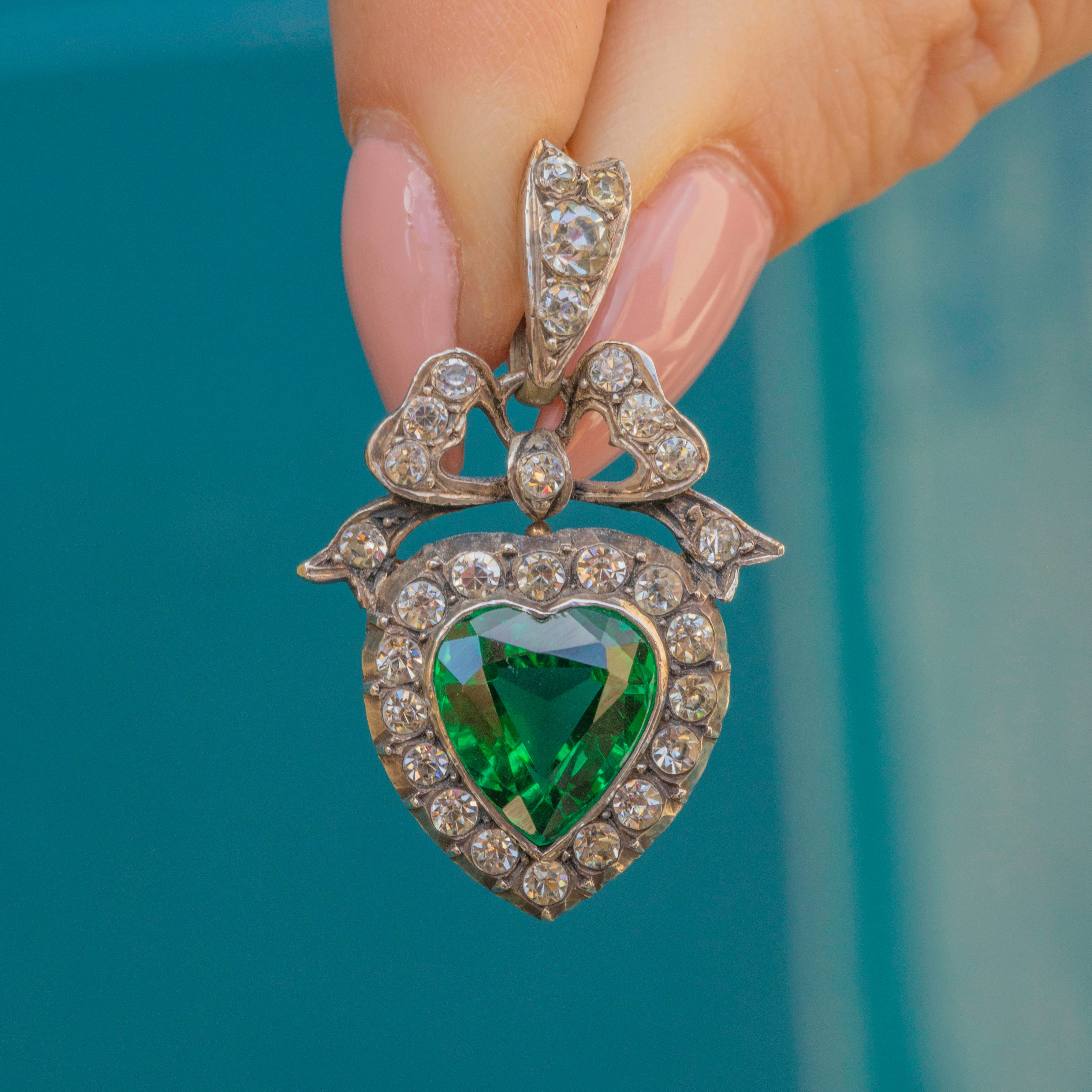 Add a pop of colourful charm to your décolletage with this Edwardian Silver Green Paste heart pendant!