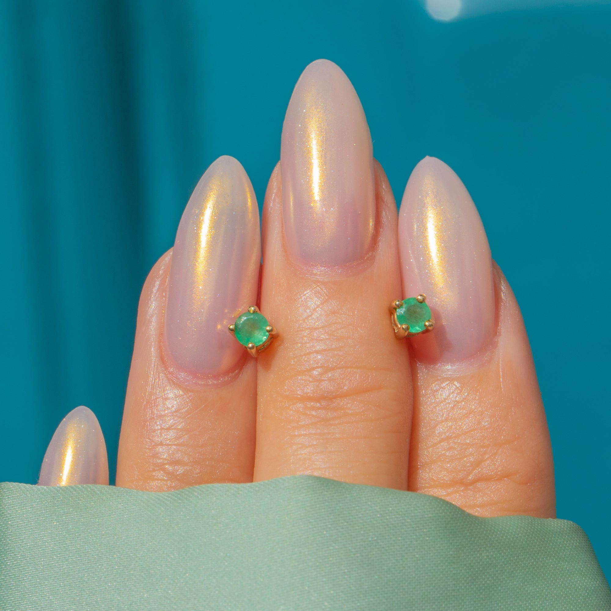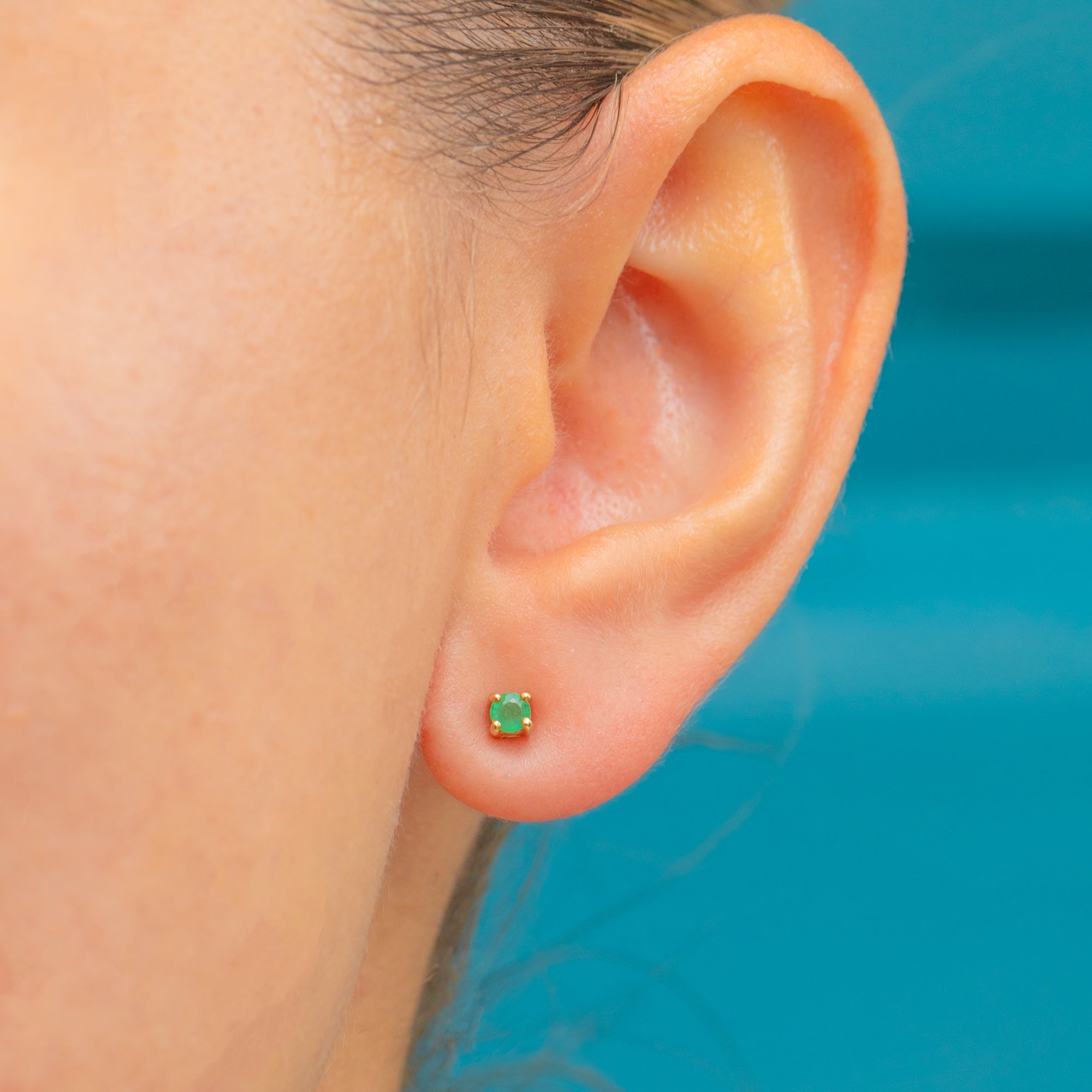 A pretty pair of Vintage Emerald stud earrings in 9ct Gold. The vibrant green Emeralds measure 3mm each, with a combined weight of approximately 0.20cts, held securely in classic claw settings that let the gemstones sparkle with natural charm.