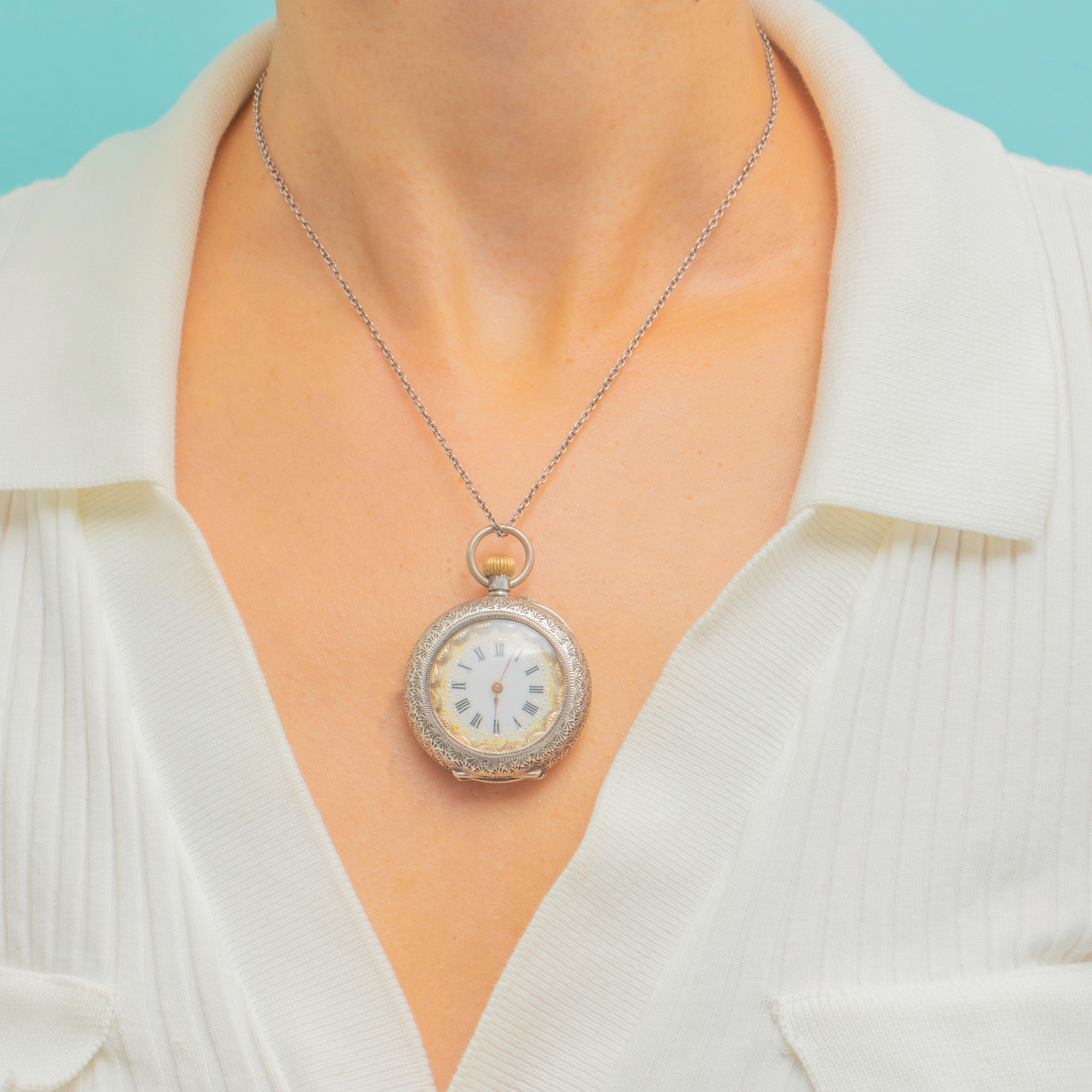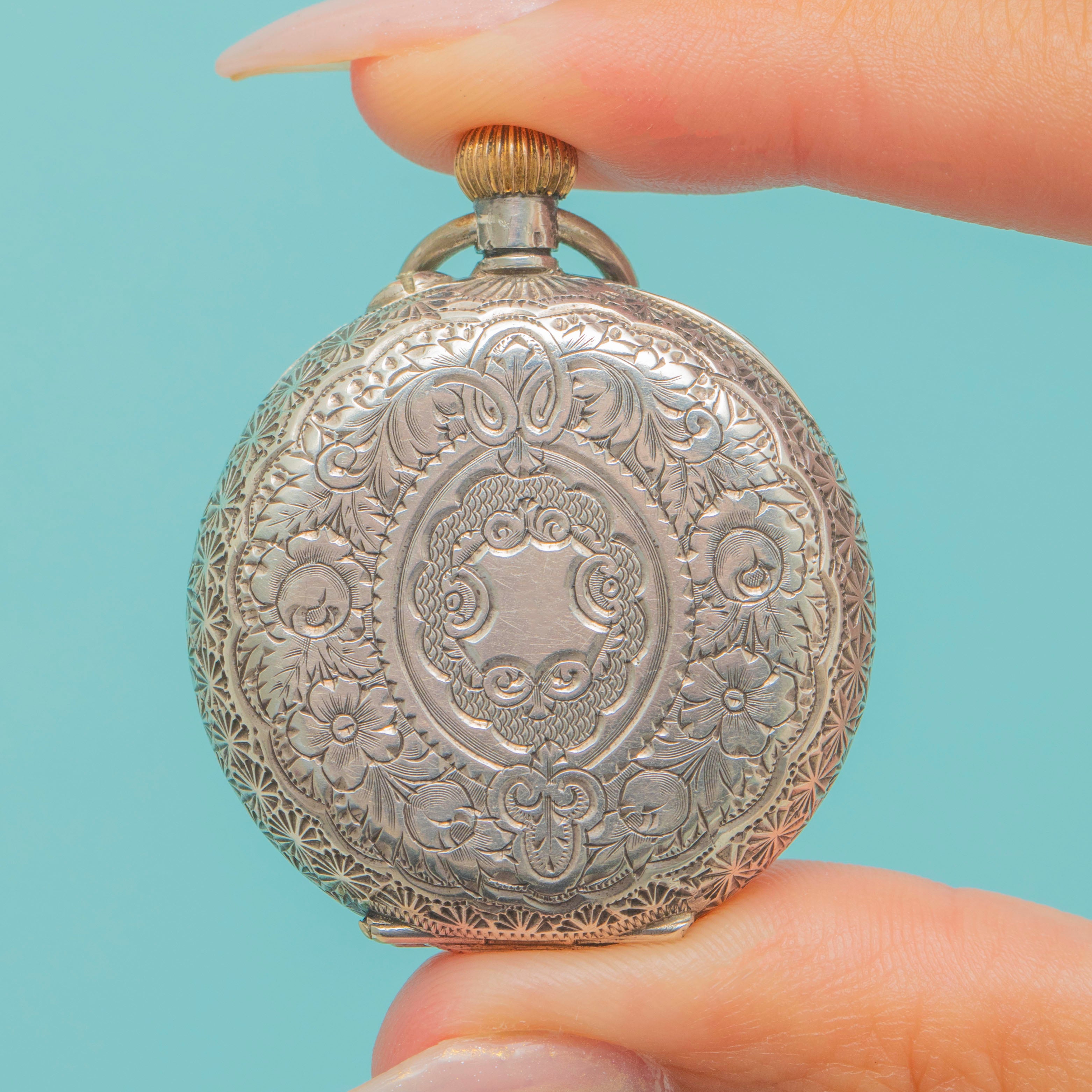 This Victorian Swiss pocket watch is crafted in bright Swiss Silver with delicate Gold details, giving it an elegant two-tone finish. The case is stamped with Swiss bear marks, a coveted 935 purity high-grade , and a JJ maker’s mark, confirming its fine quality. The back is beautifully engraved, adding charm and individuality to the piece, while the scalloped-edge glass and porcelain dial with black Roman numerals provide a classic Victorian look.