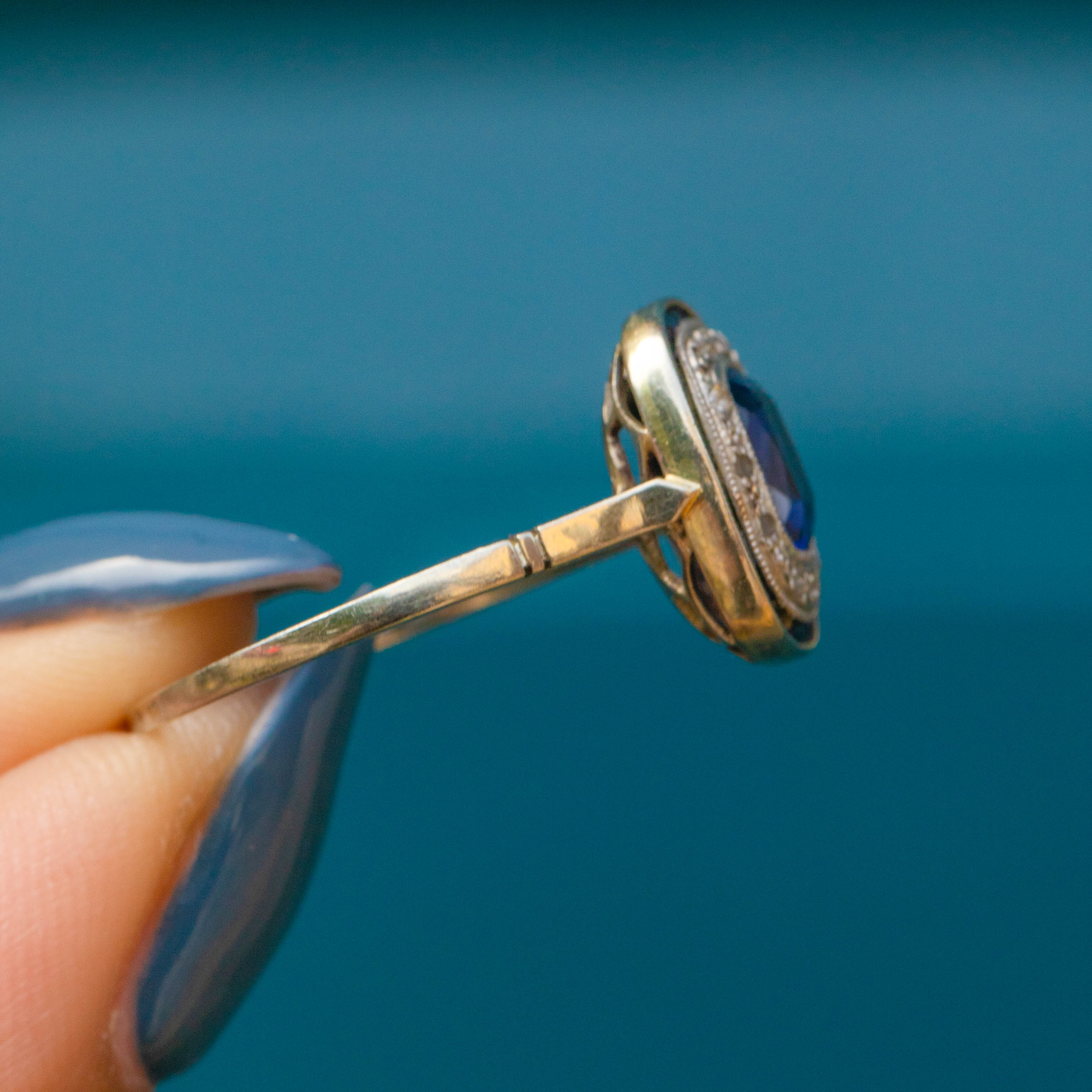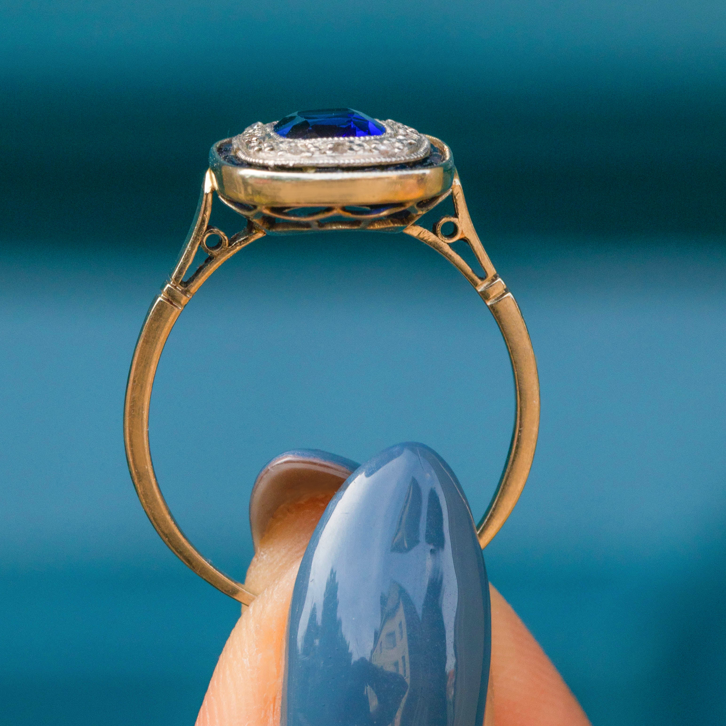 Whether you are looking for a unique engagement ring or simply love to wear resplendent jewels, this French Art Deco 18ct Gold Sapphire Diamond cluster ring has got you covered!
