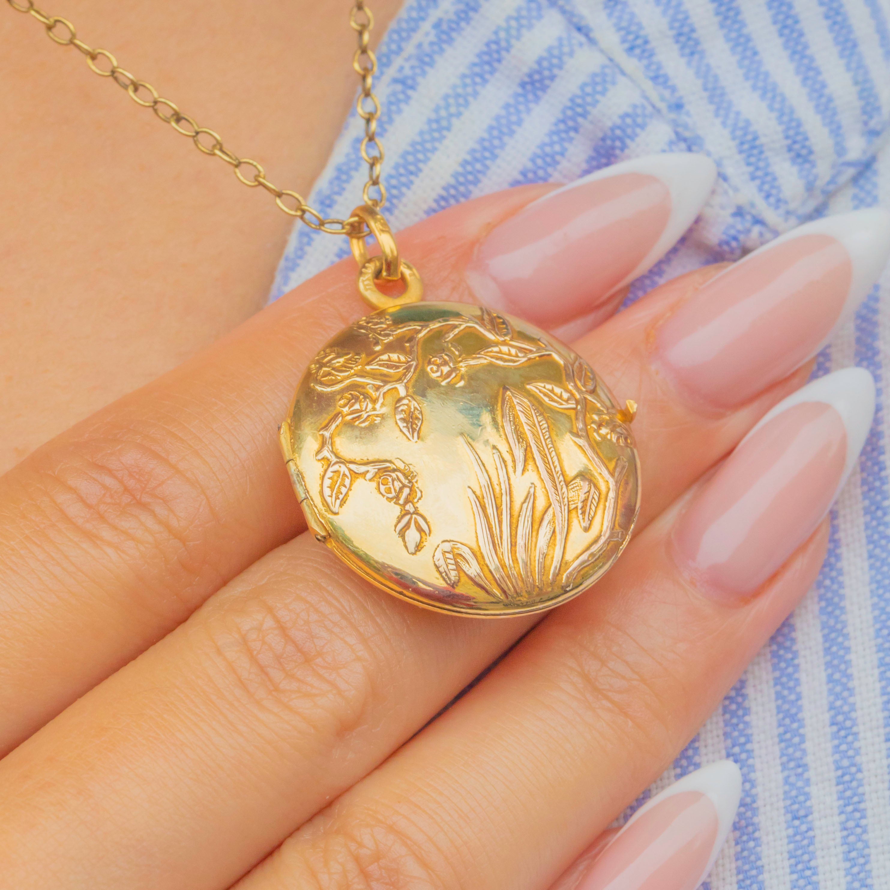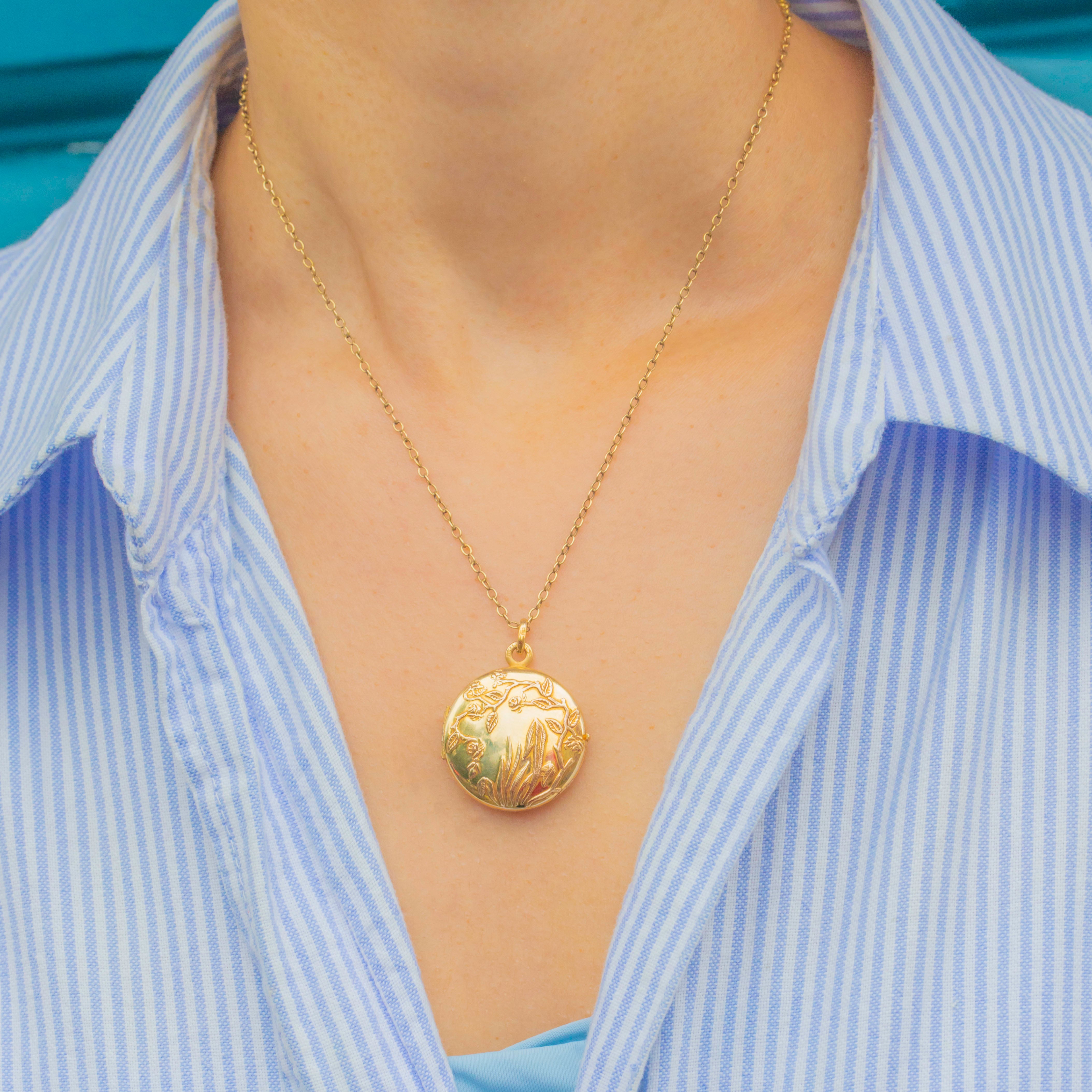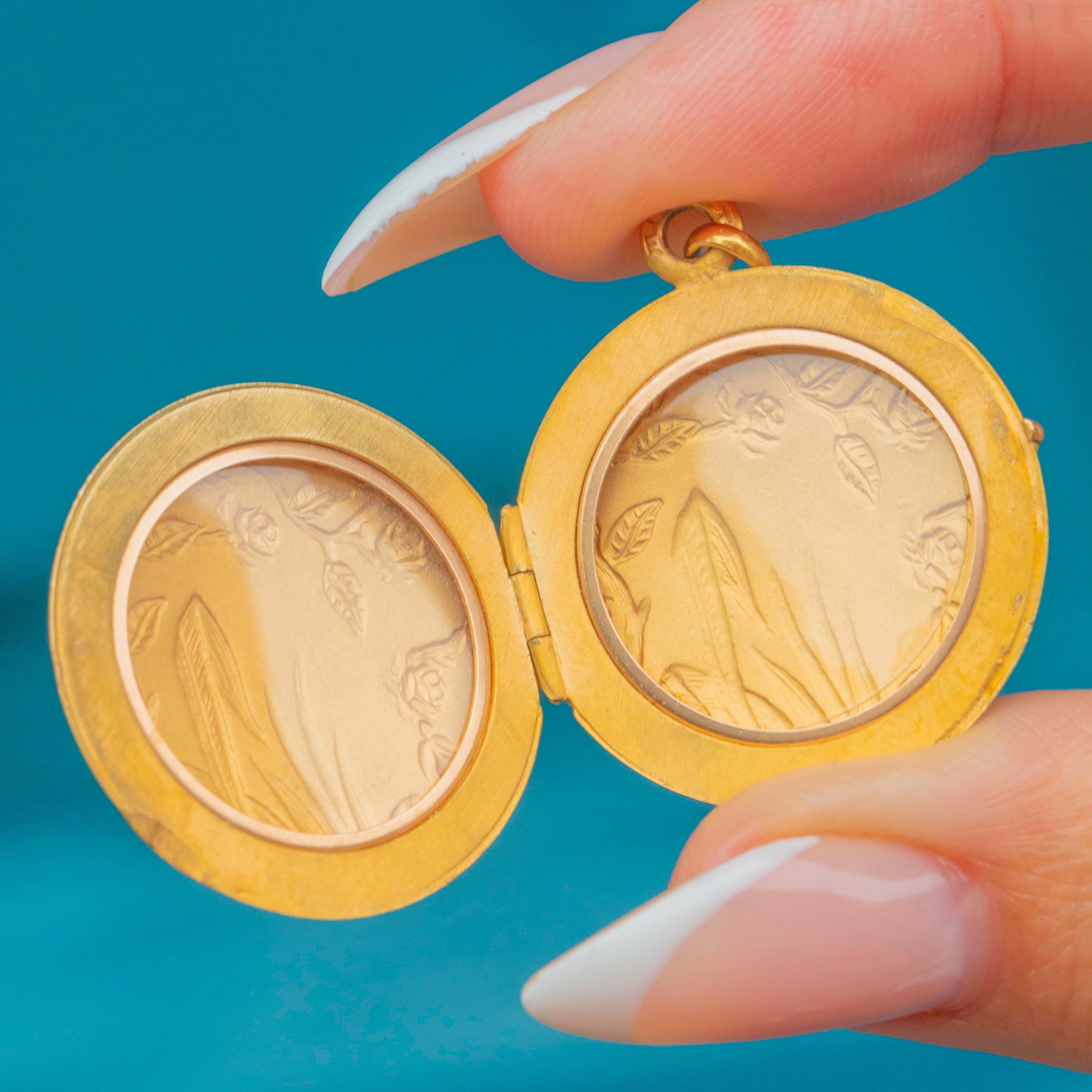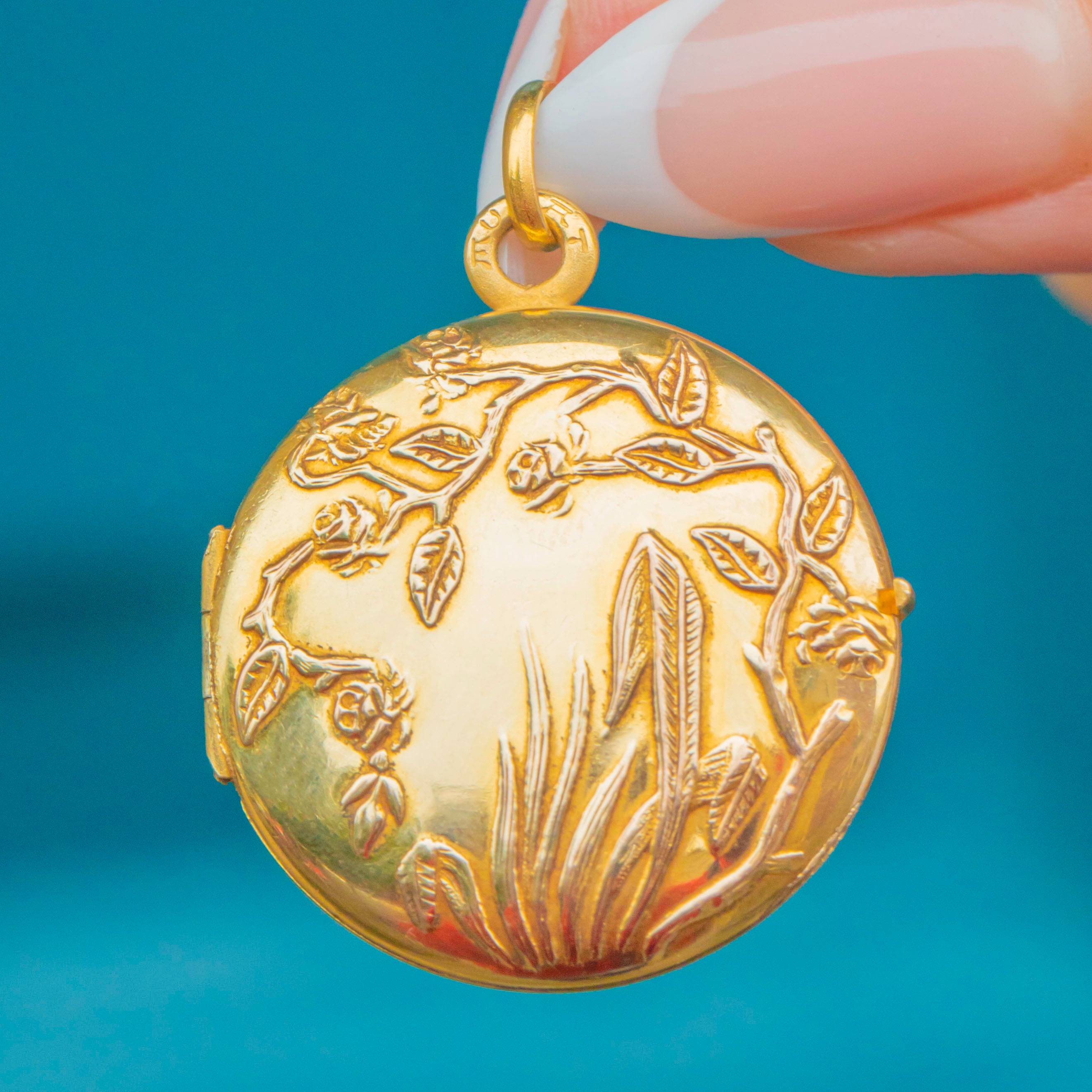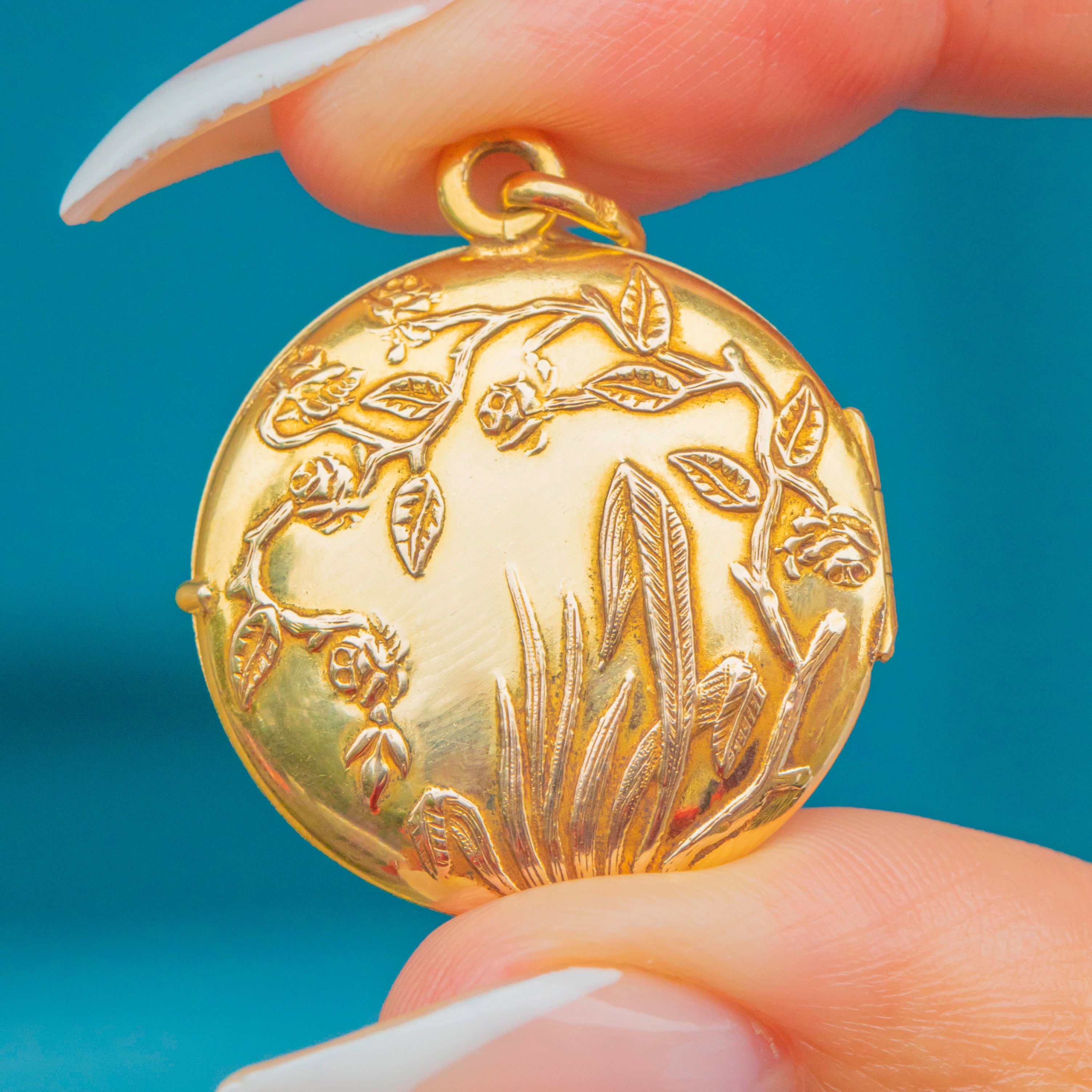 The locket opens to reveal a beautifully finished interior, ready to hold treasured keepsakes or photographs. With its nature-inspired decoration and classic round shape, this piece is as practical as it is ornamental, making it a perfect addition to any antique jewellery collection.