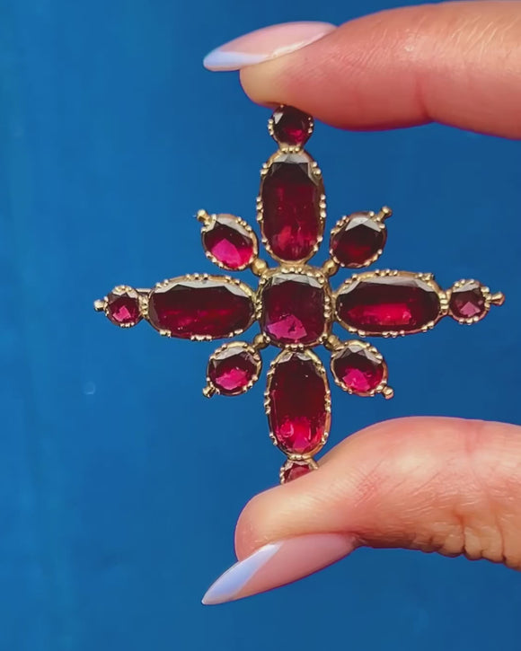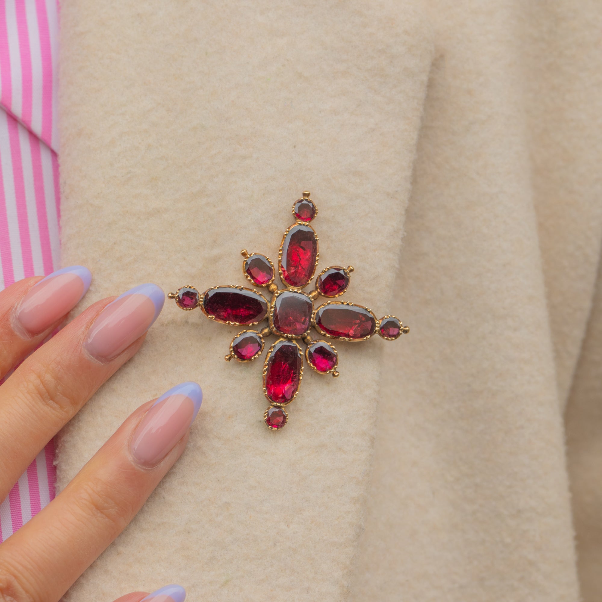 You will be blown away by this Georgian 15ct Gold flat-cut Garnet Maltese cross brooch! Steeped in Georgian charm, flat cut Garnets adorn every inch of this Maltese cross. Graduating in size, her intricately shaped Garnets exude fabulous red wine hues.