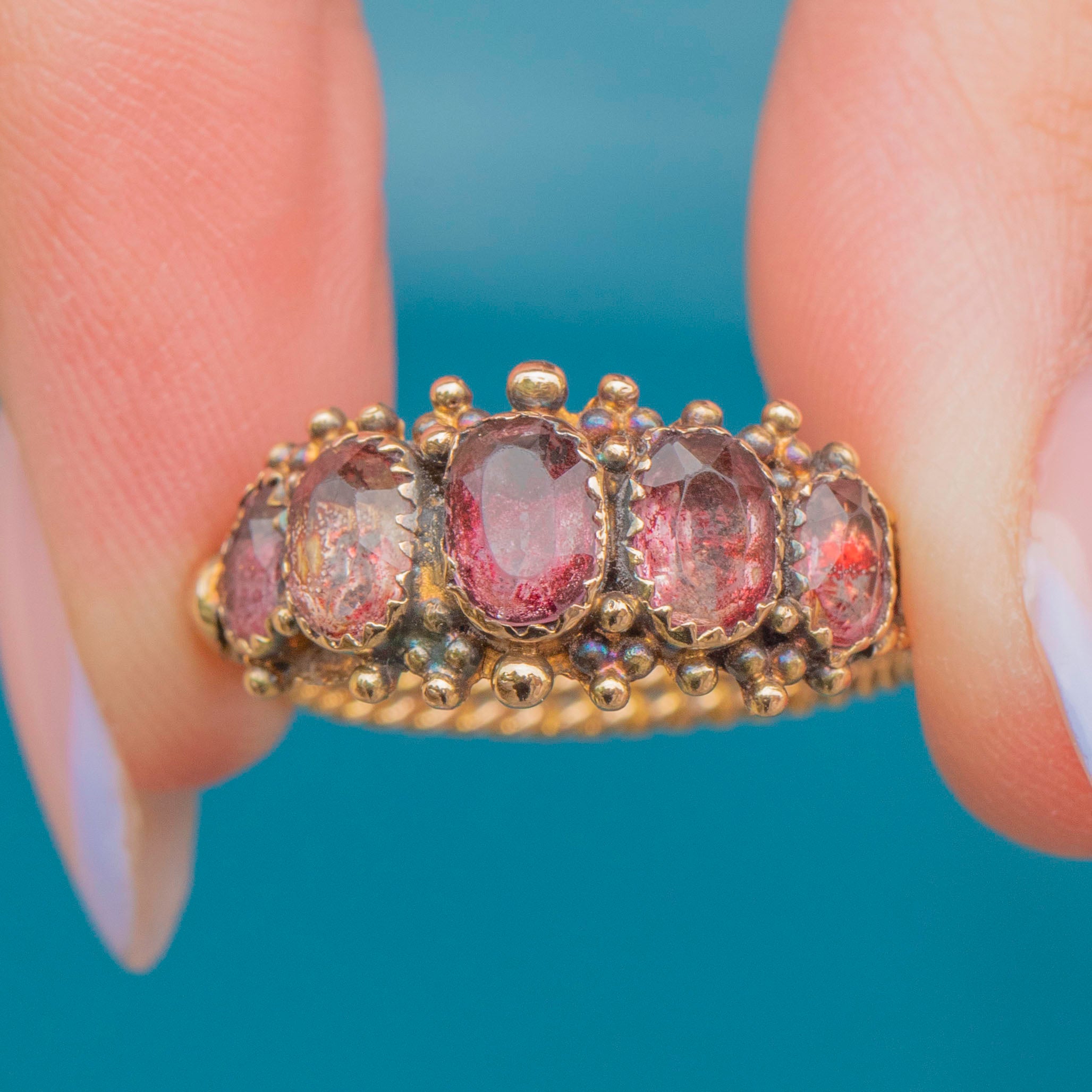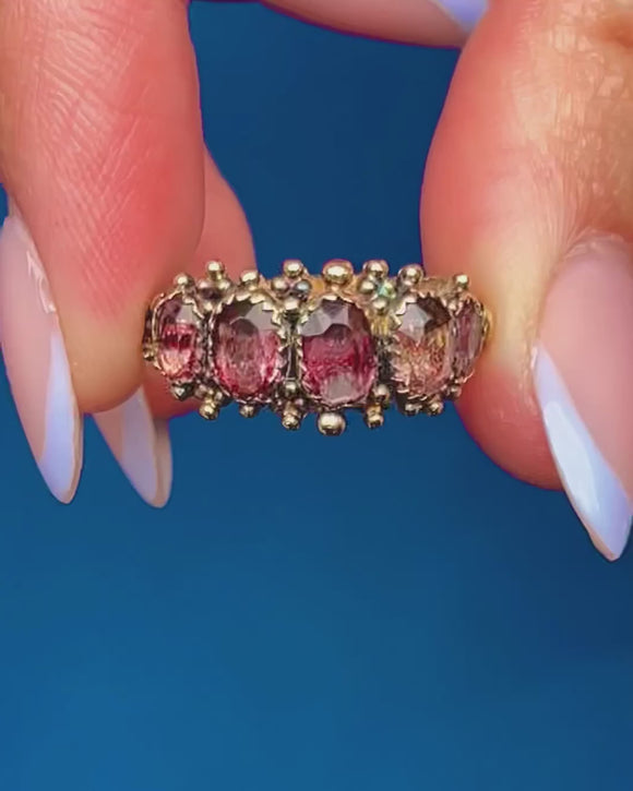 We adore the design of this Georgian 15ct Gold foiled Amethyst five stone ring- which is quintessentially Georgian in design!