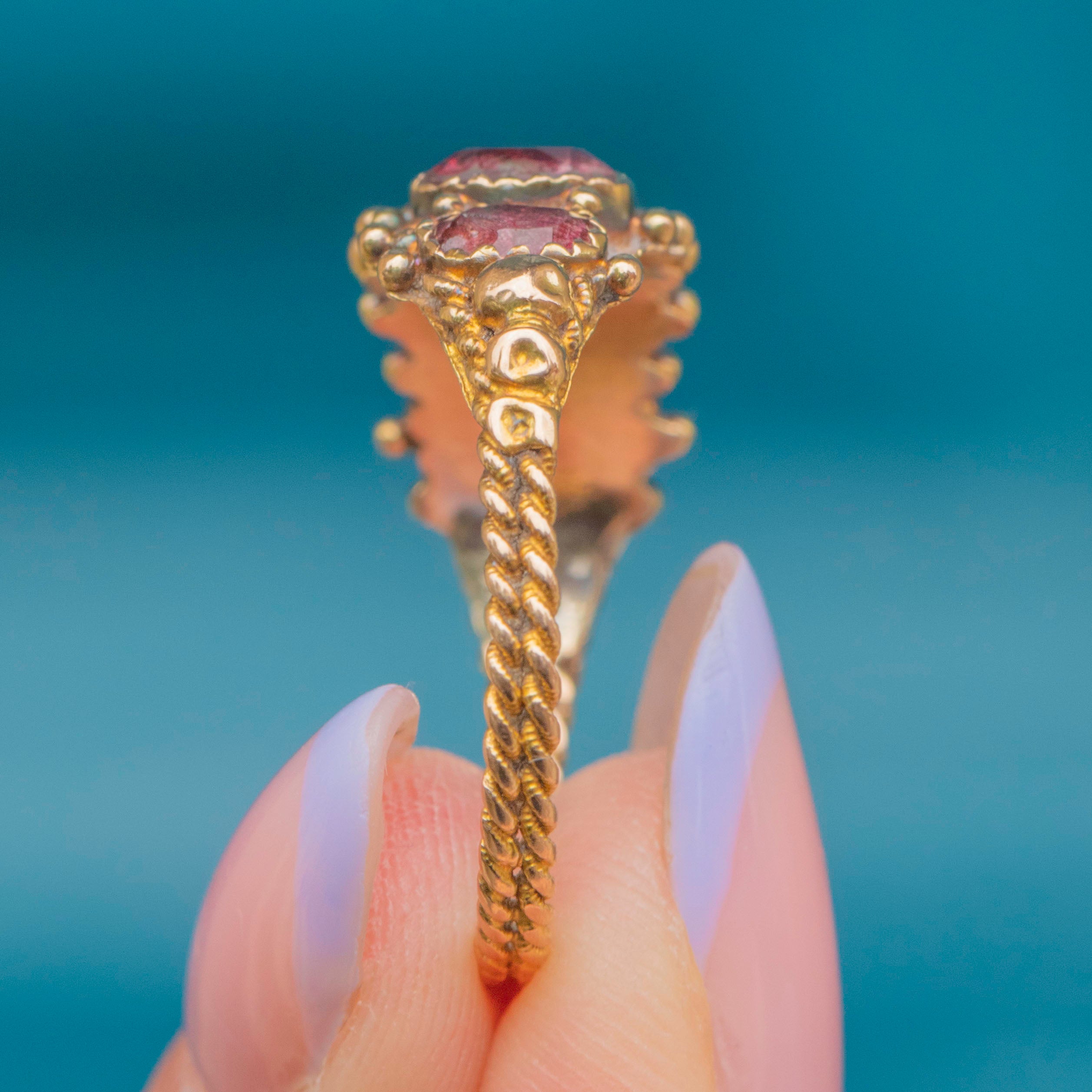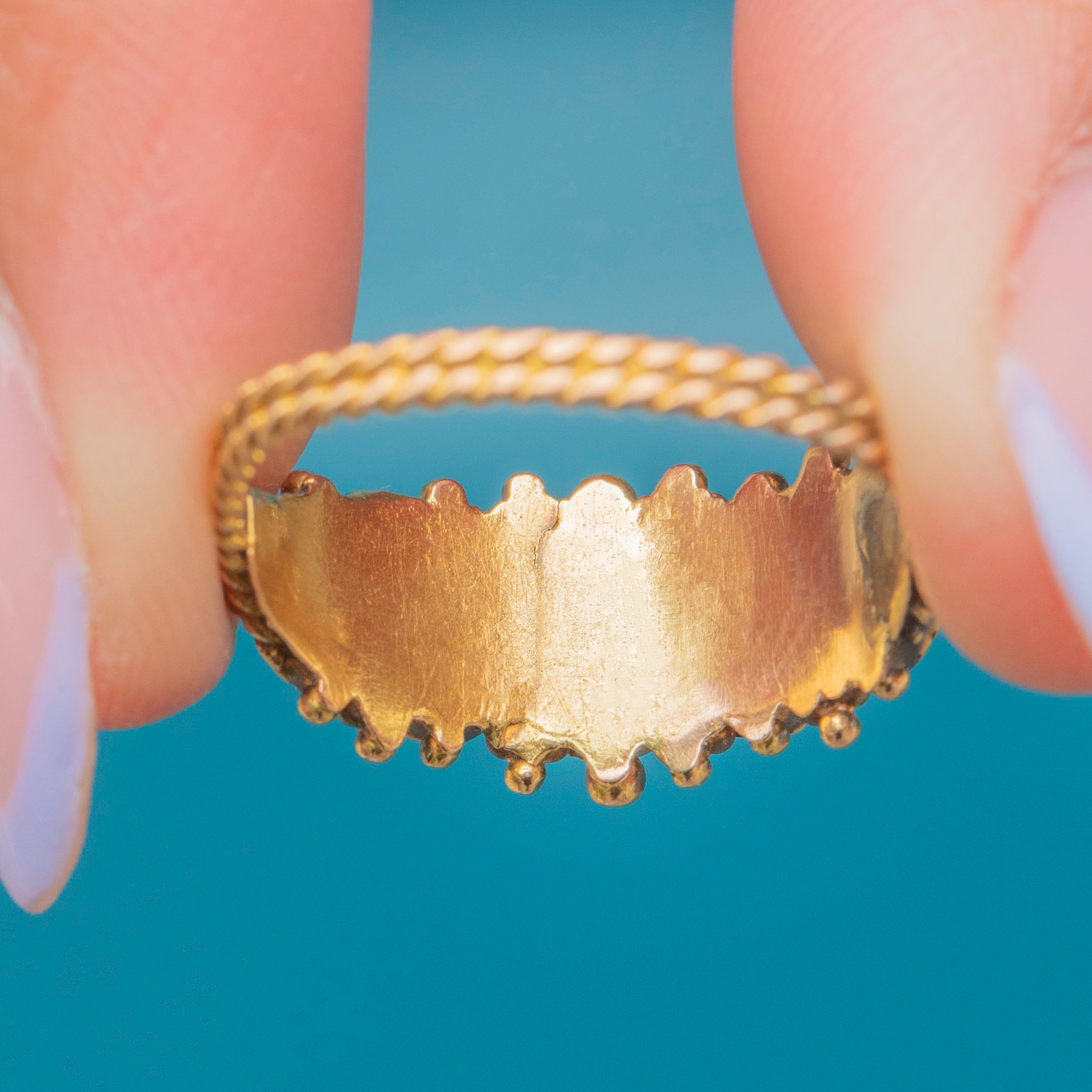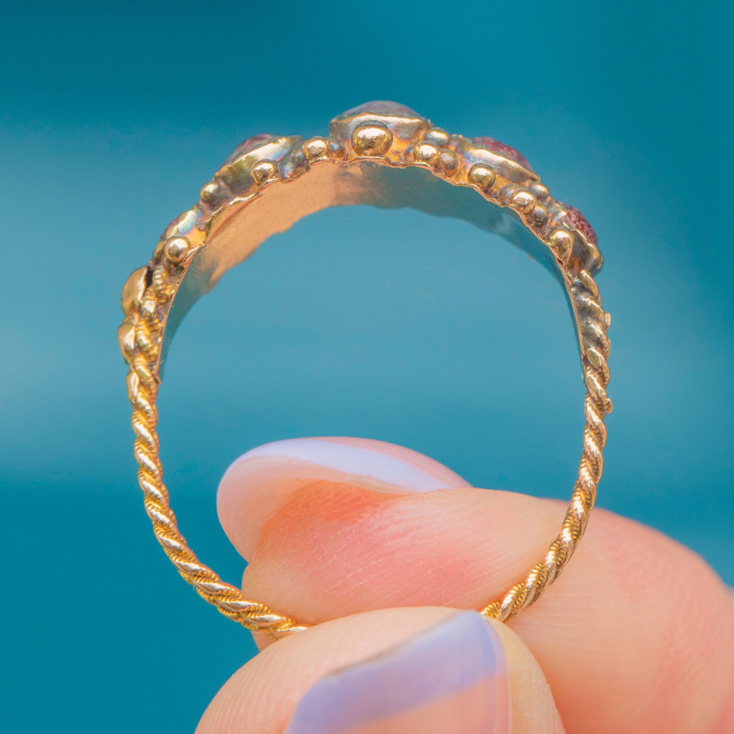 GOOD: This Georgian 15ct Gold Foiled Amethyst five stone ring is in good condition, especially considering her grand age. The Amethysts, although they have some wear to them, are set securely and foiled beautifully, a wonderful sight. The 15ct Gold is brightly saturated, and while one of the beaded details is missing, this does not affect the overall impact on the piece. Her twisted rope band has slightly warped, however, she still sits flush on the finger. At over 200 years old, this Georgian ring can be enjoyed straight from its box!