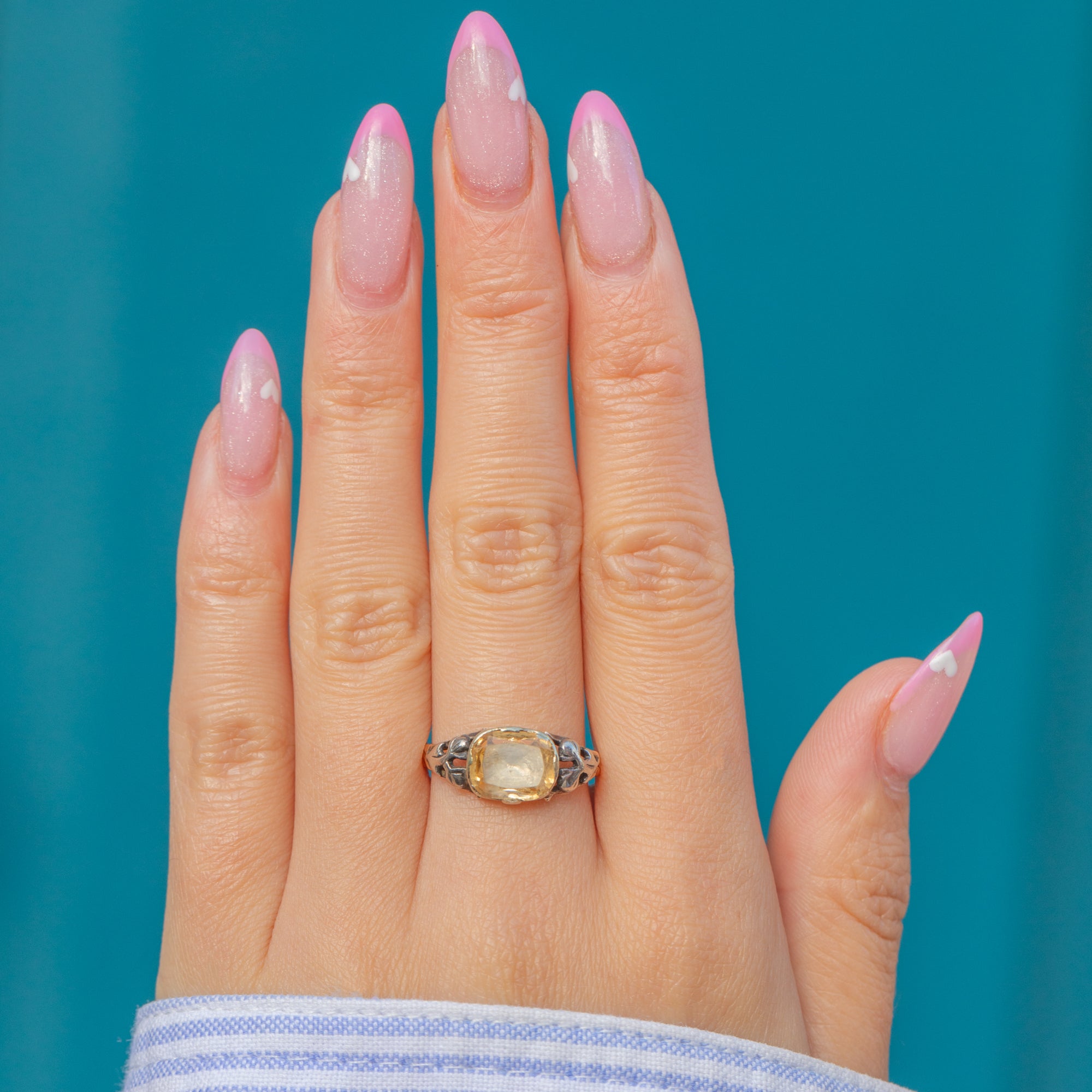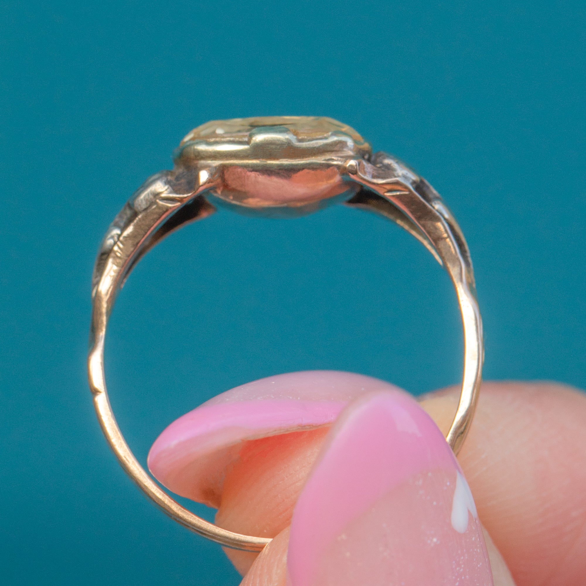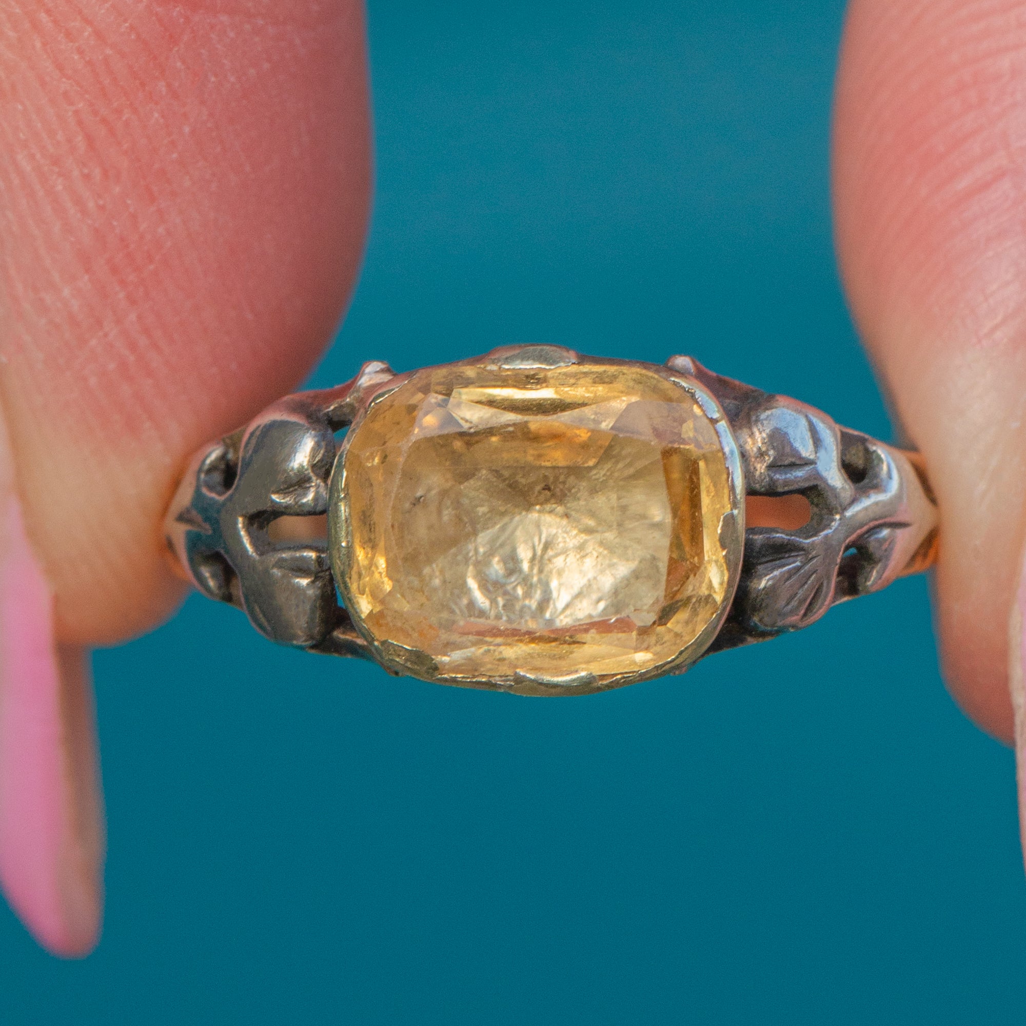 This exquisite Georgian Rococo ring, c.1760–1780, is set with a glowing 2.50ct Imperial Topaz, cushion-cut and foil-backed to enhance its warm golden-pink fire. The Topaz is mounted in a beautifully shaped Silver setting, elevated on a rich 15ct Gold band typical of the period’s luxurious two-tone design.