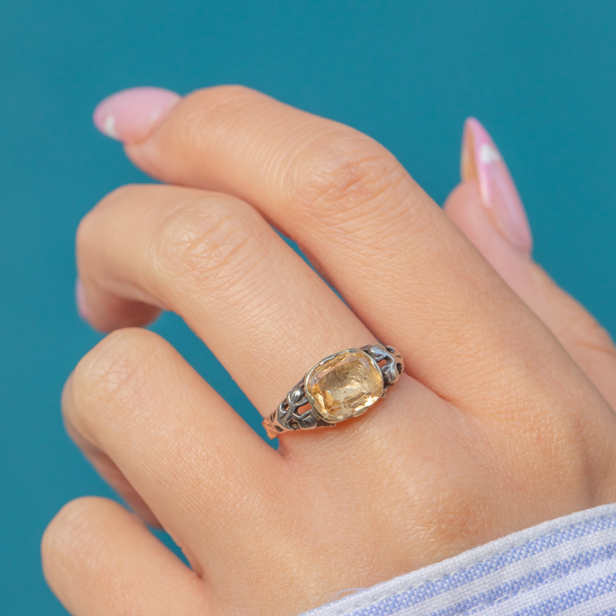 EXCELLENT: The ring is in exceptional condition for its age. The Topaz displays vibrant colour and clarity with only minimal age-related wear to the foiling. The Gold and Silver settings remain crisp and beautifully preserved.