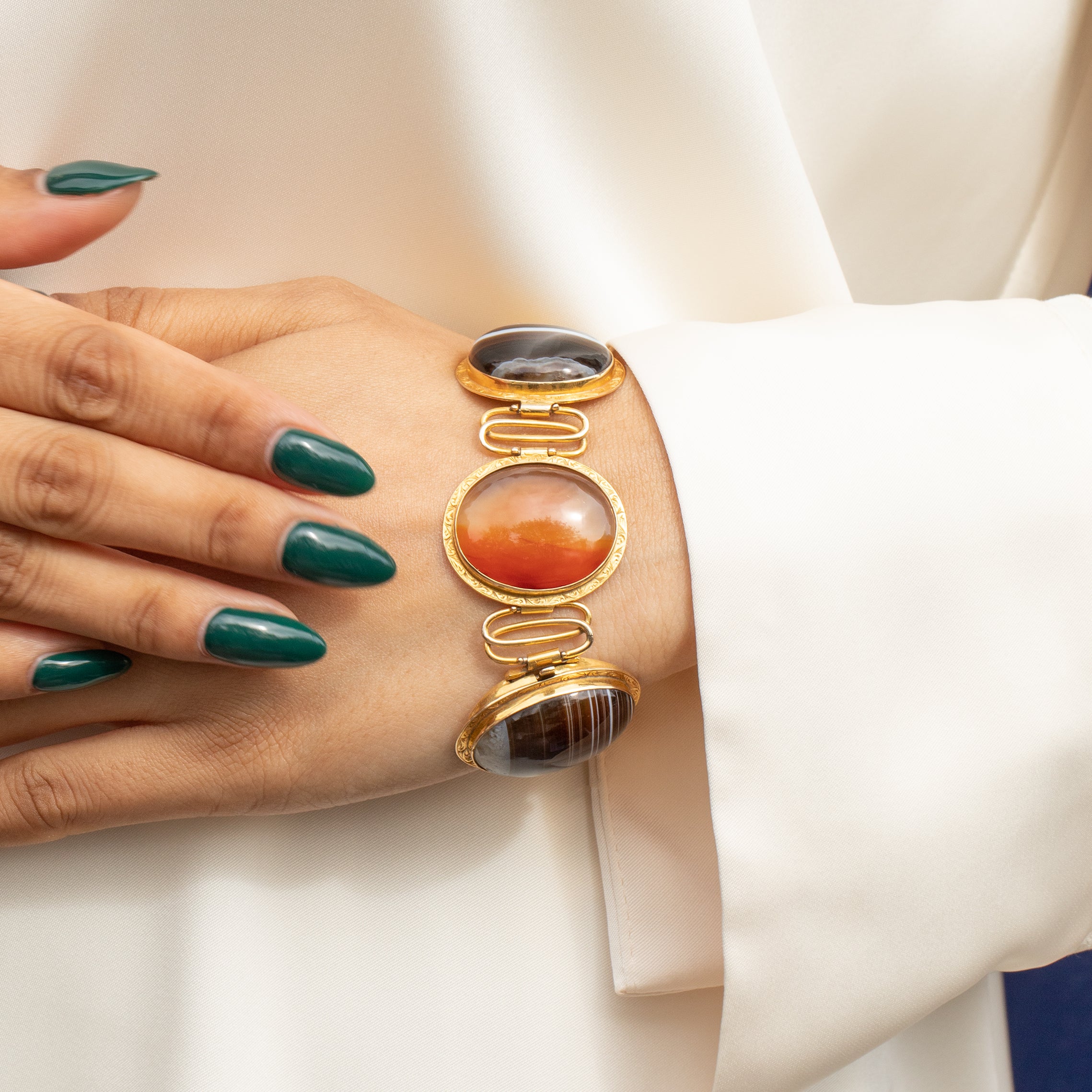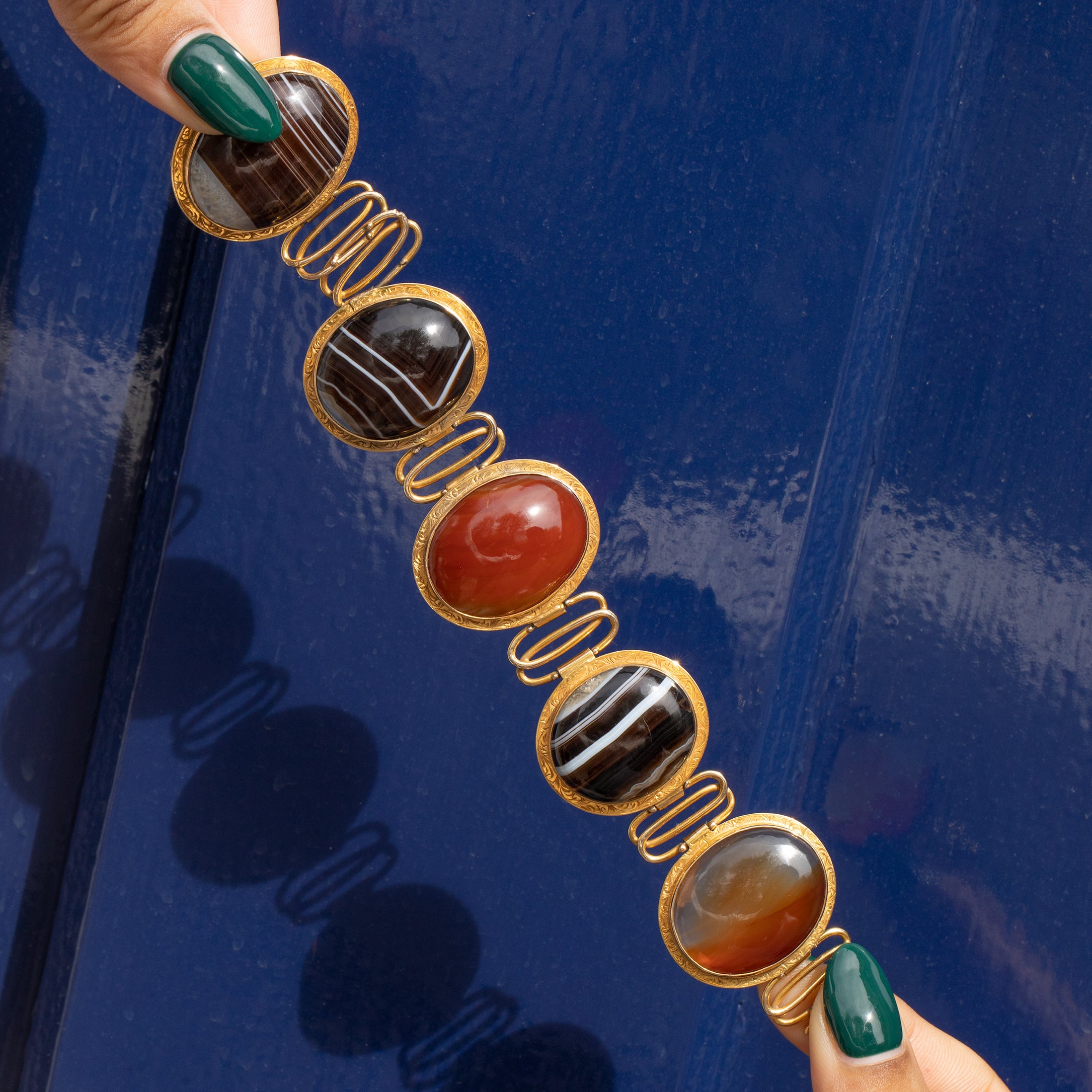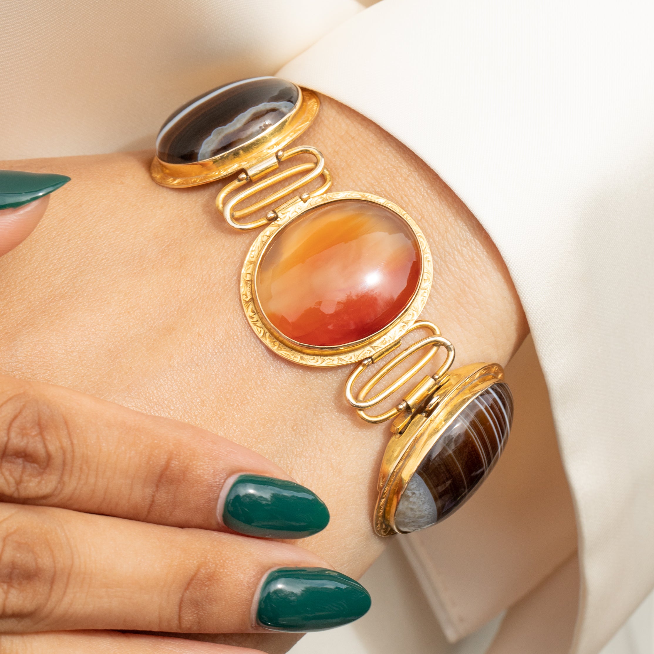 Inject some earthy Ahate glamour into your repertoire with this Georgian 18ct Gold Agate bracelet! Crafted from lush 18ct Gold this antique bracelet is a celebration of Mother Nature and exquisite craftsmanship, with its magnificent display of gemstones finely made links and hand-engraved details.