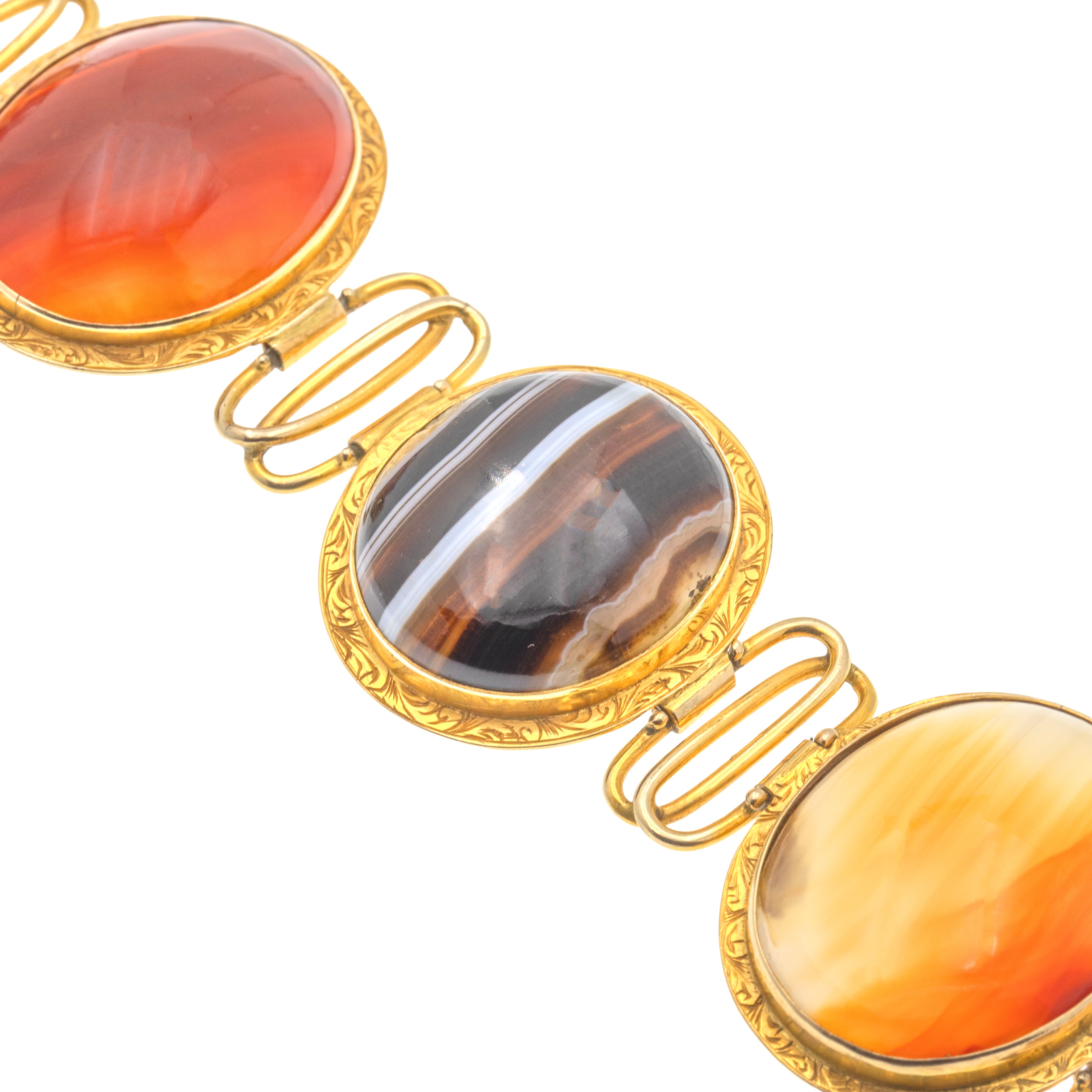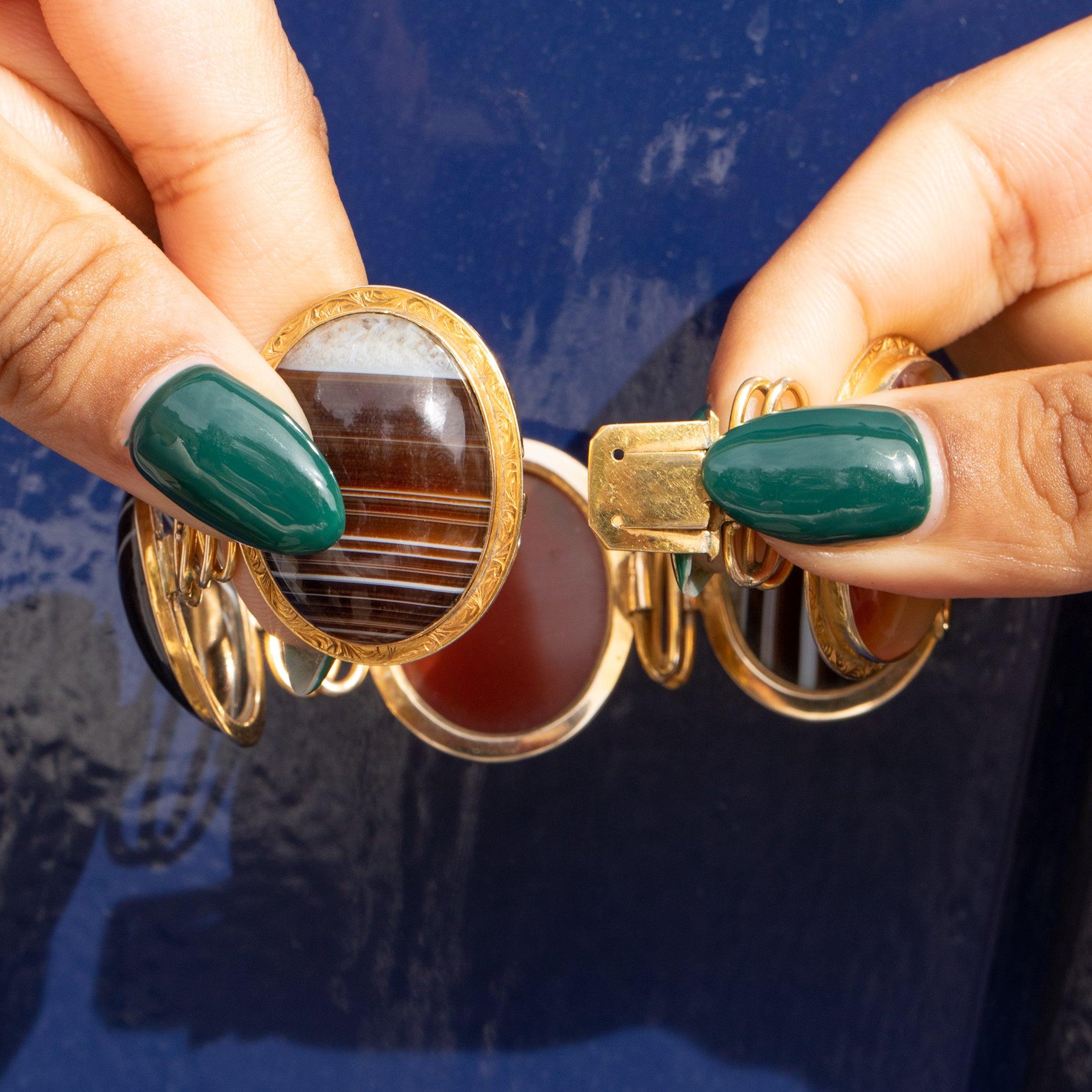 VERY GOOD-EXCELLENT. This late Georgian 18ct Gold Agate bracelet is in superb condition! No damage or repairs to note, all the sections are firm but articulate well to move with the movement of the wrist. The Agates and Carnelian are secure within their settings and the unique hand-engraved patterns of each gemstone are still crisp and catch the light as you move. With a fully functioning secure tongue clasp that shuts with a firm "click!" you can wear this enchanting Georgian bracelet with confidence!