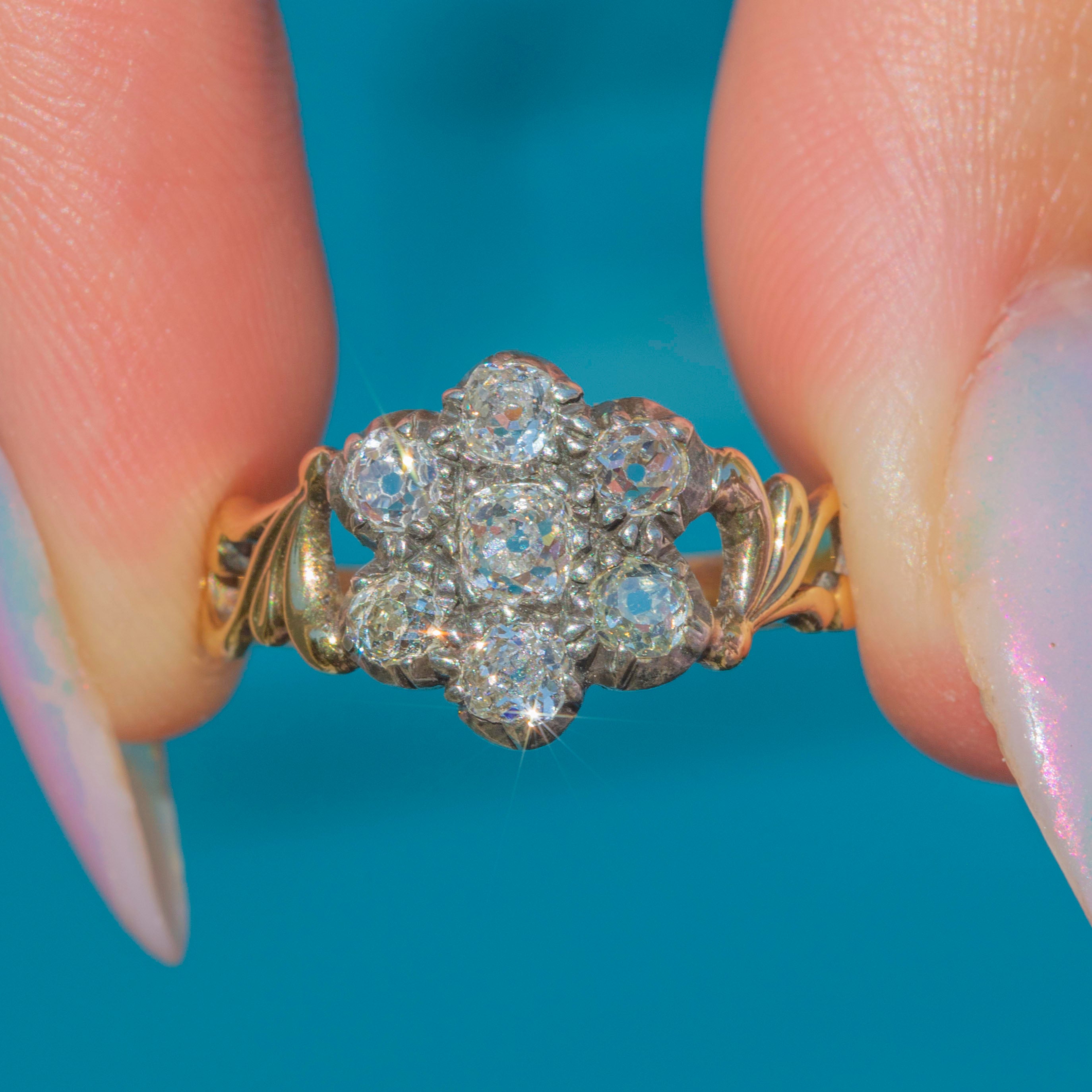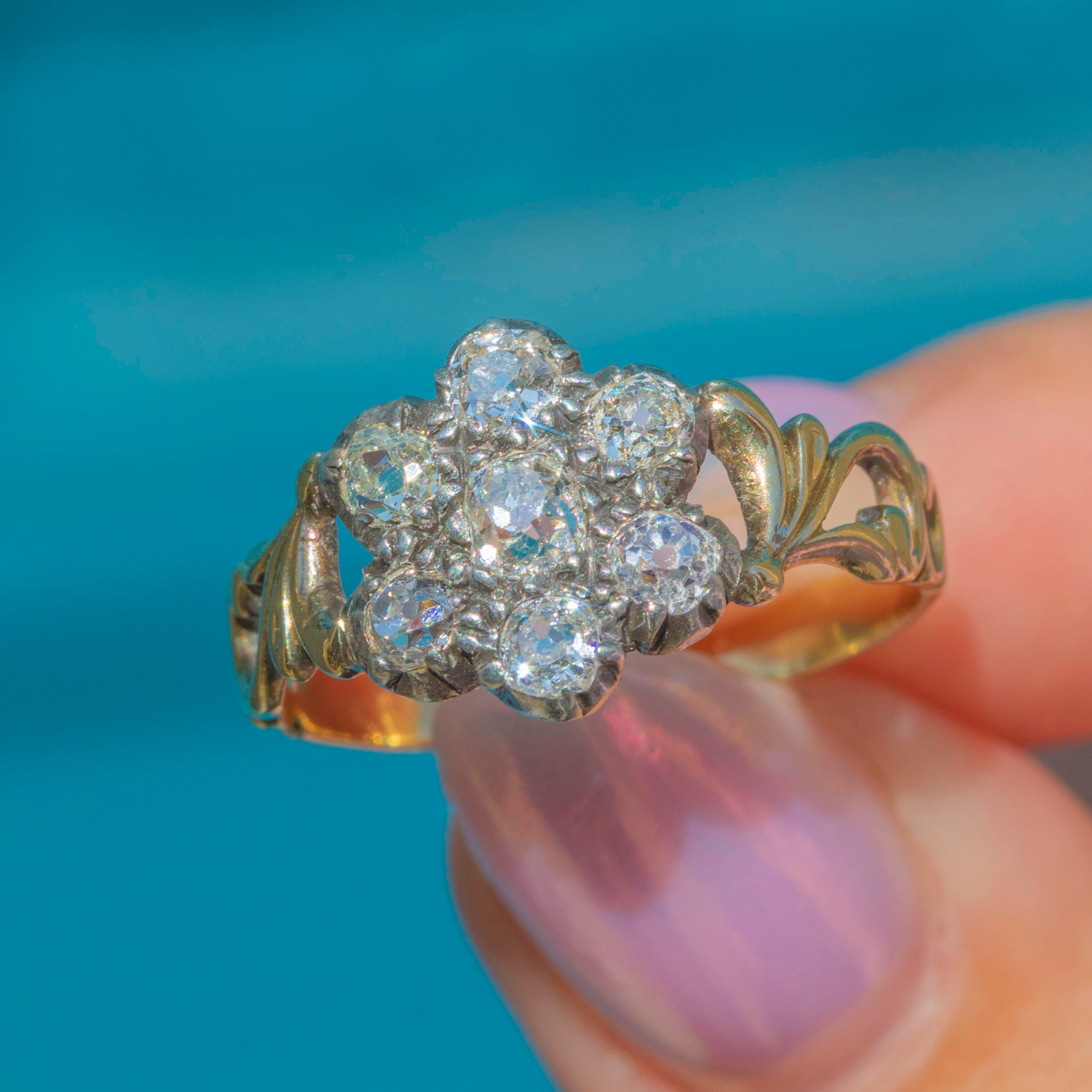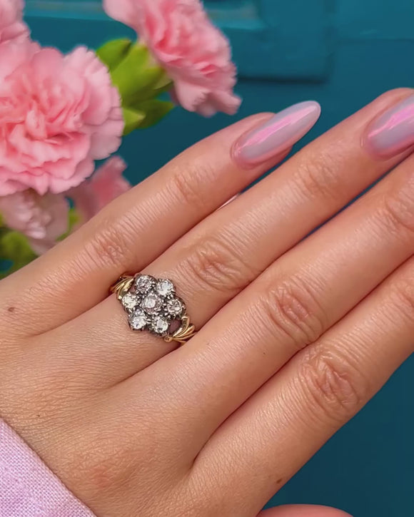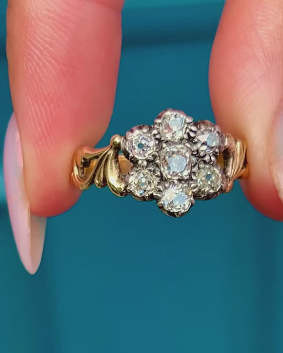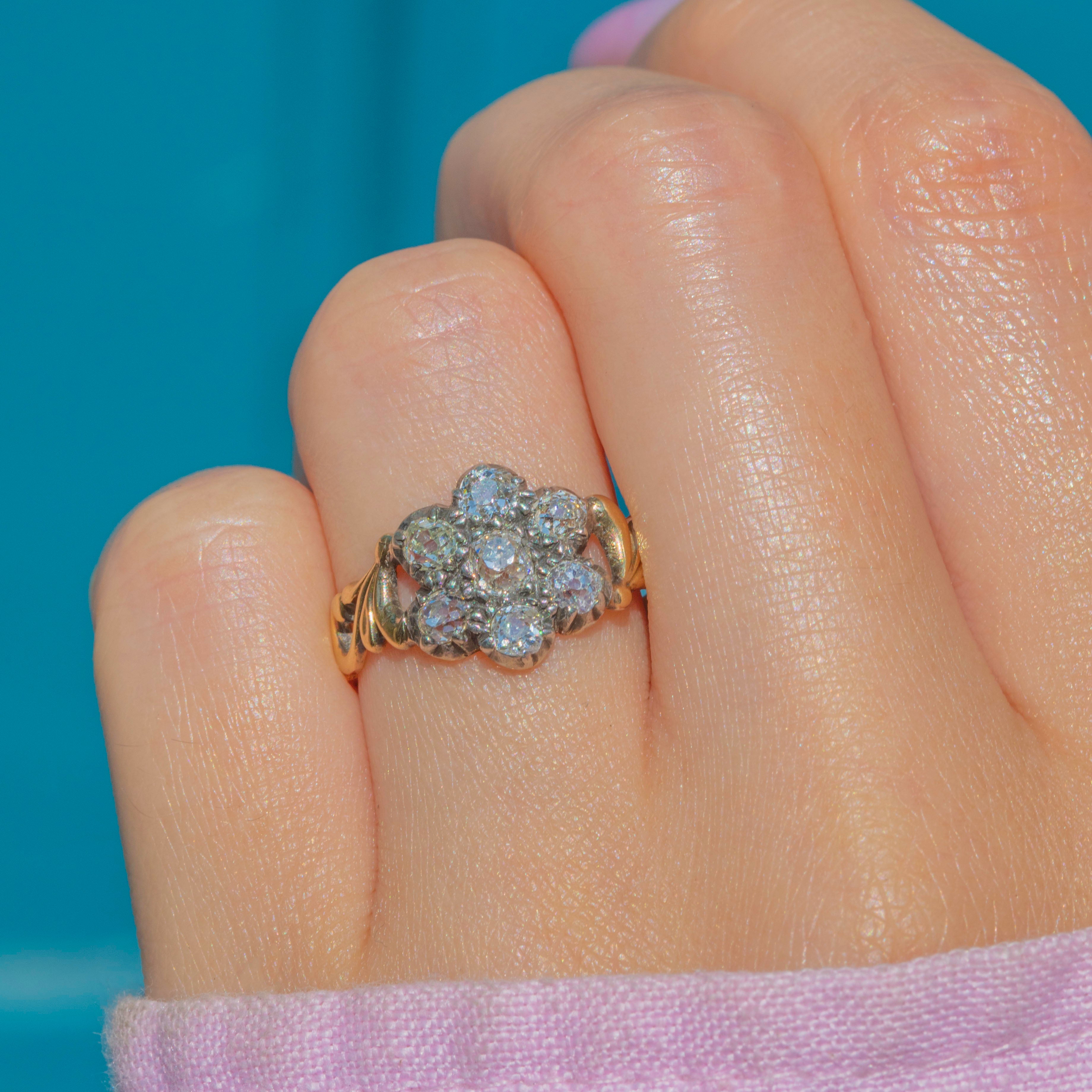 At its centre is a charming cluster of old-mine-cut Diamonds, totalling approximately 0.60ct, each set in traditional Silver piecrust settings to enhance their brilliance. The Diamonds sparkle with a warm, gentle glow characteristic of antique cuts, framed by an ornate 18ct Gold band with intricate detailing that adds a rich, decorative touch.