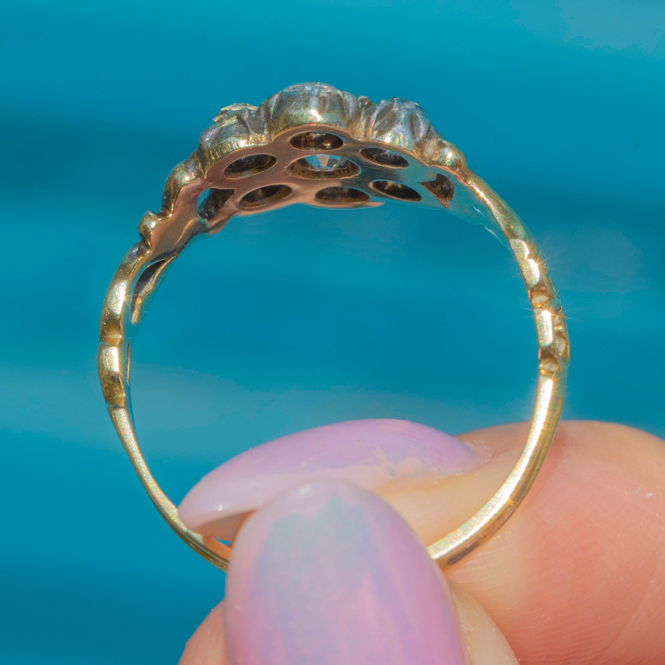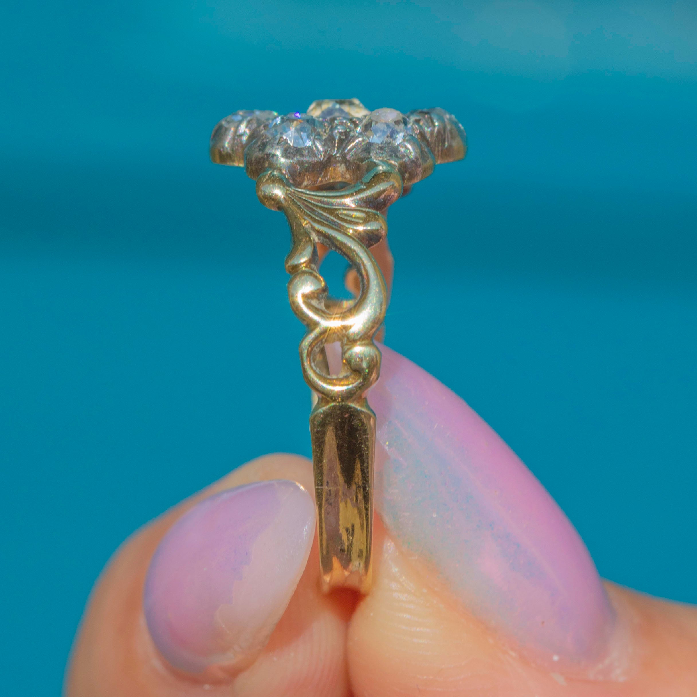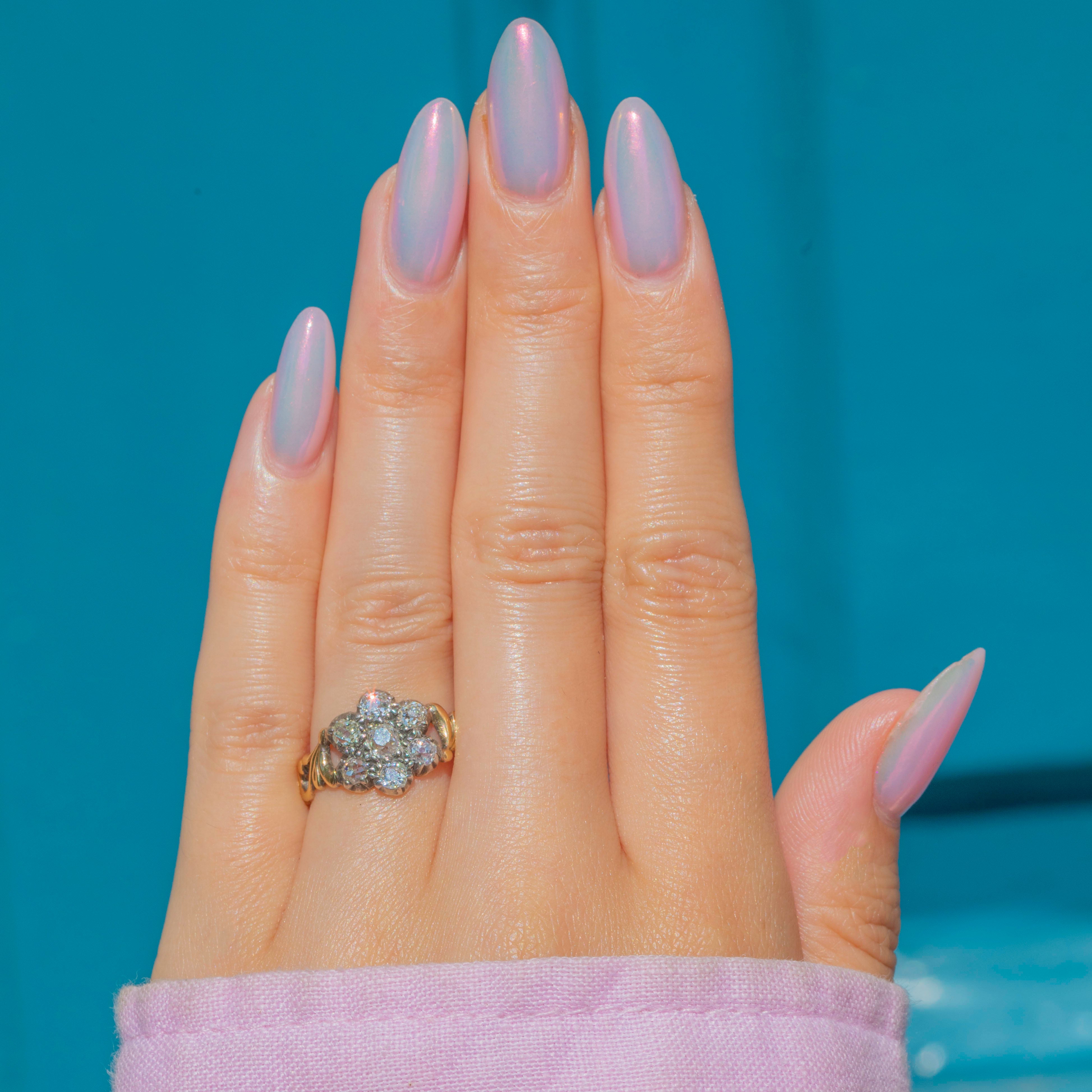 At its centre is a charming cluster of old-mine-cut Diamonds, totalling approximately 0.60ct, each set in traditional Silver piecrust settings to enhance their brilliance. The Diamonds sparkle with a warm, gentle glow characteristic of antique cuts, framed by an ornate 18ct Gold band with intricate detailing that adds a rich, decorative touch.