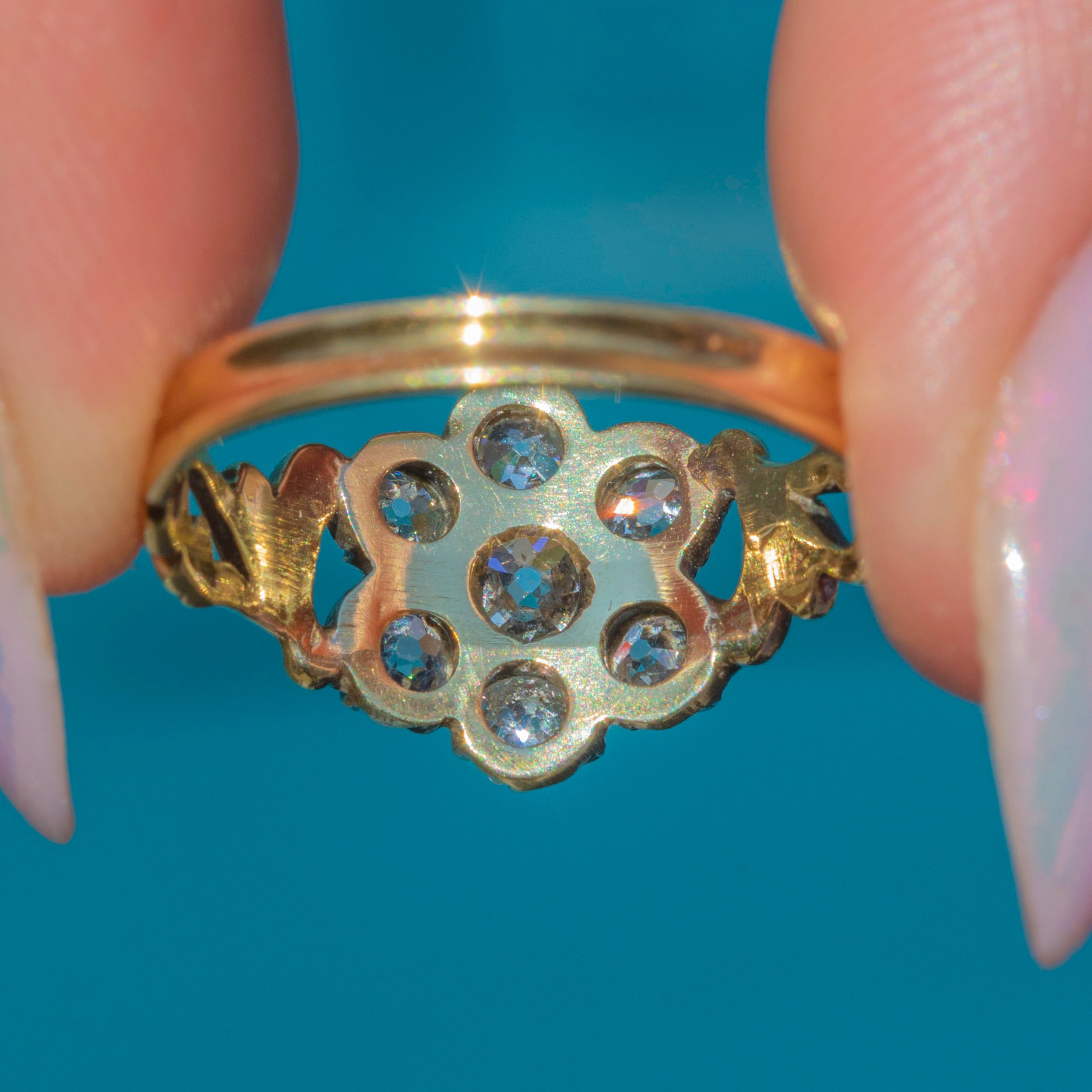 EXCELLENT: This Georgian ring is in excellent antique condition, especially when considering its impressive age. The Diamonds are bright and securely set, with no visible fleabites or abrasions. The Silver piecrust settings have accrued a light patina, adding to the ring's antique charm. The 18ct Gold is buttery and the detailed shoulders have remained defined, with a smooth Gold band providing comfortable and secure wear.