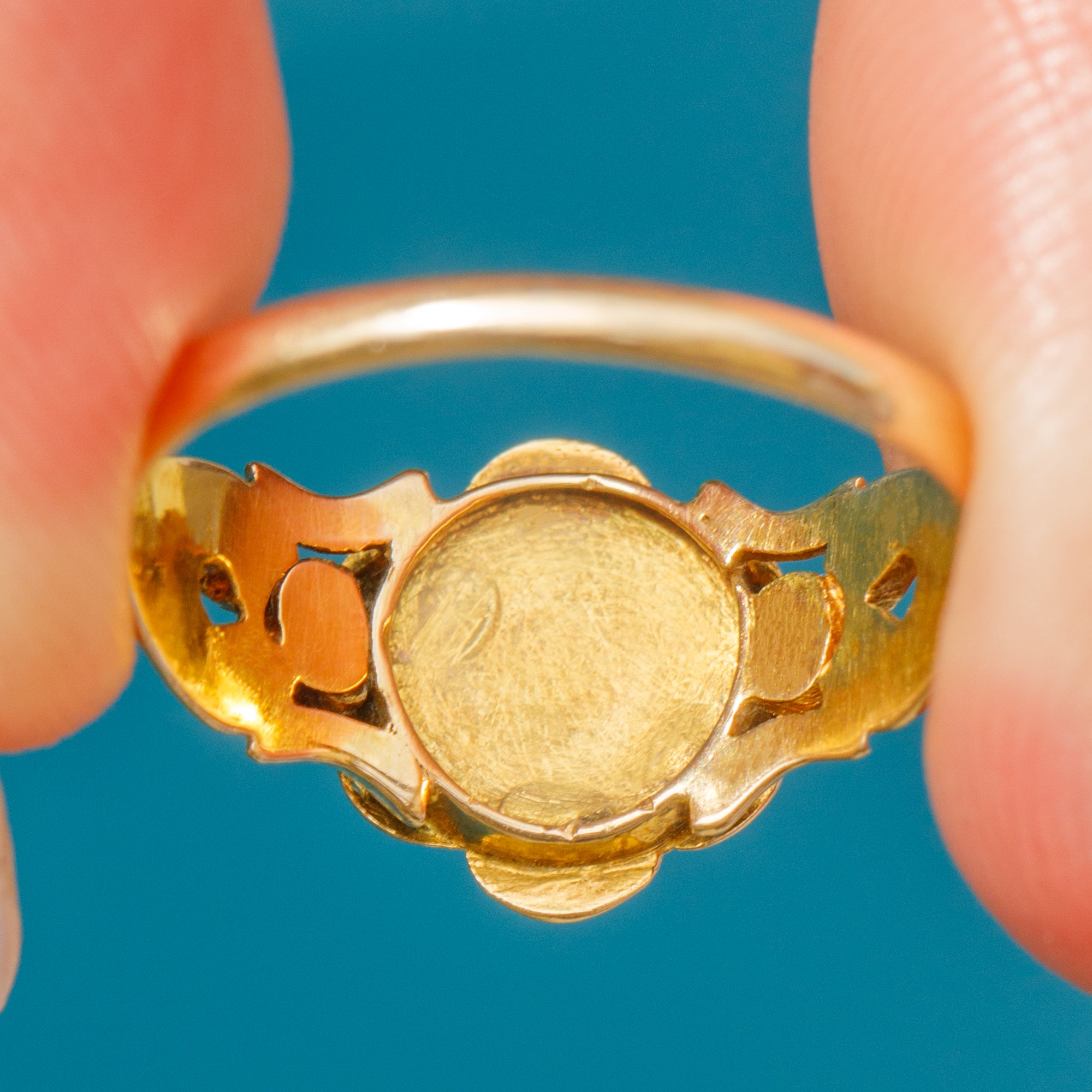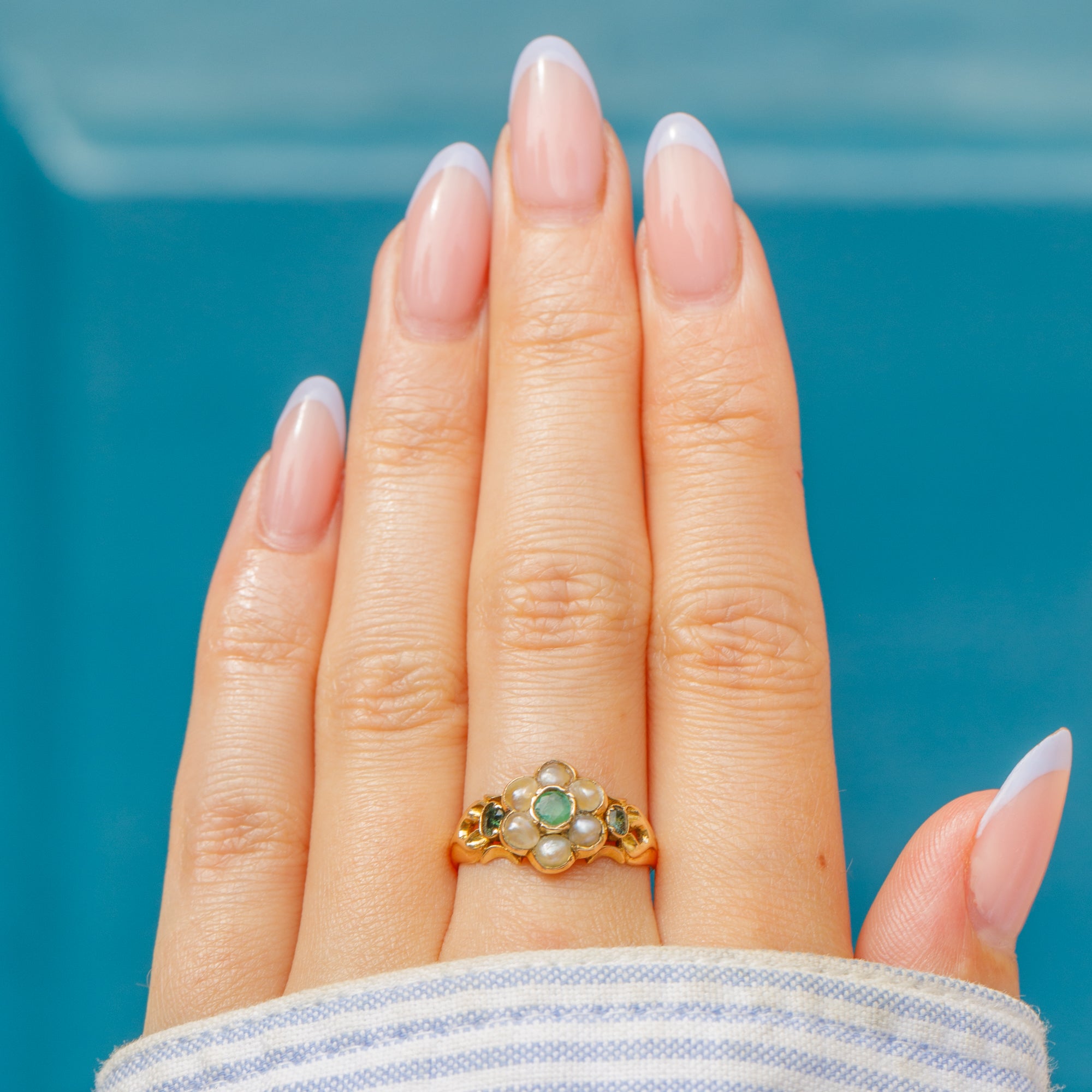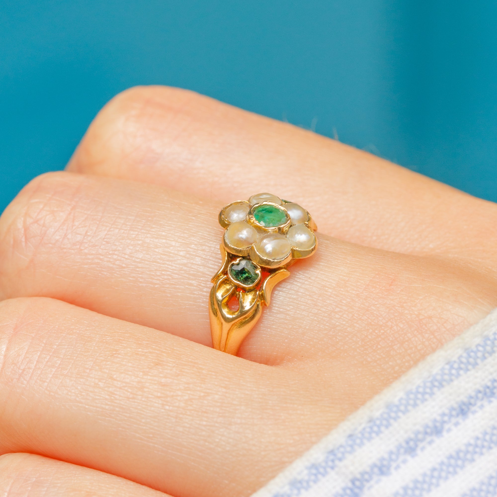 The 18ct Gold wraps elegantly around the finger, with its curvaceous lines and intricate details bringing bundles of charm. This Georgian Emerald & Pearl ring has a great presence and provides wonderful coverage as she adorns your hand!