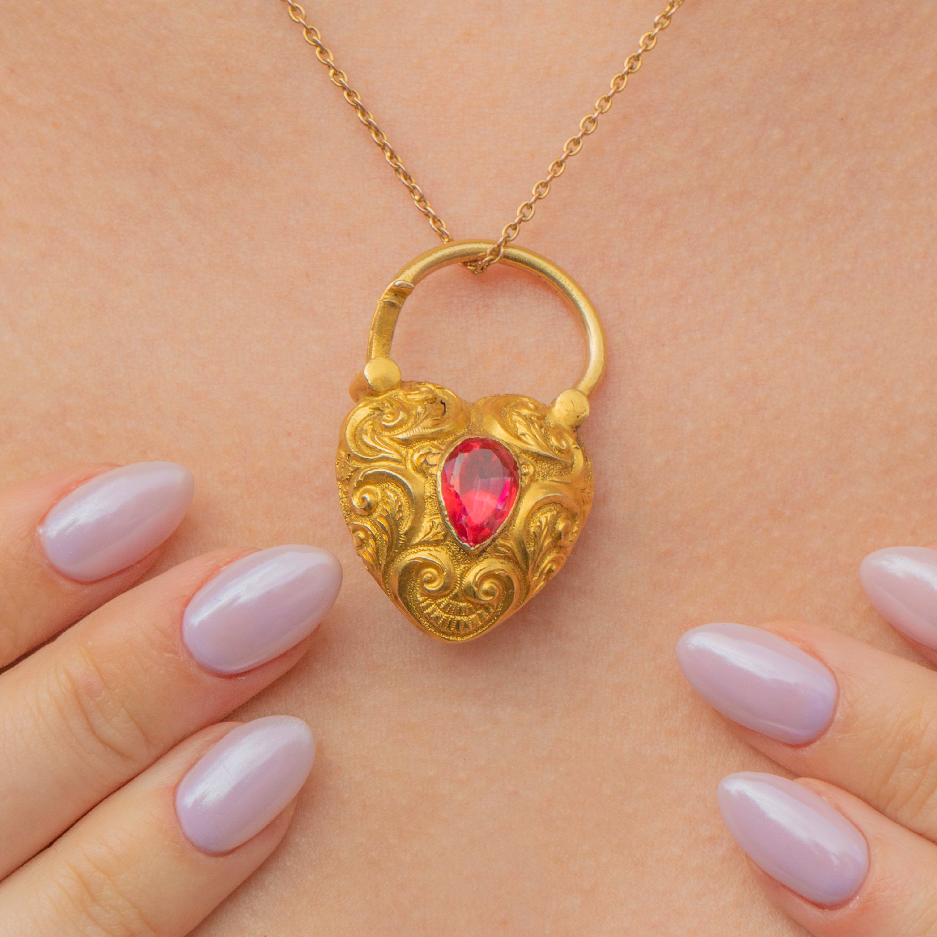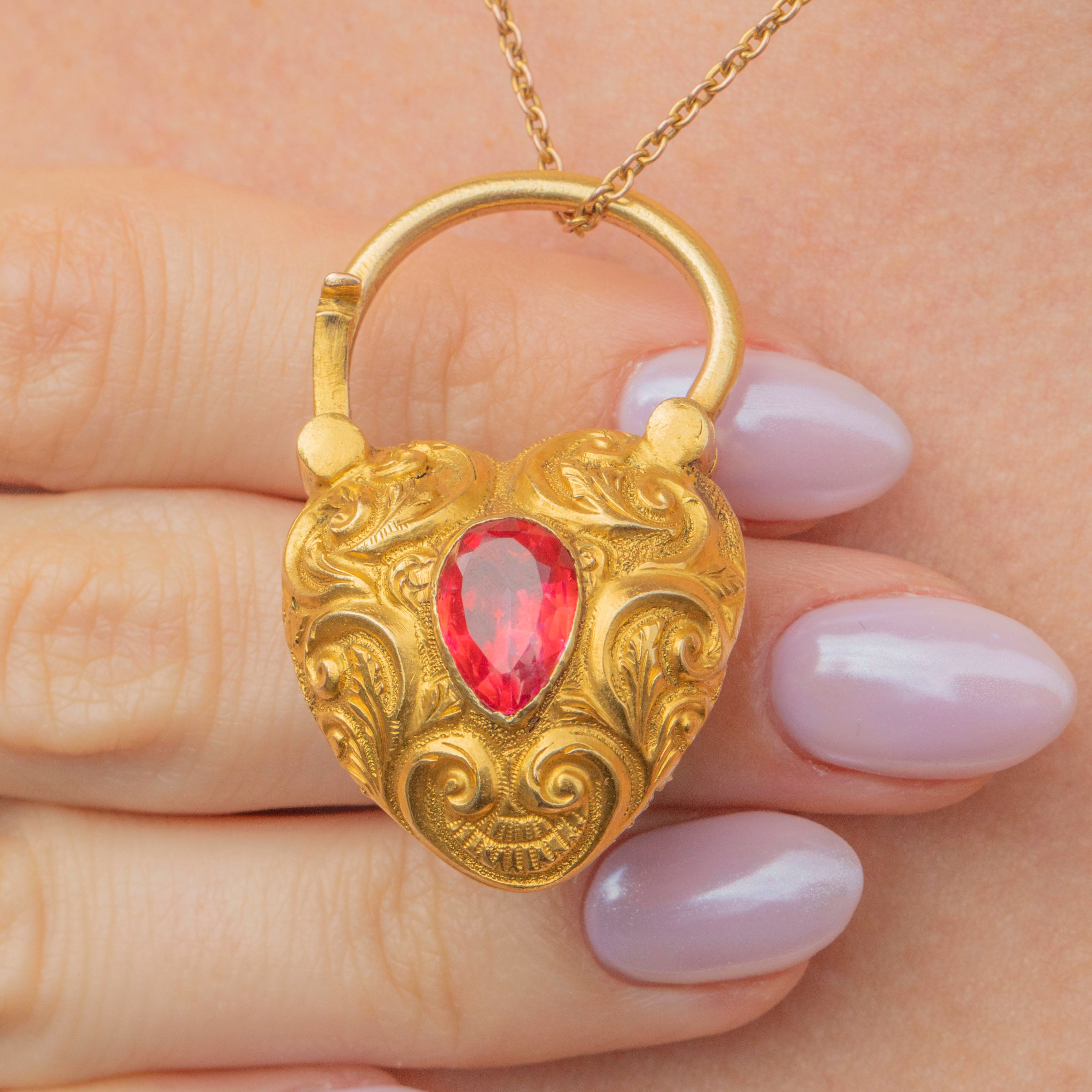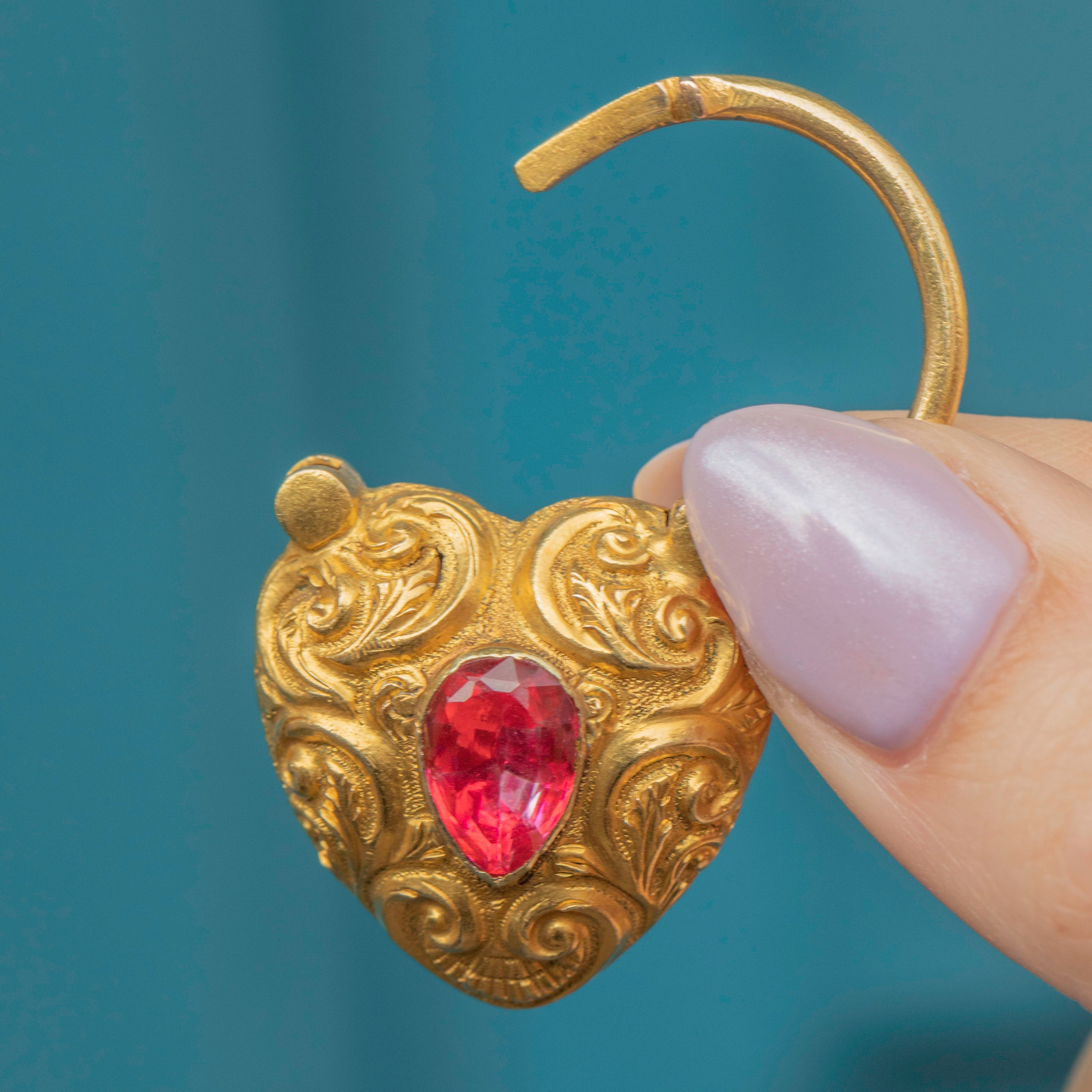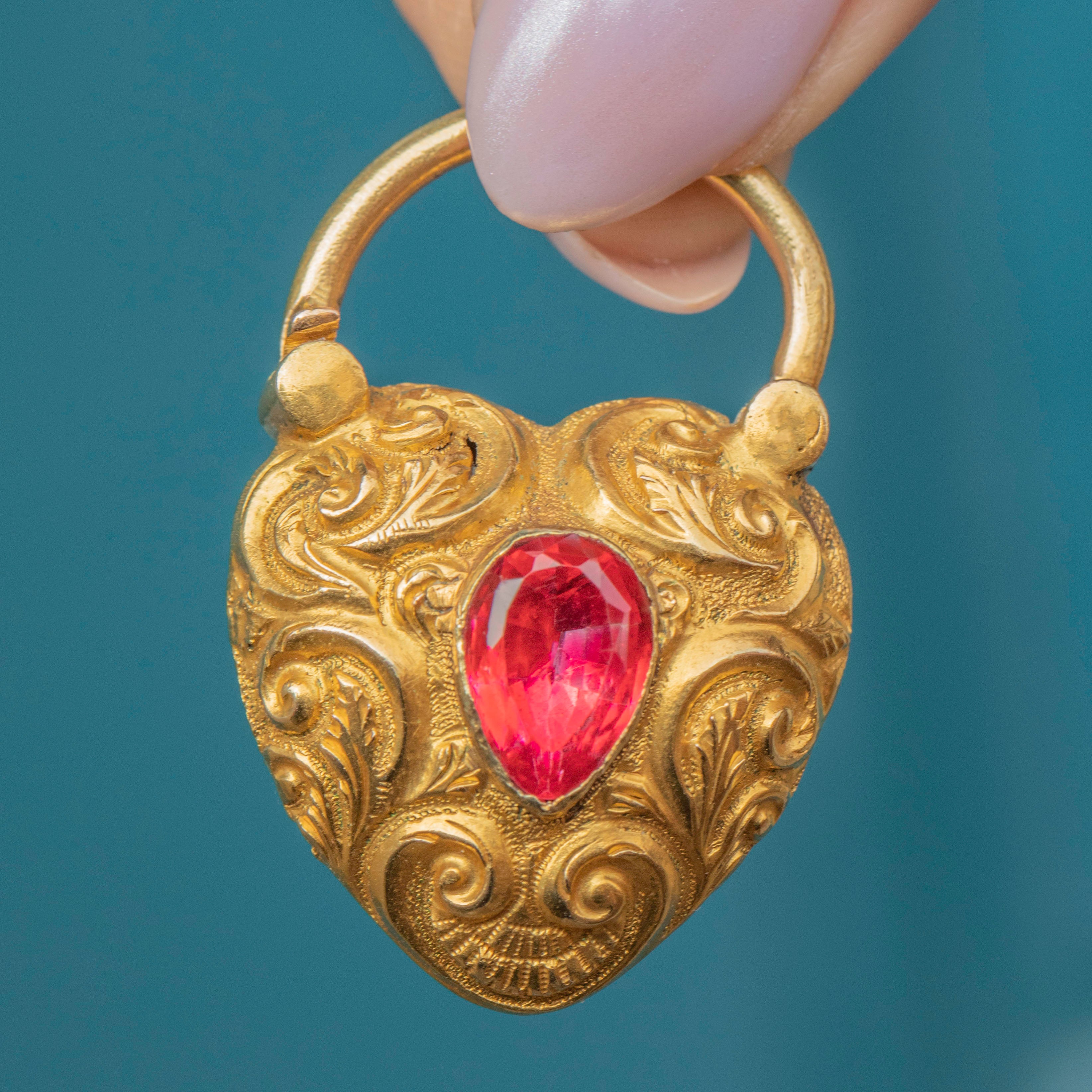 VERY GOOD. This Georgian 18ct Gold Foiled Topaz repoussé heart padlock is in splendid condition, especially when considering her grand age. Her Topaz is excellently foiled and has the most magnificent deep pink tone. While her Topaz does have a little nibble on a left sided facet, this is only visible under close inspection.