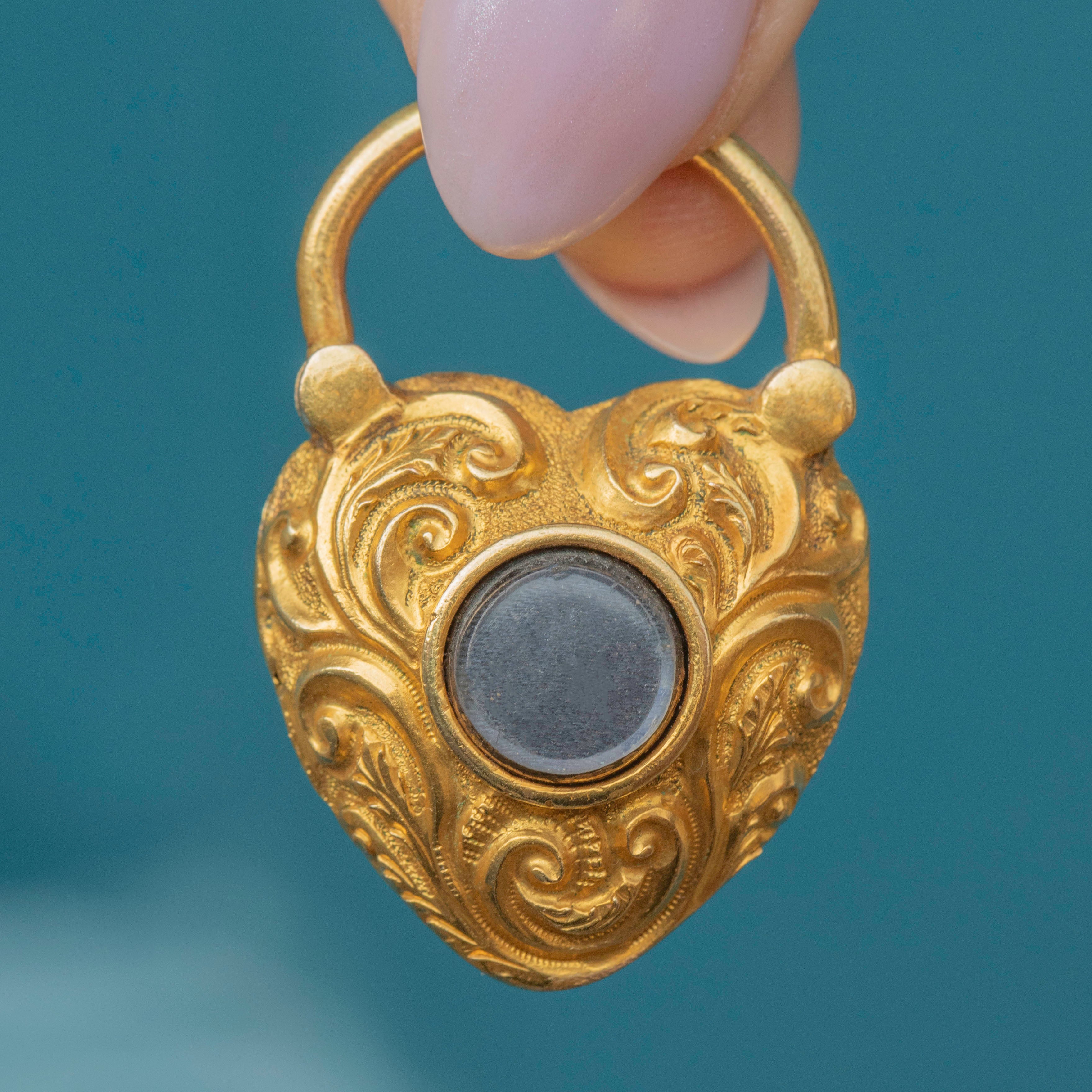 Prepare to be blown away by this Georgian 18ct Gold foiled Topaz repoussé heart padlock. Crafted from resplendent 18ct Gold, her heart is joyful and intricate with acanthus leaf engravings that will capture your heart!