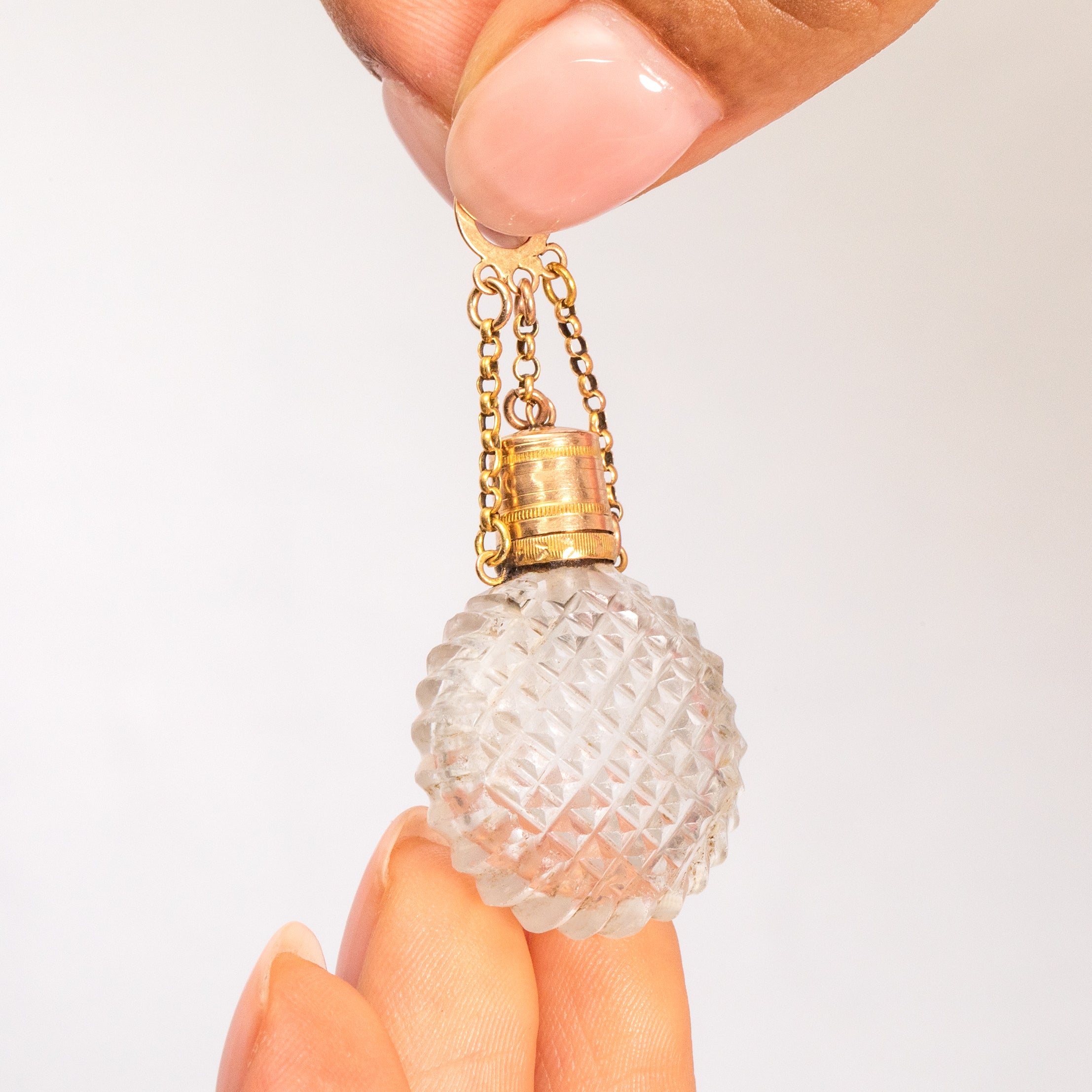 EXCELLENT. This Georgian 18ct Gold glass scent bottle is just delightful. In excellent condition overall, this piece has very little sign of wear and is complete with a stopper so your perfume will be held securely inside. It;s in incredible condition for her age!