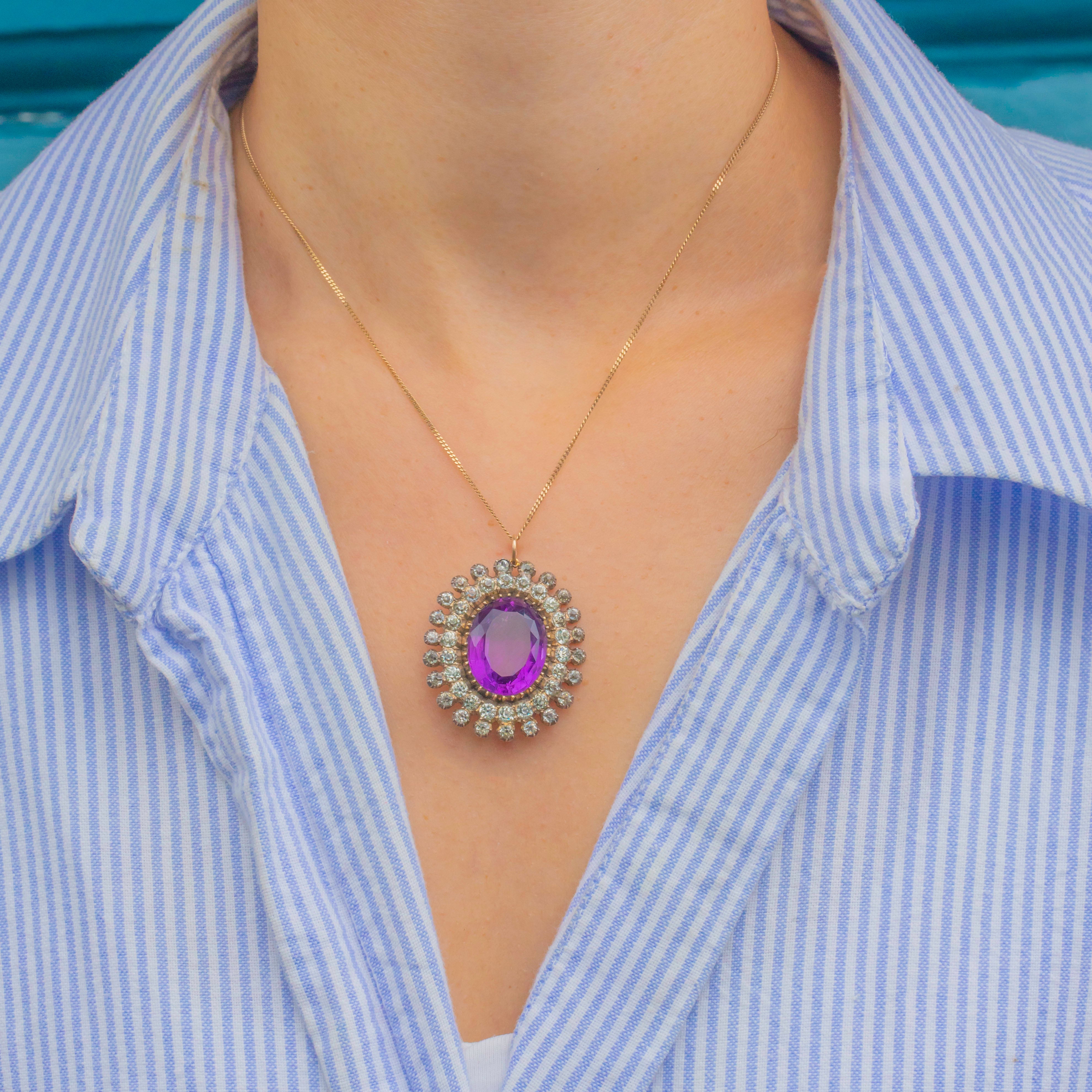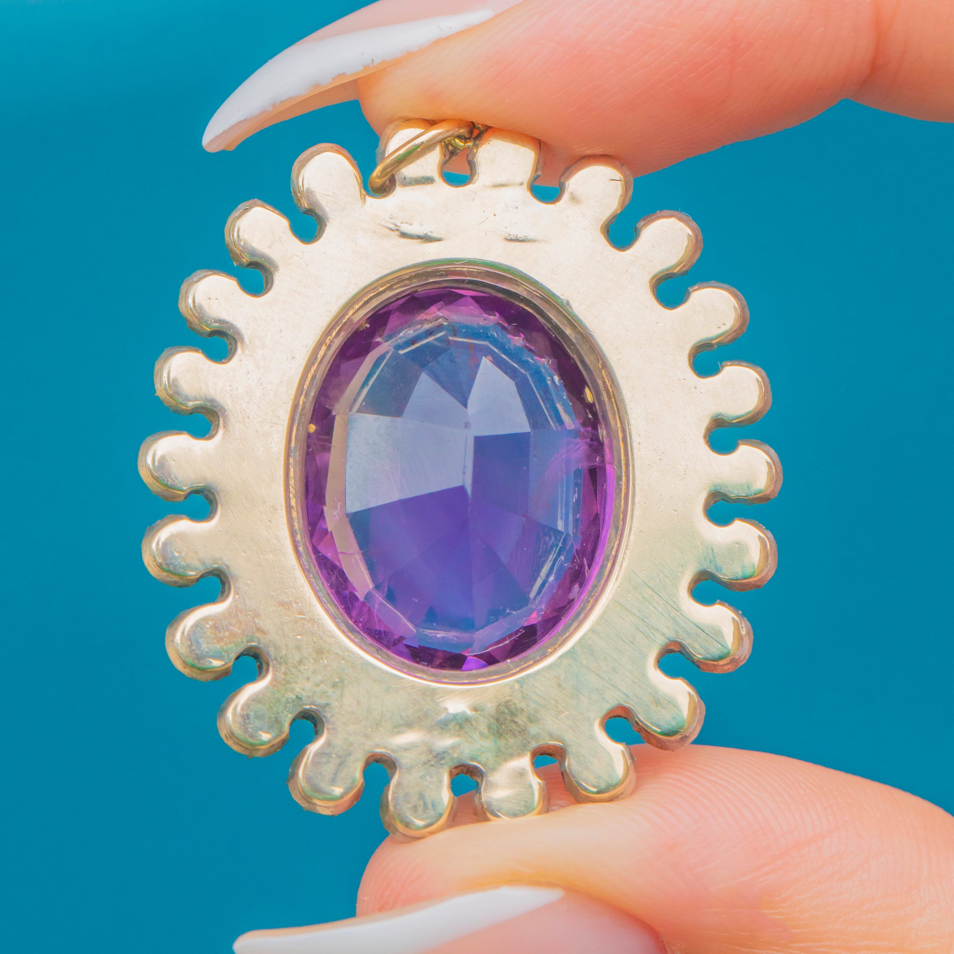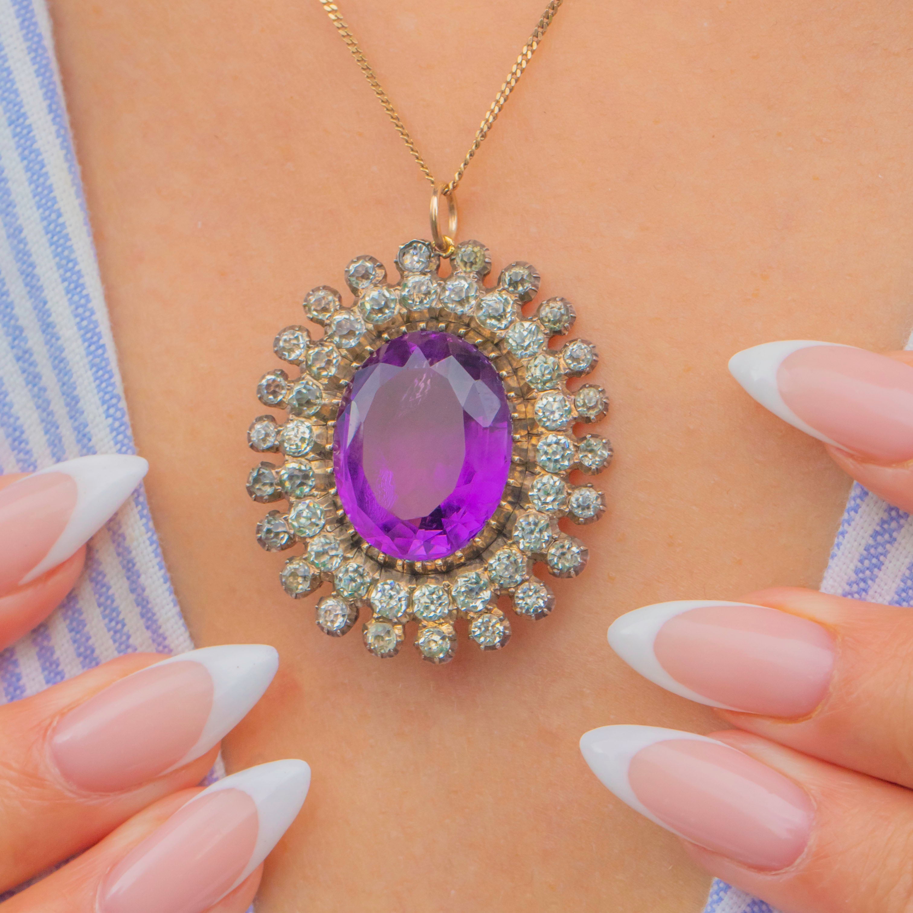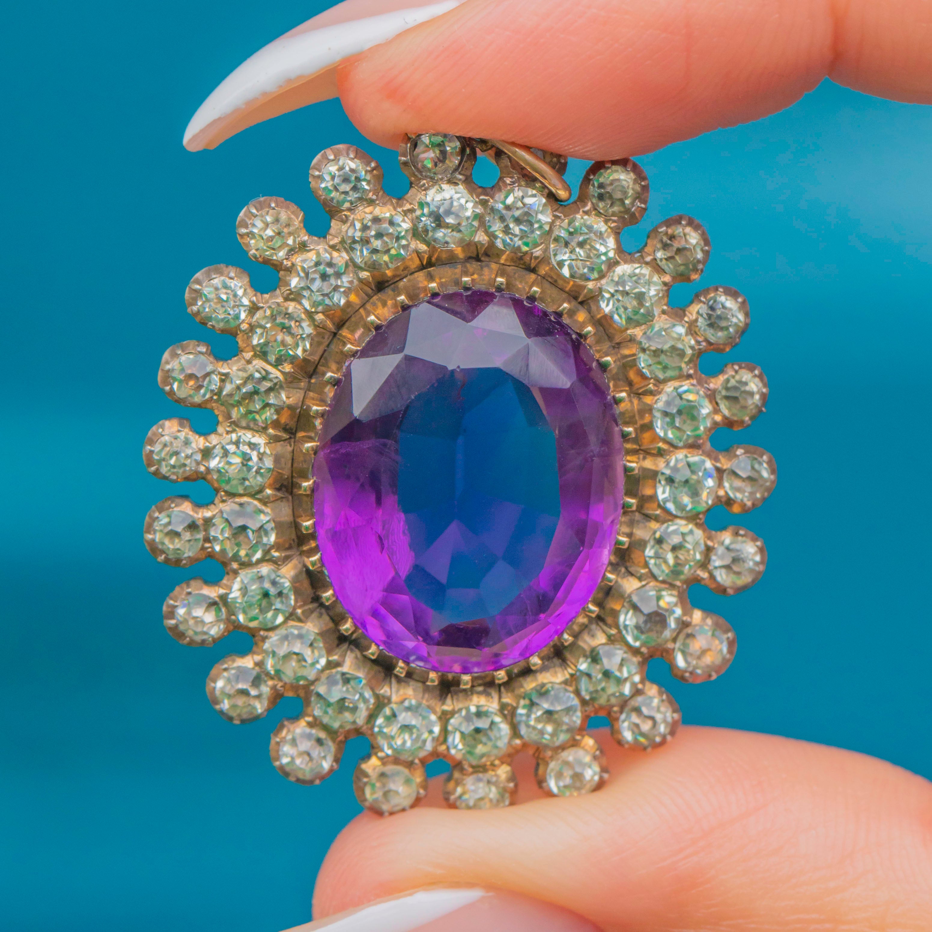 A spectacular late Georgian pendant featuring a vivid natural Amethyst framed by a double halo of classic black-dot Paste. The oval centre is secured by 9ct Gold claws and mounted to a thick Gold back with a sturdy jump ring, while the Paste halo sits in crimped Sterling Silver settings—textbook c.1800–1820 construction. Glorious colour, crisp scalloped halos, and that desirable Gold-backed/Silver-front build make this an exceptional survivor.