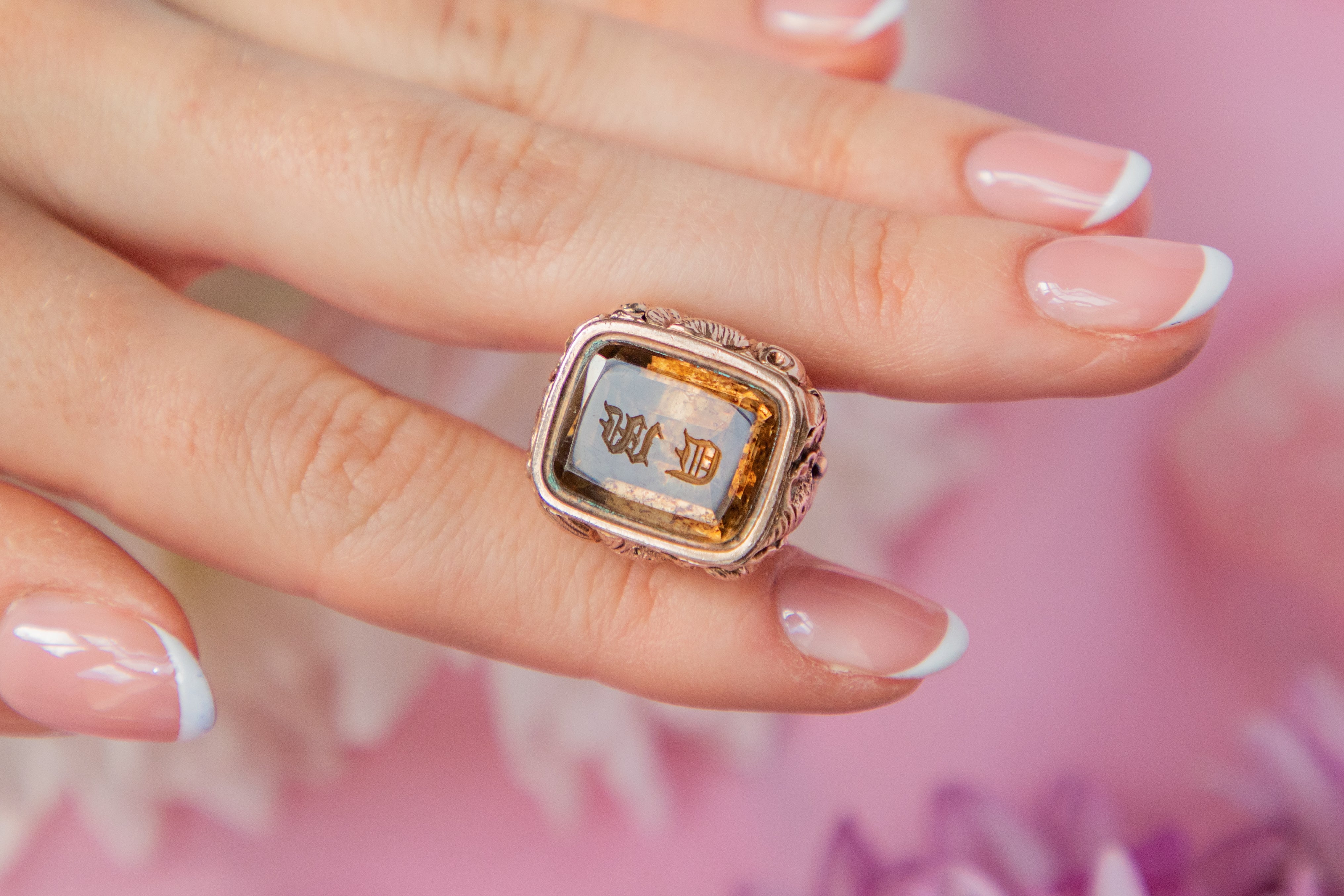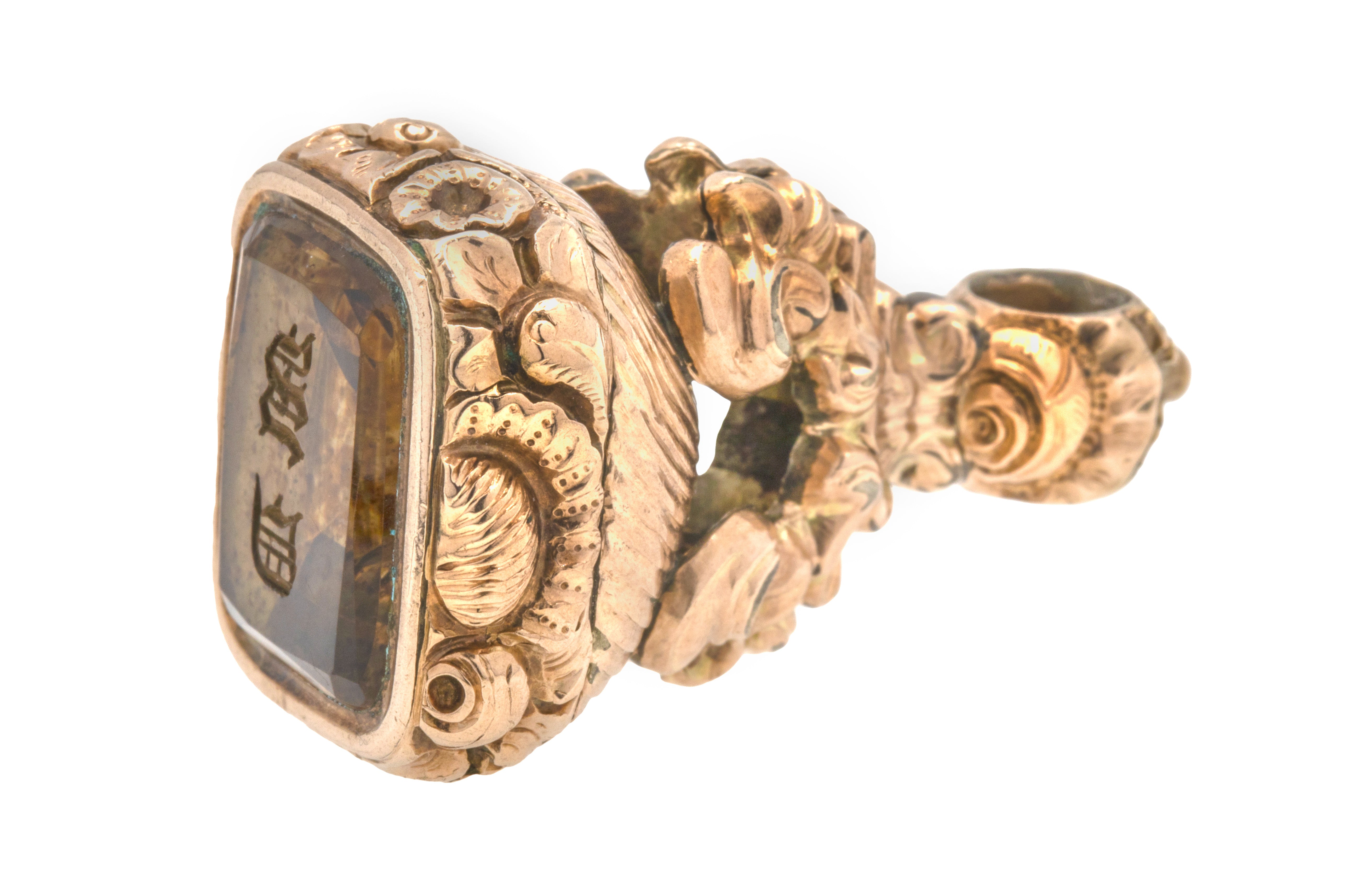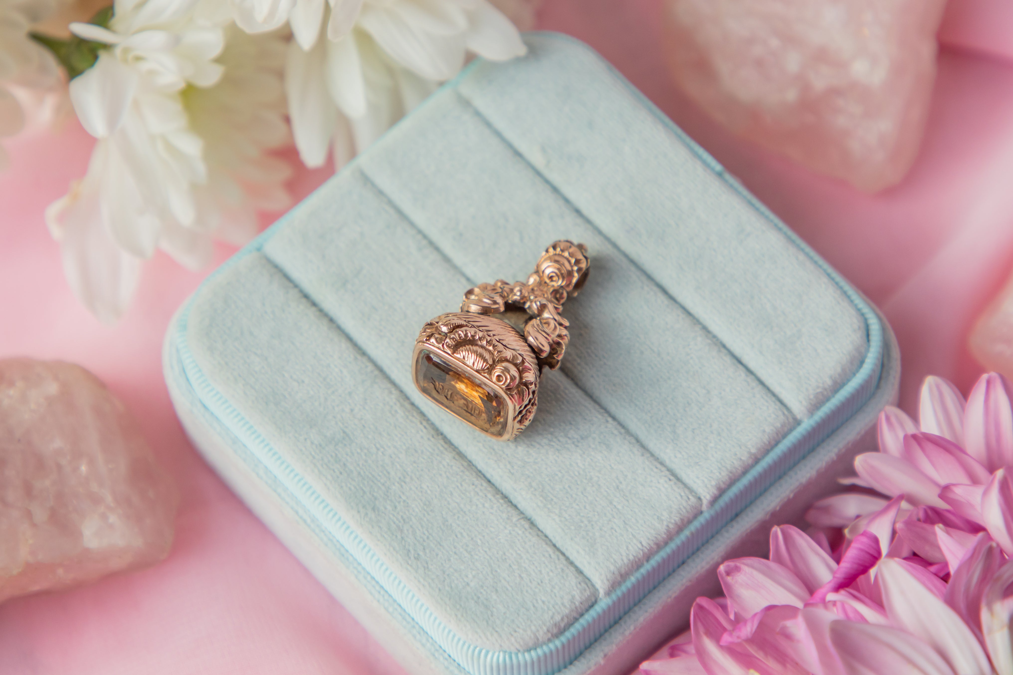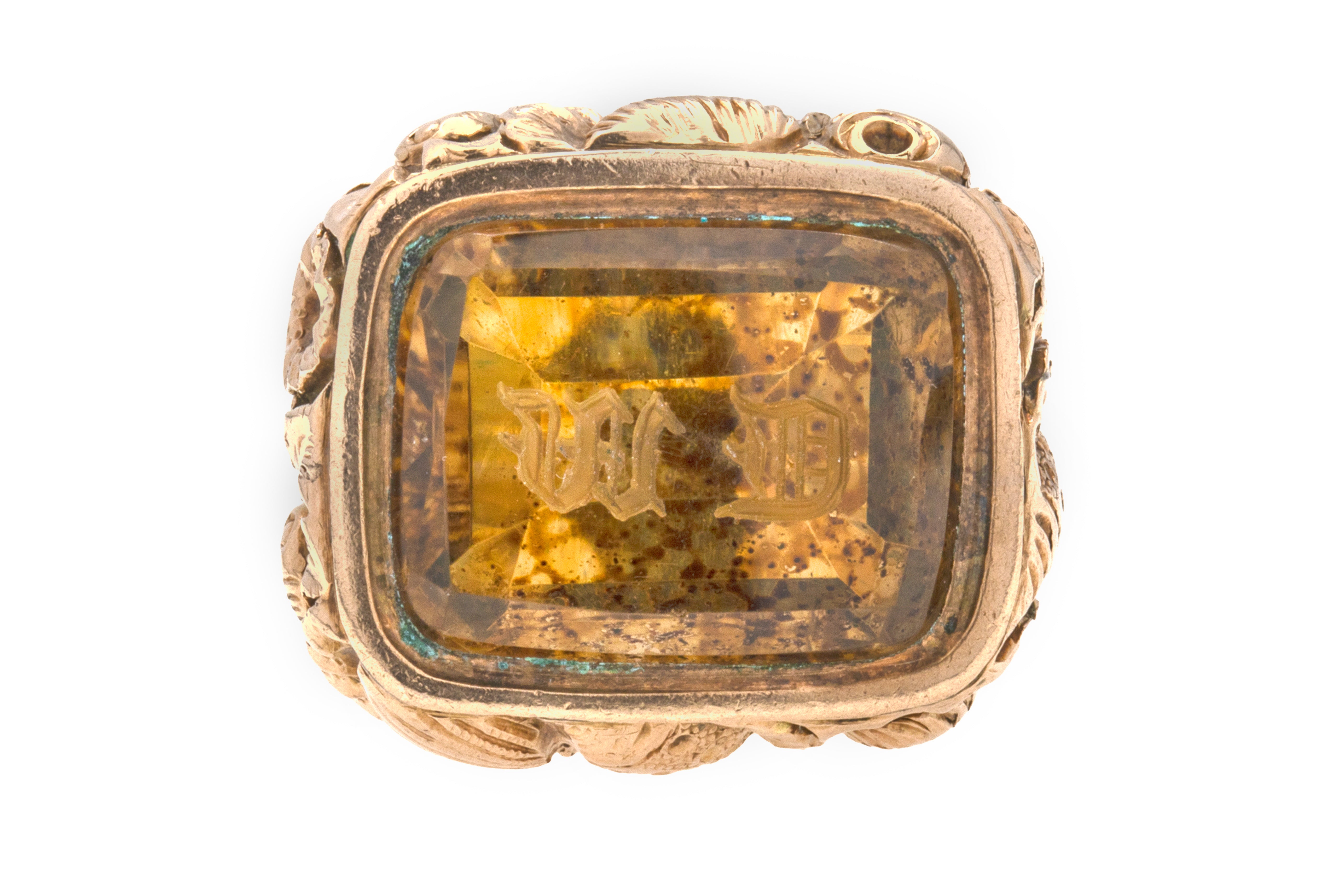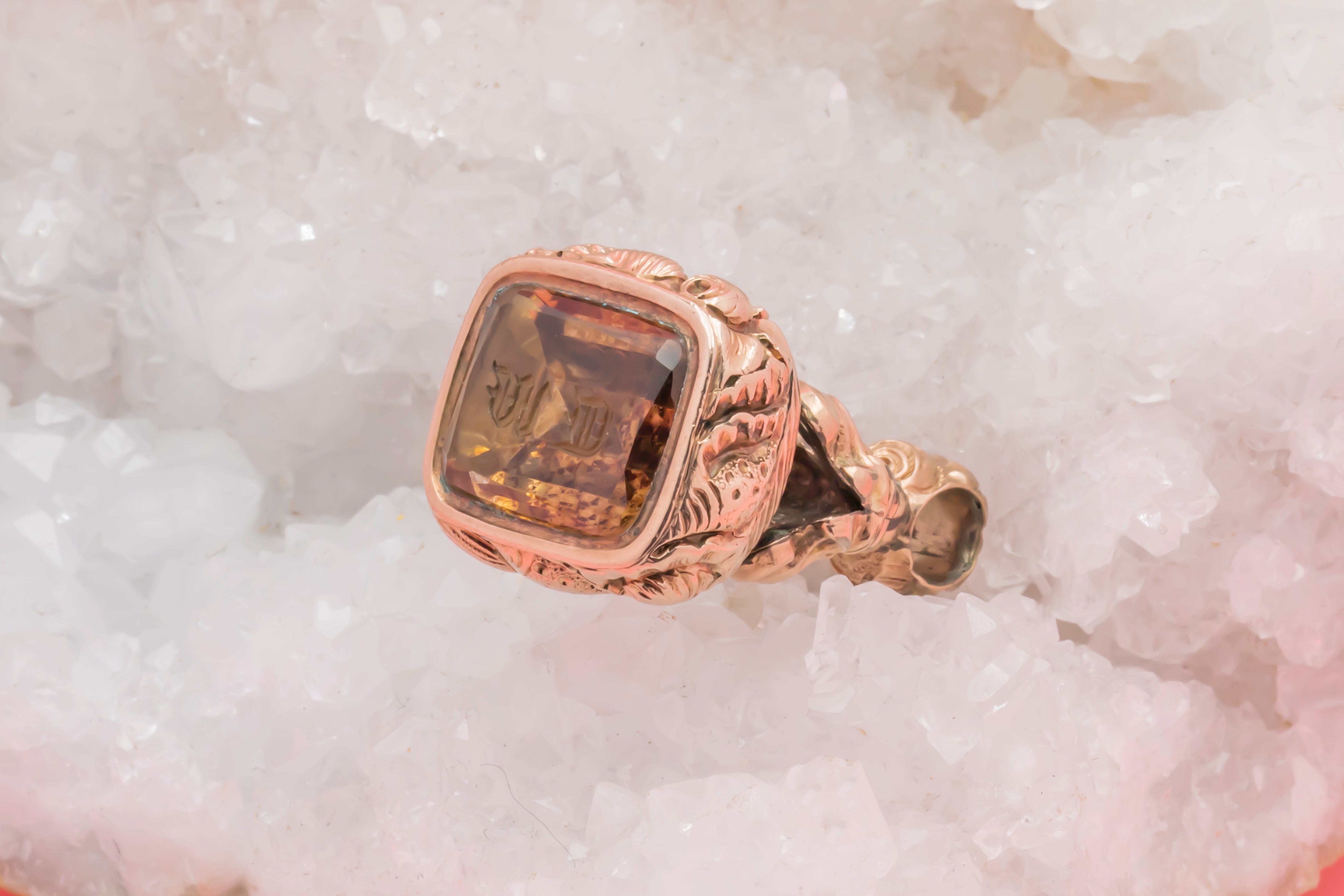 Make this Georgian 9ct Gold cased Citrine fob your newest muse. Finely crafted and intricately detailed, this Georgian fob beautifully encases a maple-hued Citrine gem engraved 'M' and 'D'!