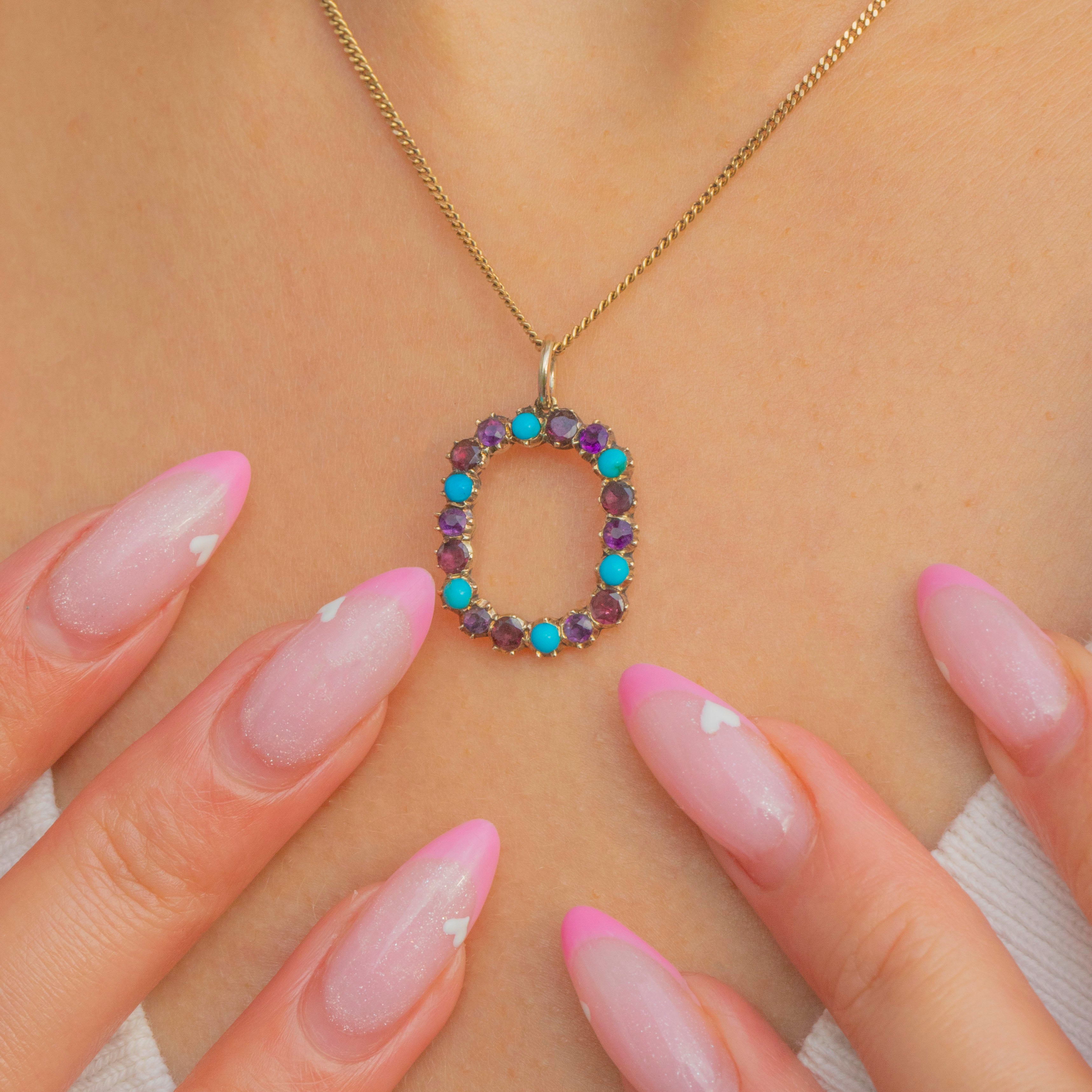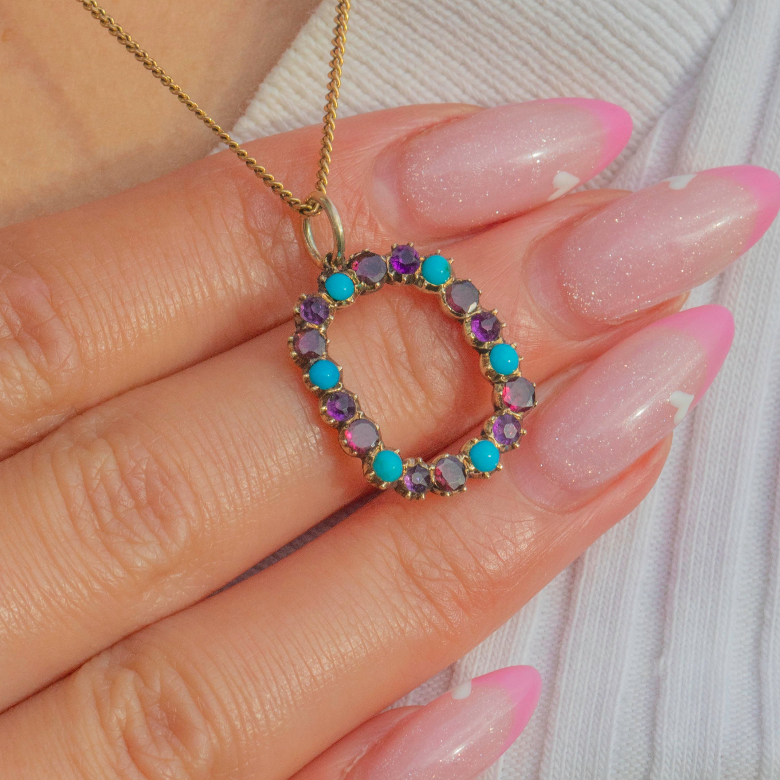 This delicate Georgian pendant dates to the early 19th century and beautifully combines deep red Garnets with bright Turquoise cabochons- a classic colour pairing much loved in Georgian jewellery.