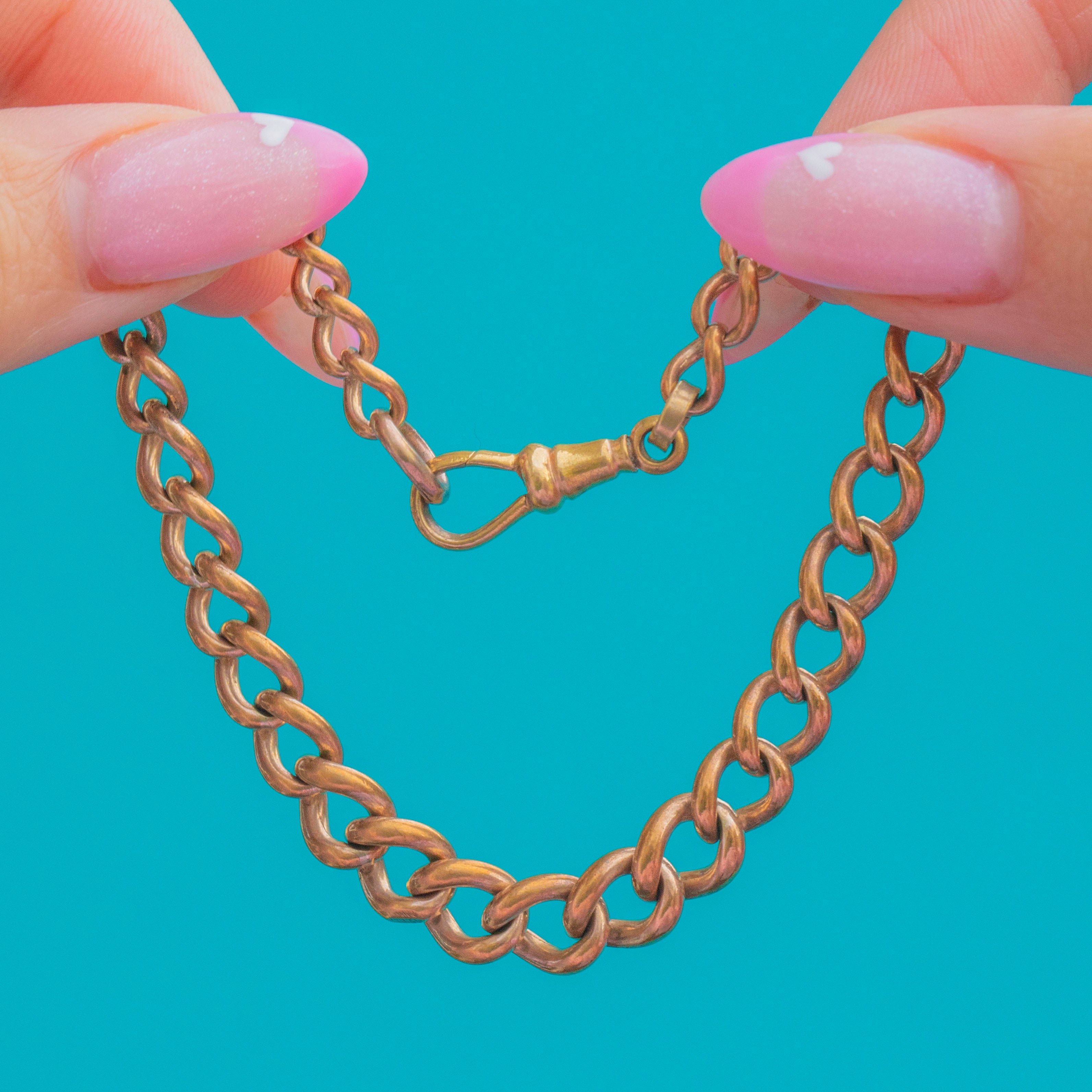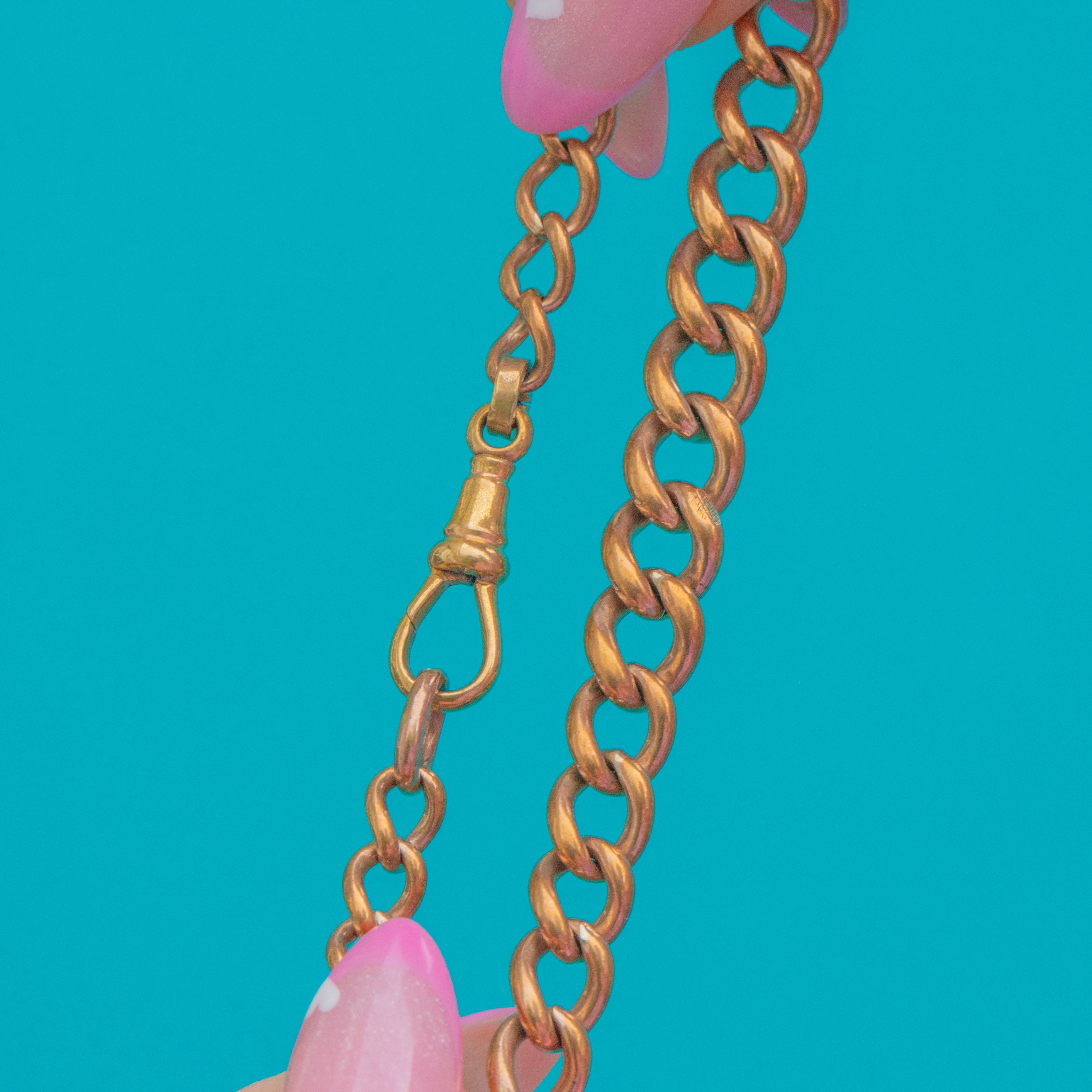 EXCELLENT: The links are smooth and even with a rich Gold-toned finish. The dog-clip clasp is in full working order and closes securely. Gentle age-related wear consistent with Victorian use, adding to its antique charm.