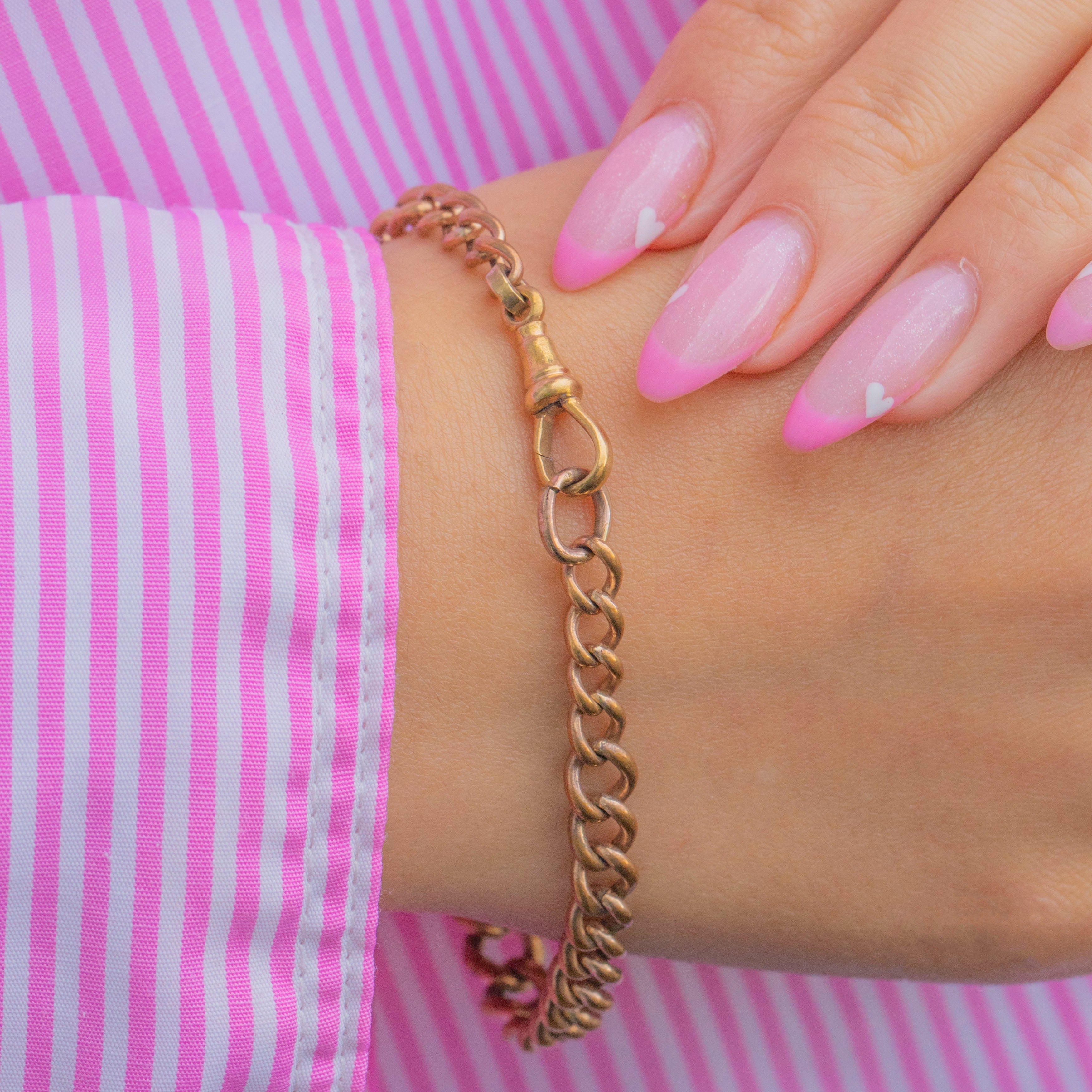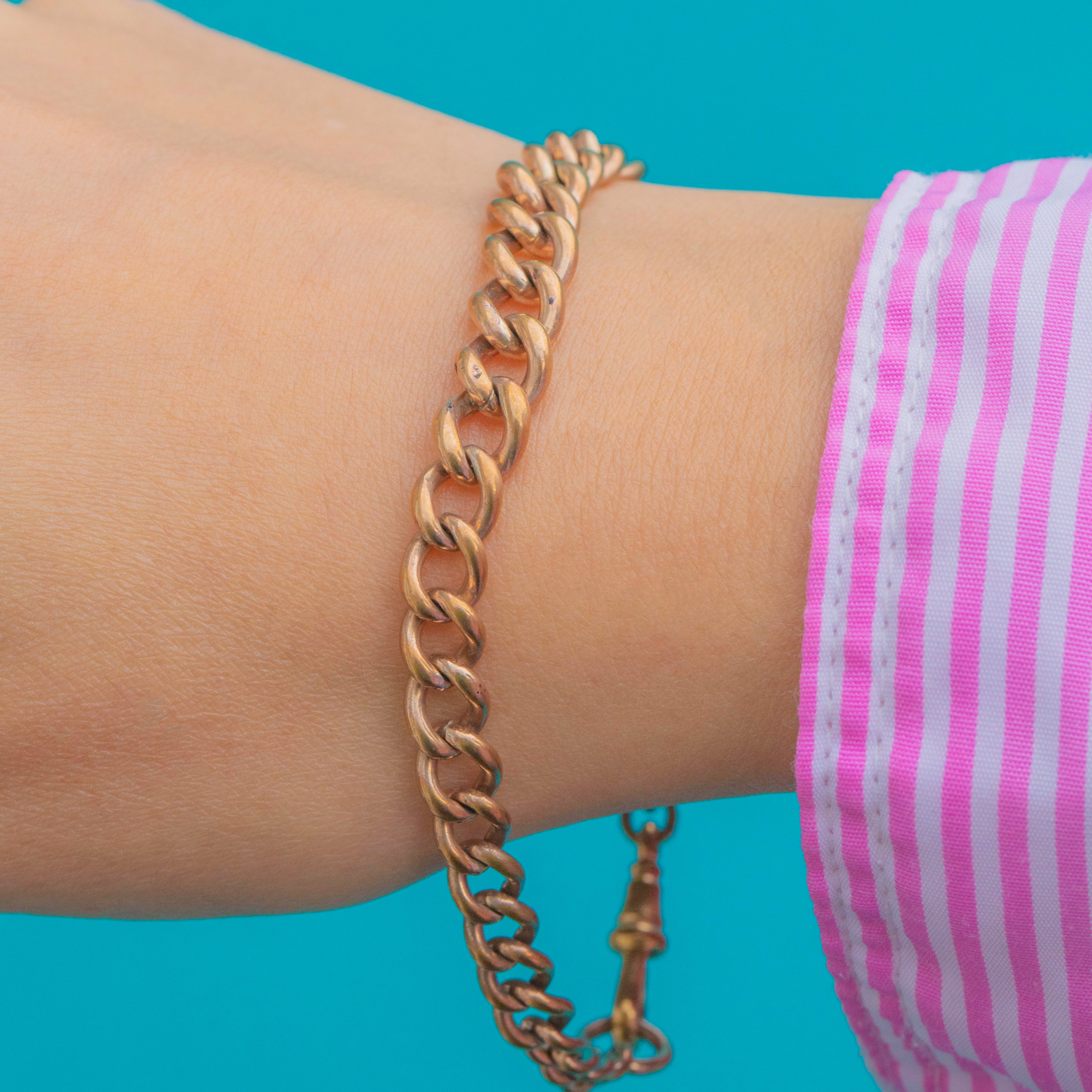 A lovely Victorian curb link bracelet with a warm Gold-toned finish and a classic dog-clip clasp. The solid, tactile links and subtle antique patina make this piece effortlessly wearable, whether stacked with other chains or suspending a charm from its dog clip.