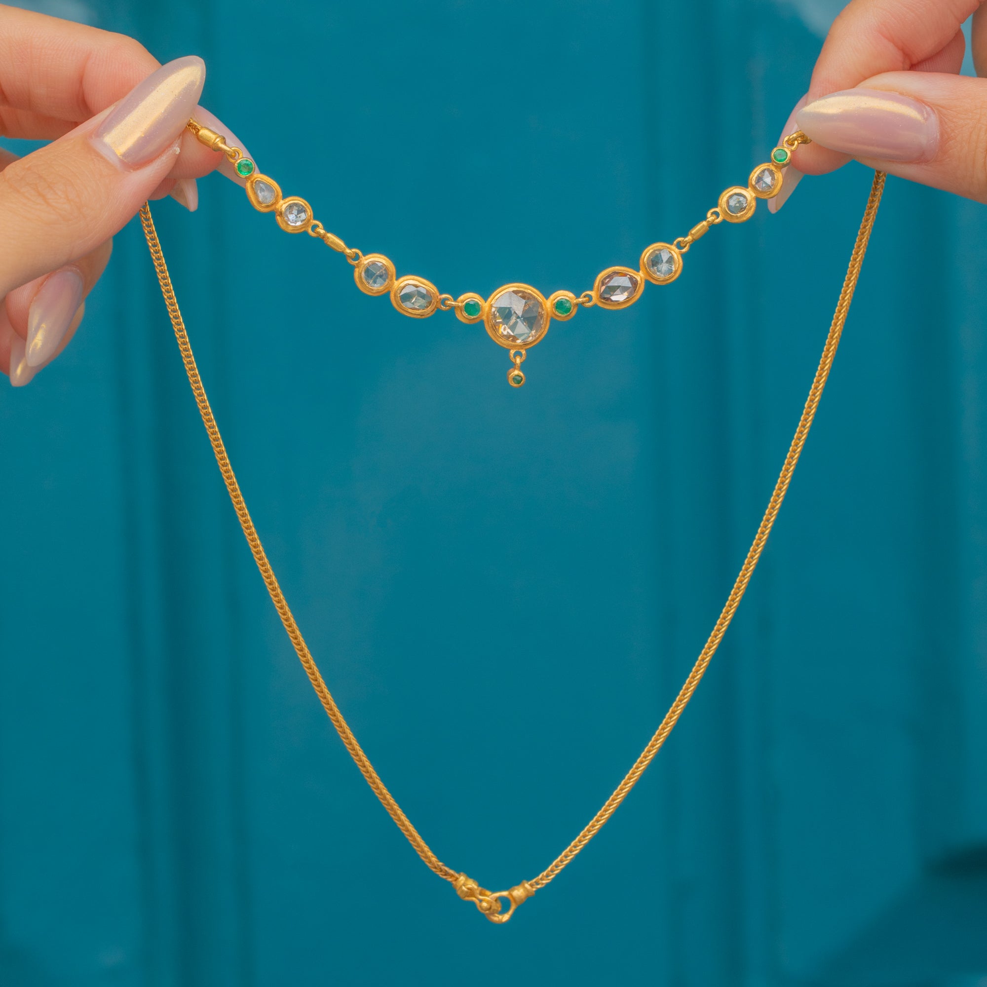 This spectacular necklace is crafted in high-carat Gold and set with a series of rose-cut Diamonds, accented by vibrant Emeralds. The design features nine uniquely shaped Diamonds, each with individual charm and antique character, ranging in hue from silvery-white to warm cognac. At the centre sits a bold 7.4mm rose-cut Diamond, flanked by a pair of darker, oval-shaped stones and finished with a delicate Diamond drop below, giving the necklace a graceful sense of movement.