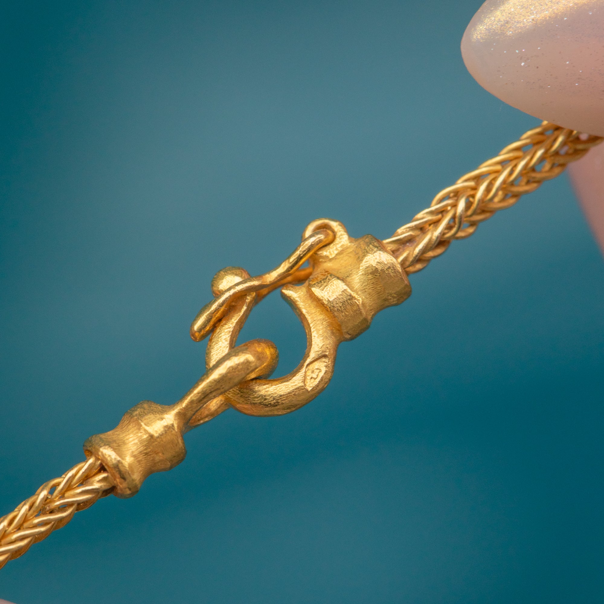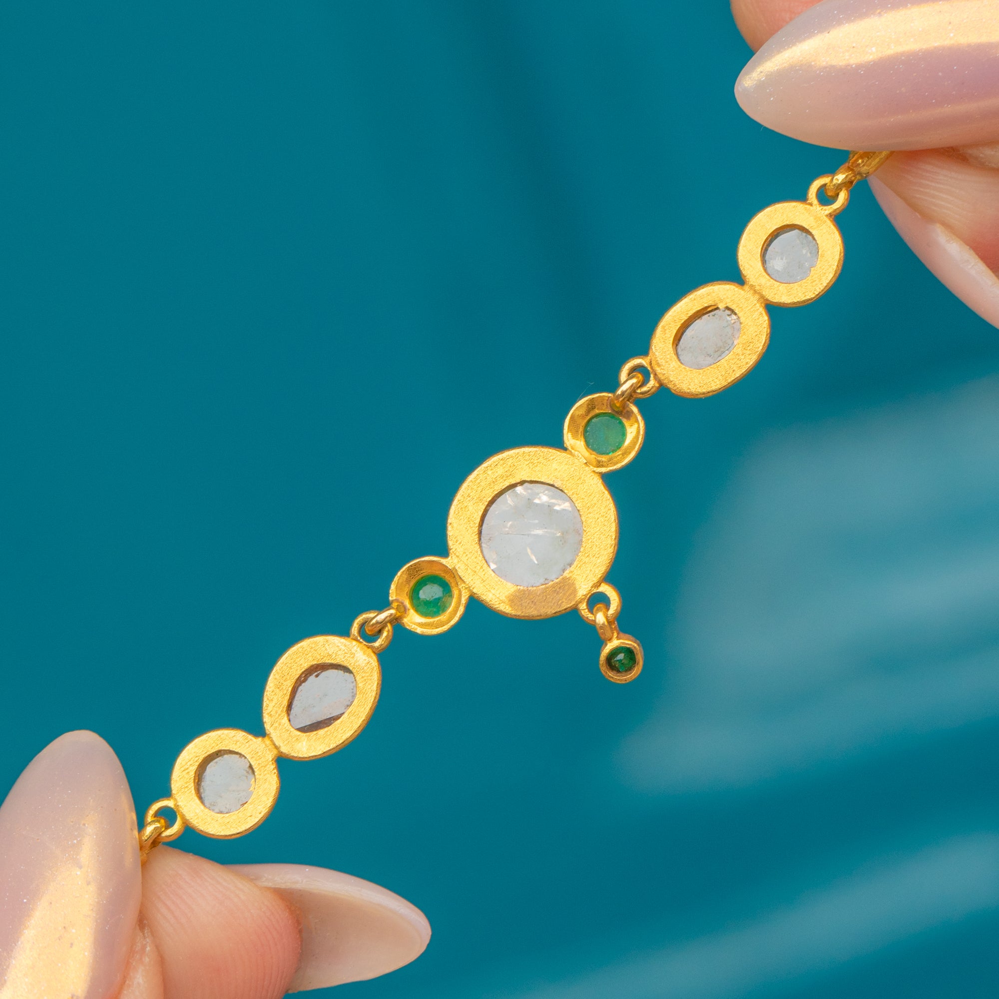 Richly coloured Emerald accents bring brightness to the piece, while the fine fox-tail chain offers supple flexibility and an elegant finish. The heavy Gold bezels contrast beautifully with the antique faceting of the Diamonds, making this necklace a true statement jewel.