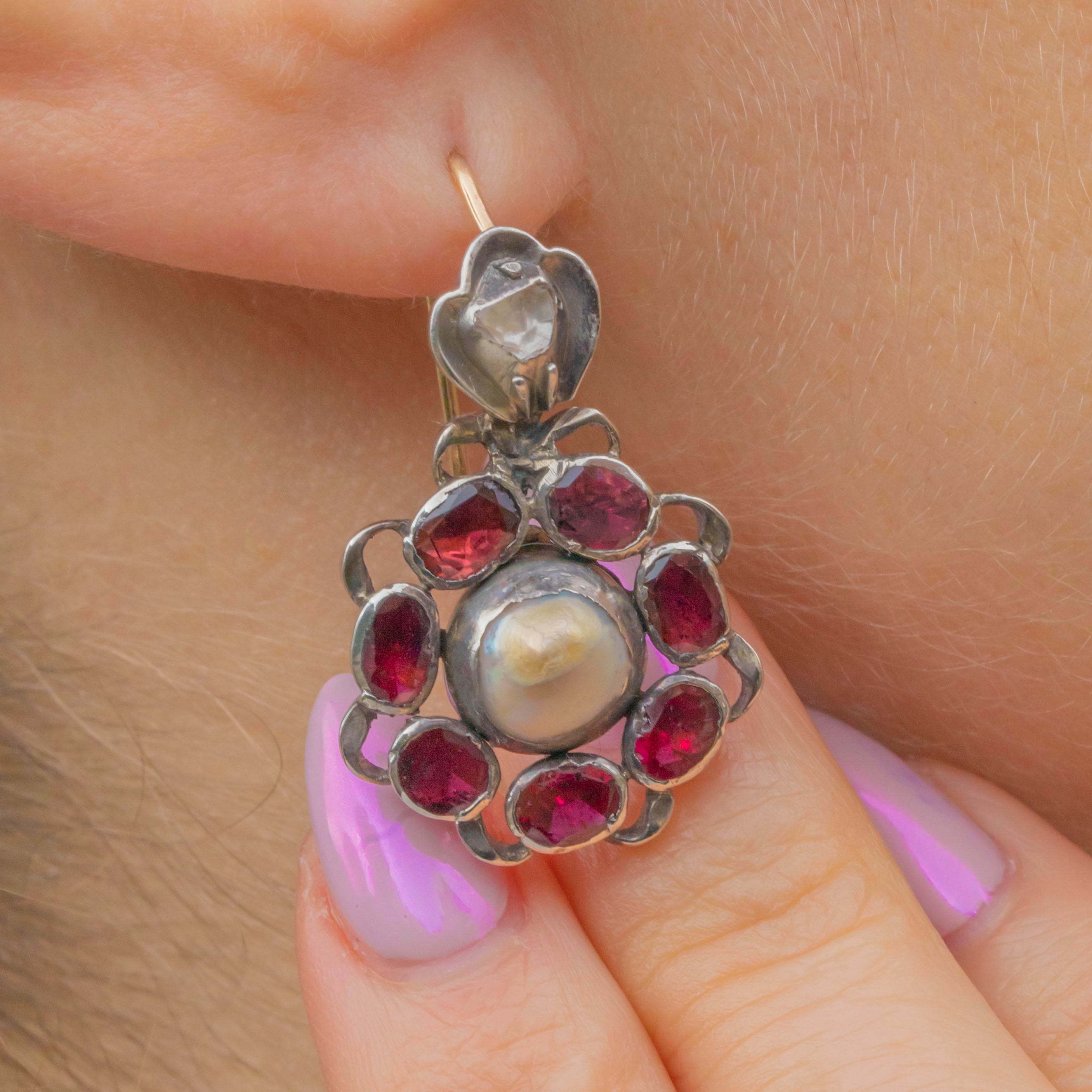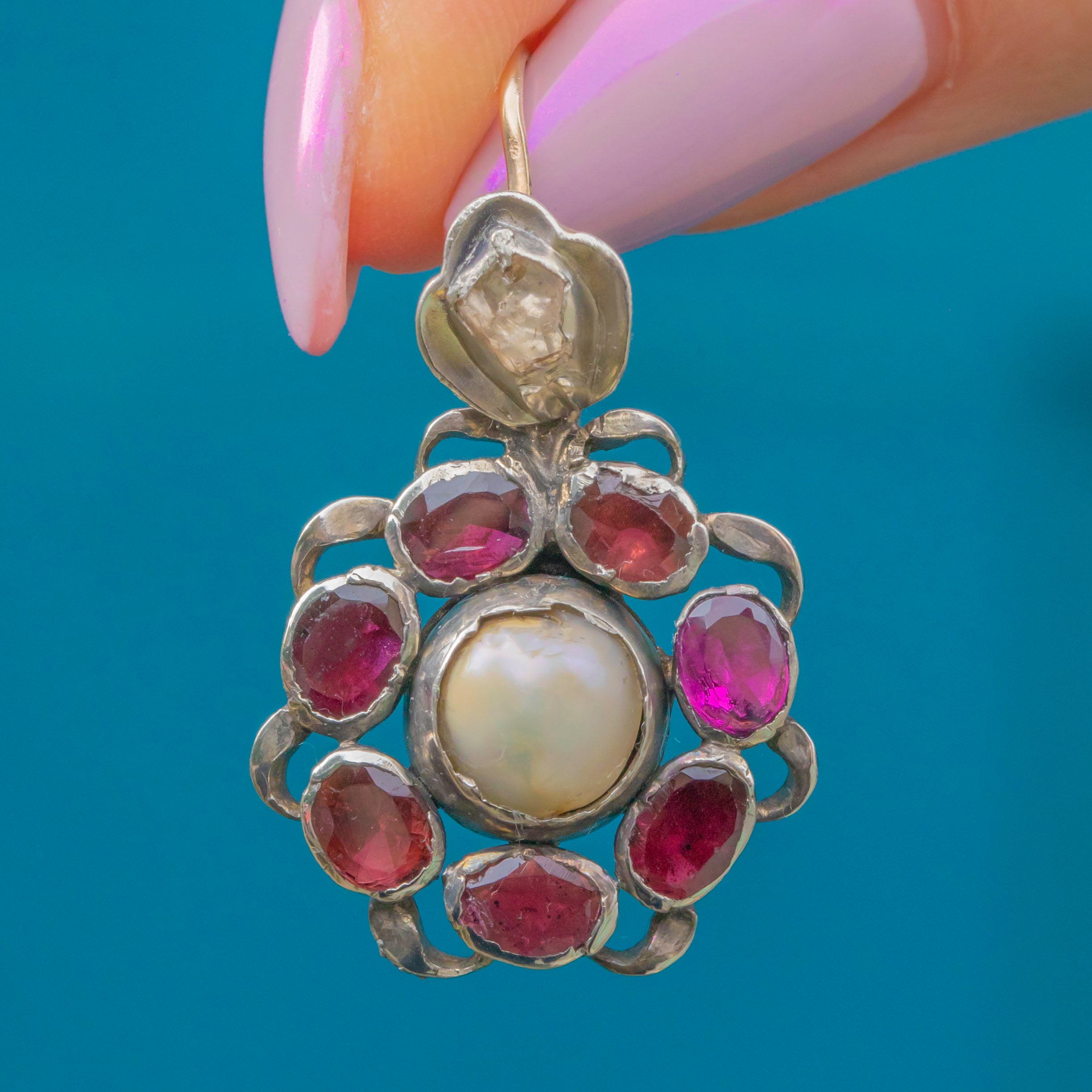 GOOD: The Pearls show visible wear and age, and the Silver displays surface wear consistent with their 18th-century origin. The Garnets and Diamonds are secure and retain strong colour and sparkle. A very rare and characterful pair of Georgian Iberian earrings.