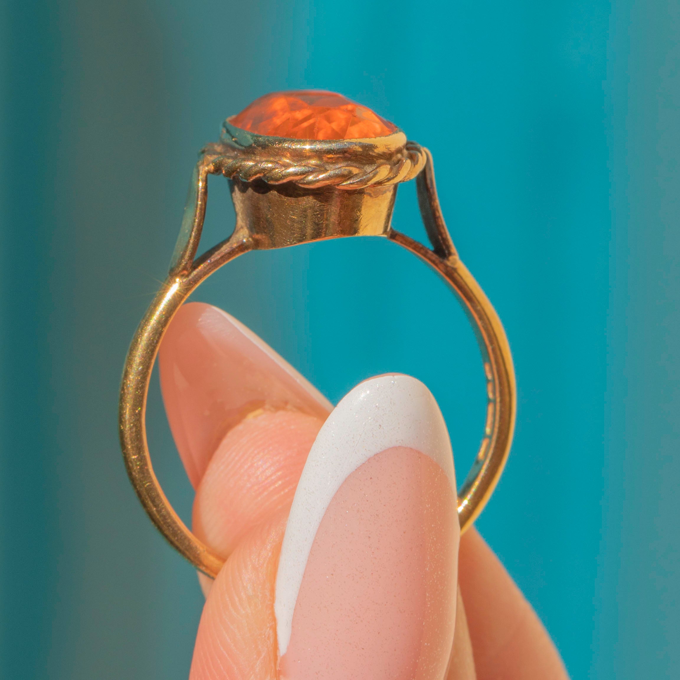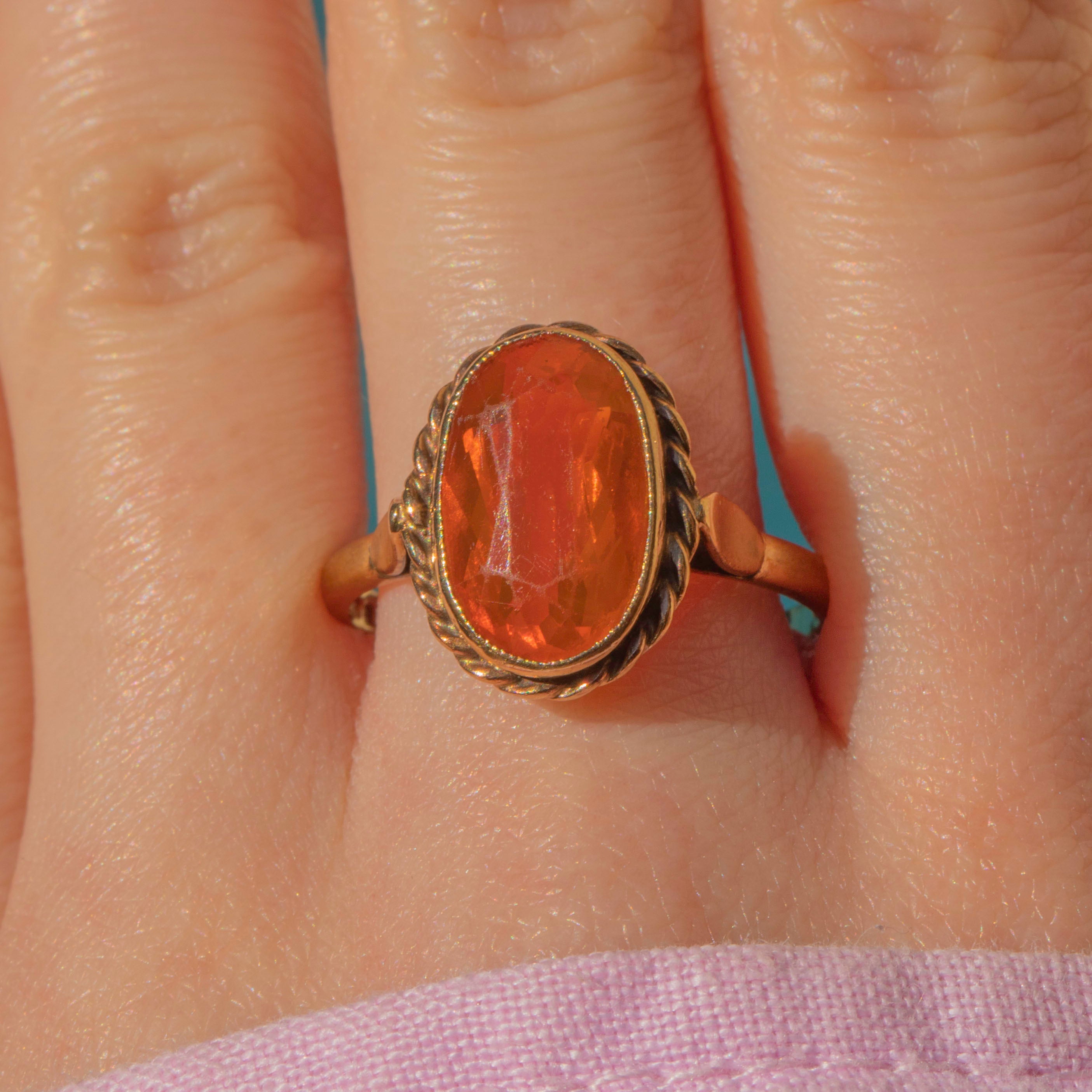 This impressive 9ct Gold Fire Opal dress ring is a feast for the eyes! A tangerine dream, her vivid fire Opal sits poised in a decorative rope border, with the light dancing across her facets.
