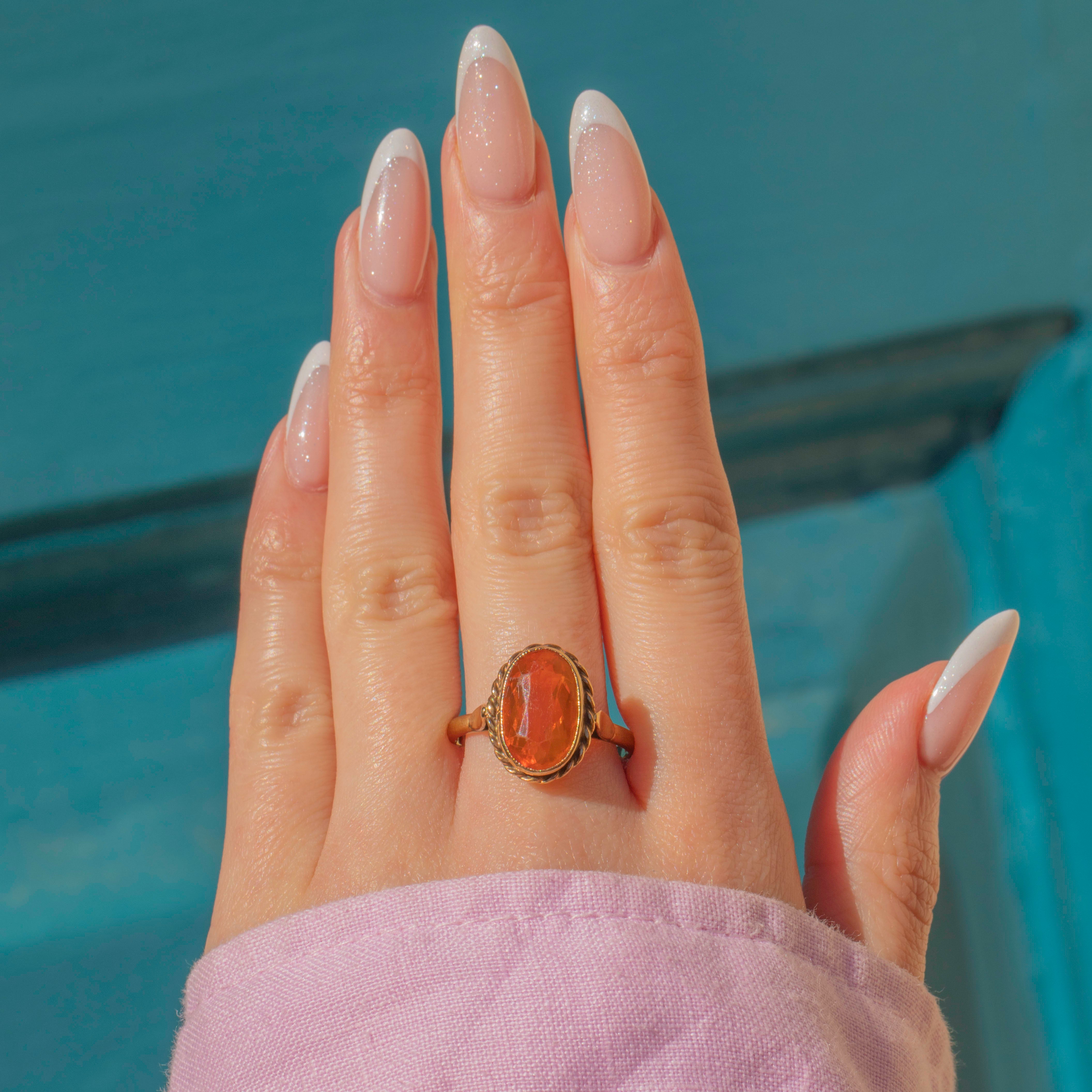 The stand-out design of this vintage Opal ring makes her a wonderful statement piece. With a blazing red-orange hue, this fire Opal cannot be missed as she adorns your hand!